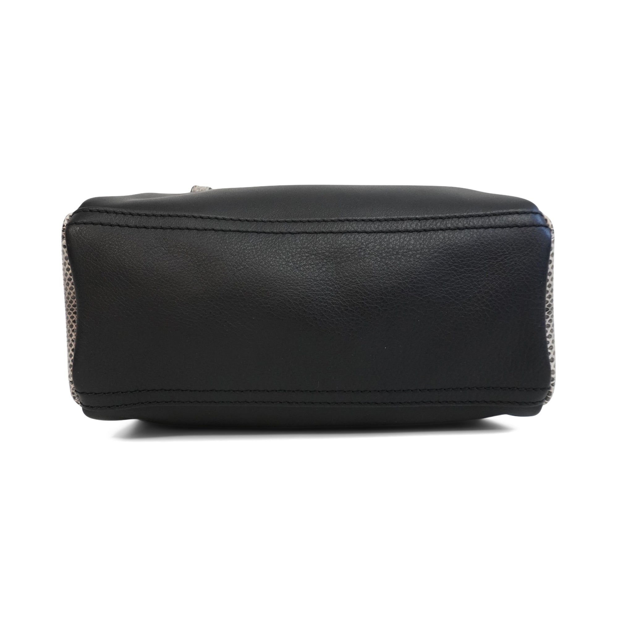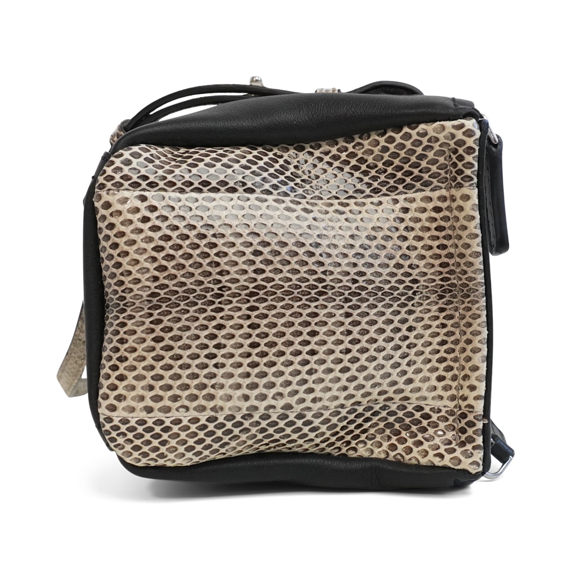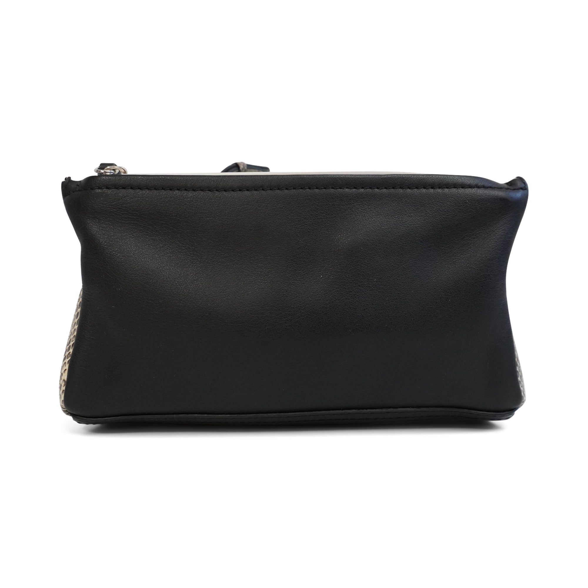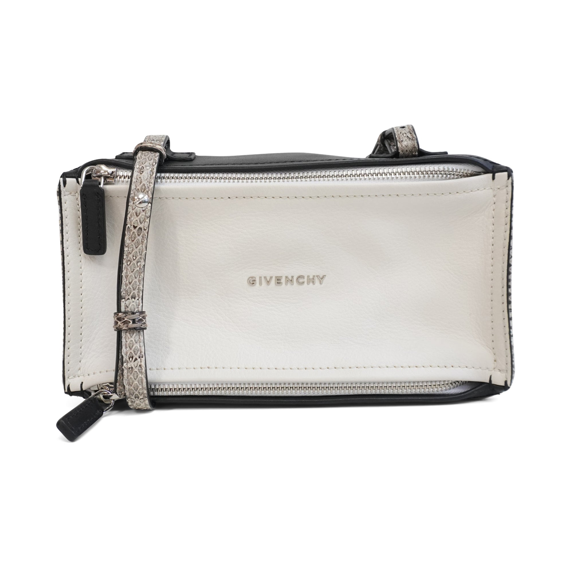 Givenchy 'Pandora Mini' crossbody bag in black and white leather with grey snakeskin side panels and adjustable crossbody strap. Features logo on the front in silver hardware with two zip pouches opening to black canvas lining with single zip pocket.