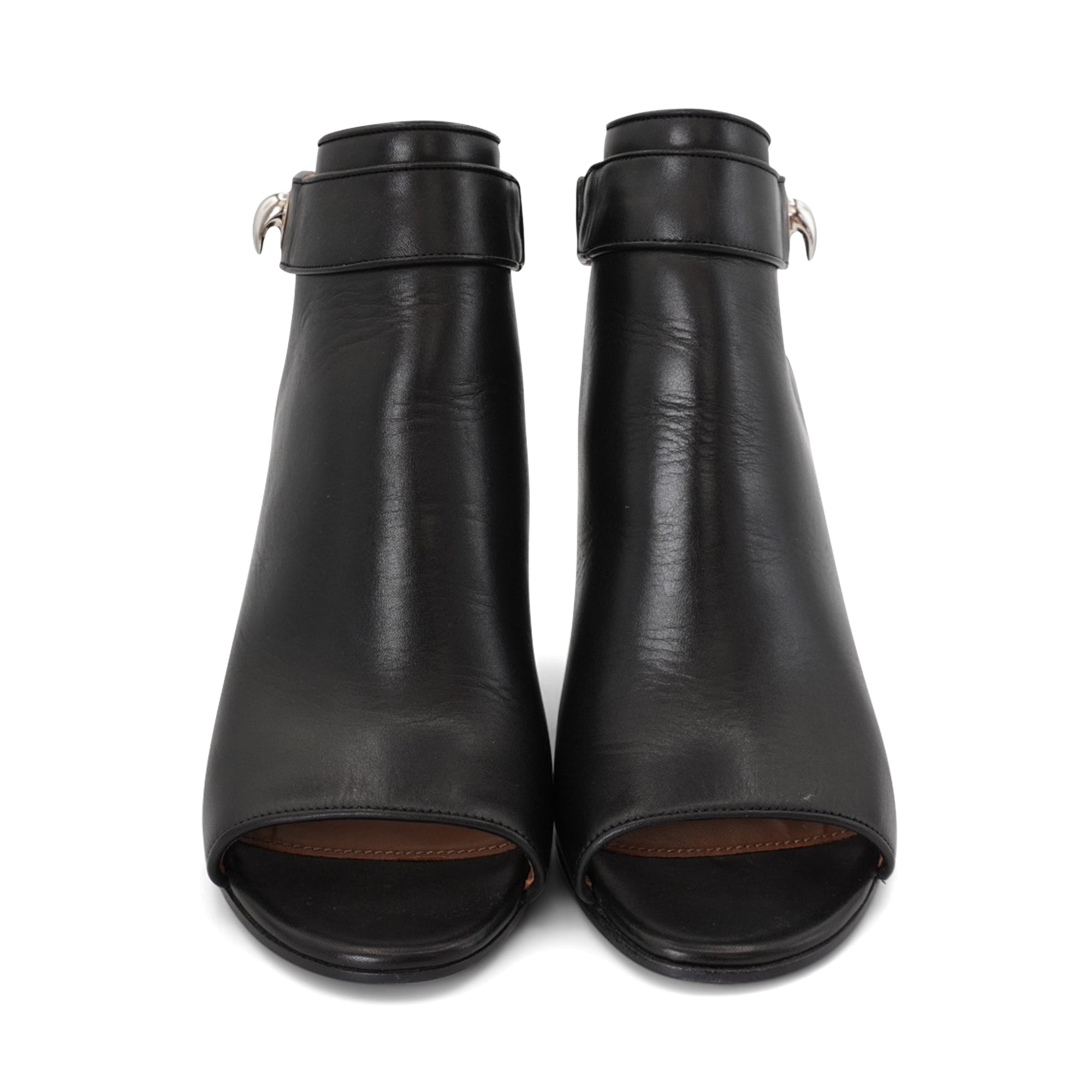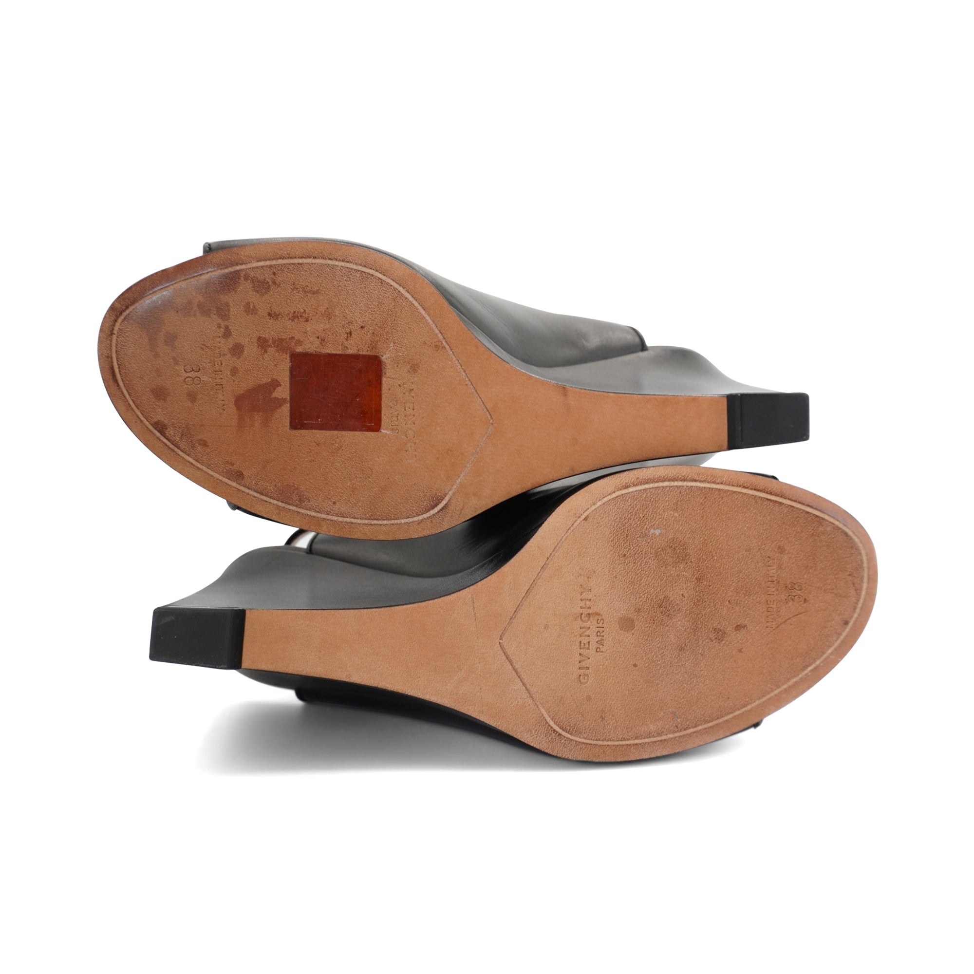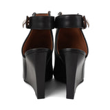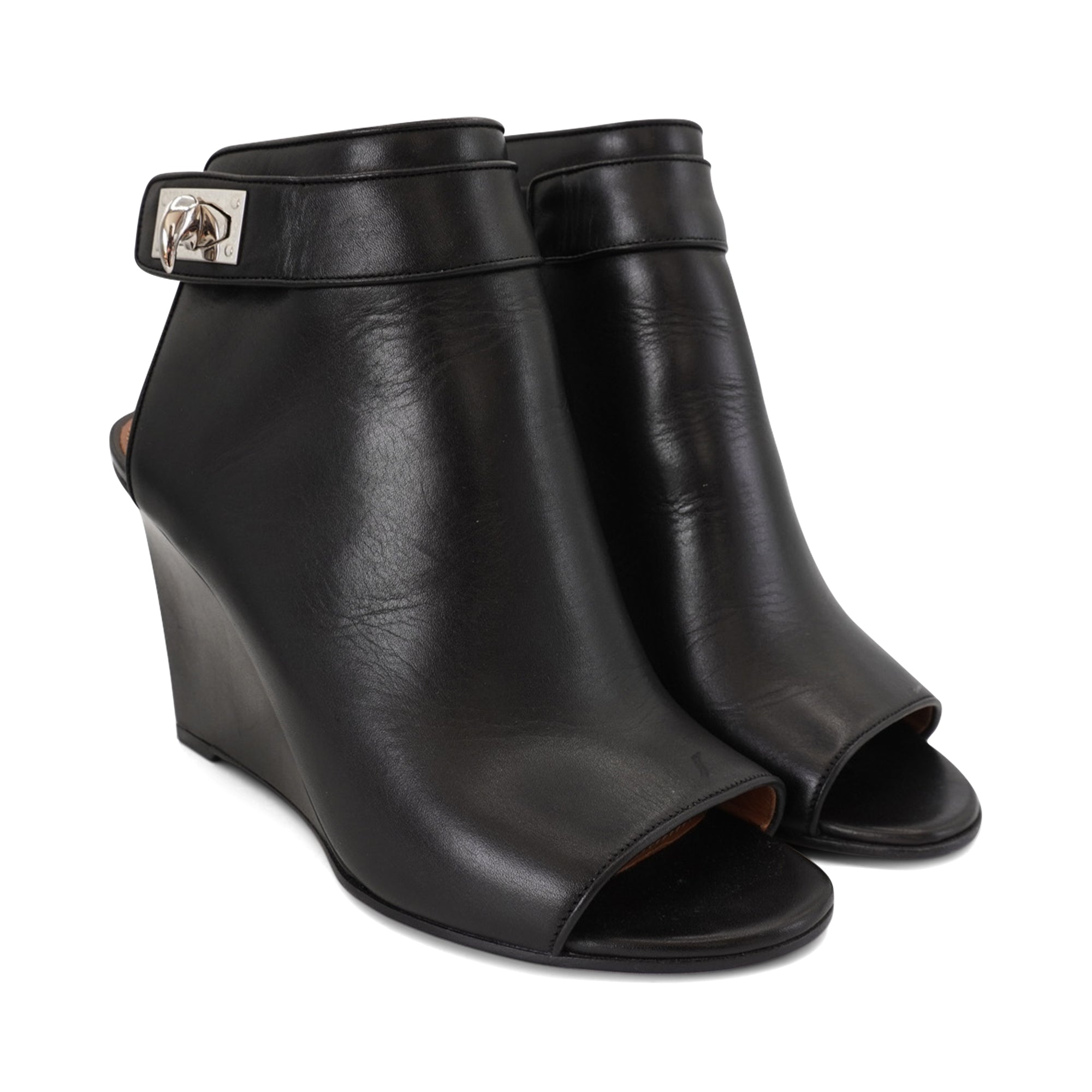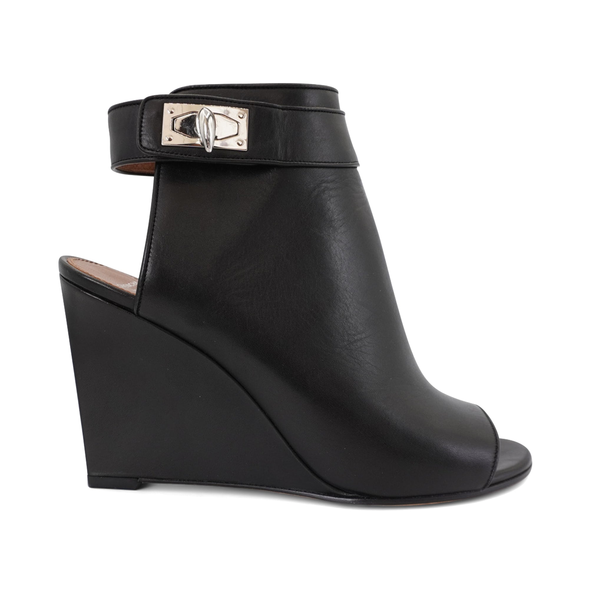 Givenchy peep-toe wedge heels in smooth black leather with silver 'Sharktooth' turnlock closure on the ankle strap.