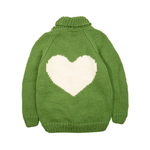 Gogo 'Heart' oversized cardigan in thick knit green wool with shawl collar, front patch pockets and white heart on the chest and back. Featuring white ceramic oversized buttons.
