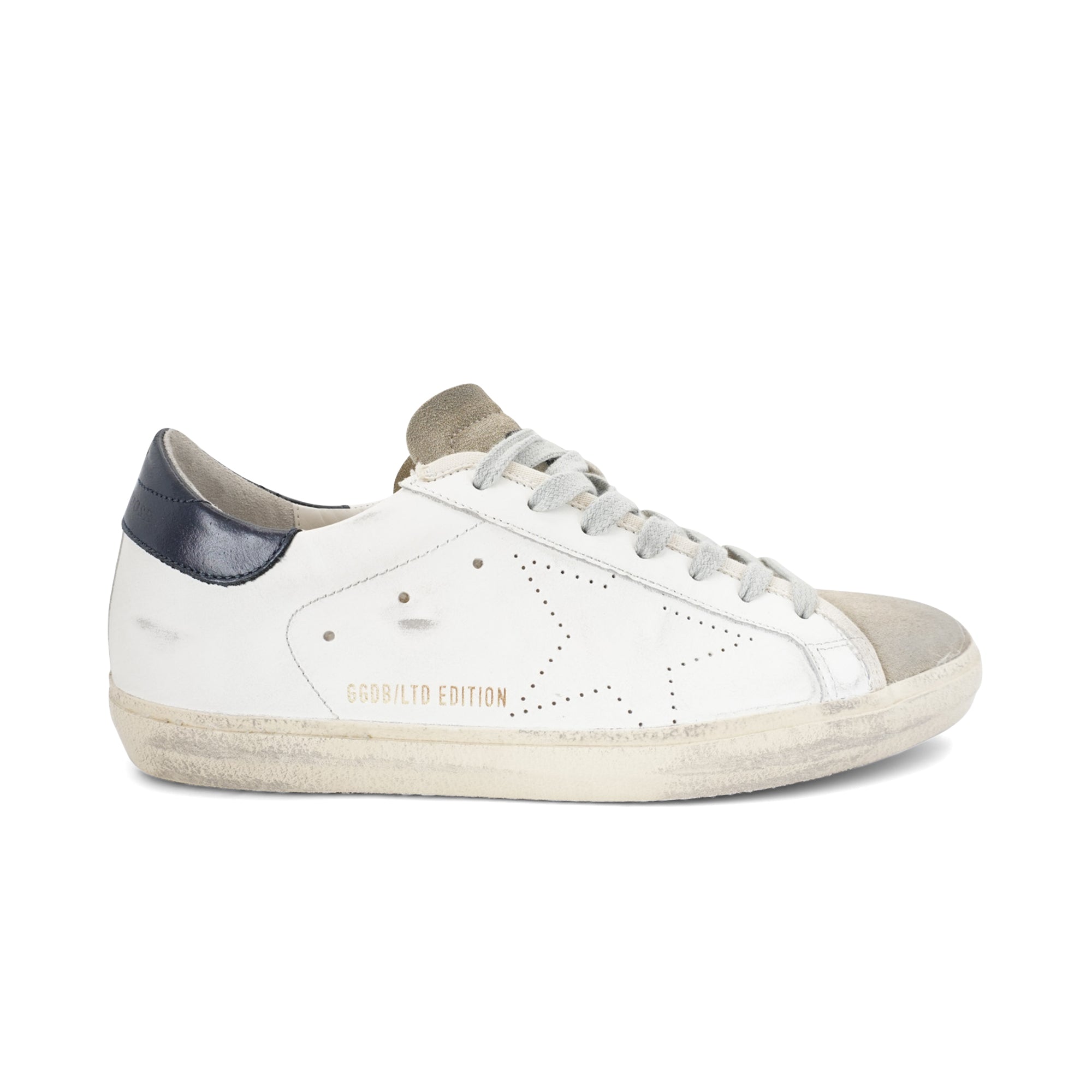Golden Goose 'Super Star' low top sneakers in pre-distressed white leather and grey suede with navy leather heel tab and perforated star.