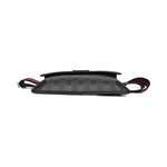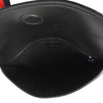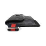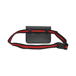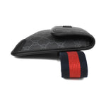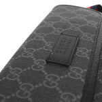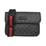 Gucci waist bag in black and grey monogram-coated canvas with black leather piping. Features front flap magnetic closure,  red and navy canvas racing stripe canvas snap buckle closure.
