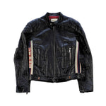 Gucci Moto Black crinkled leather jacket with padded quilted shoulders, elbows and a cream, navy and red signature logo racing stripe across the side. Features a front zip and neck snap button closure in silver hardware, zip pockets and a belt buckle on the waistband. The jacket has a red silk lining.