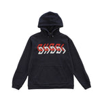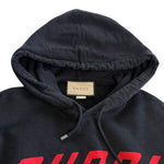 Gucci 'Mirror' hoodie swearer in black cotton with a red and white graphic logo on the chest, an open pocket, and ribbed cuffs.