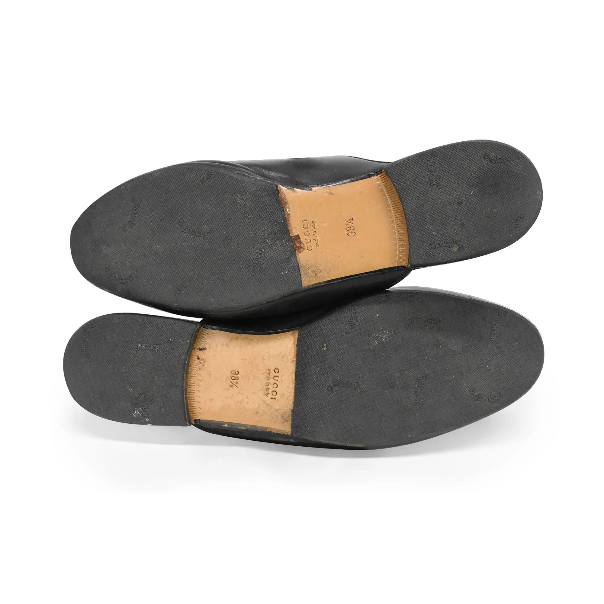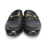Gucci 'Princetown' Slip-one Mules in black leather with a rounded toe and a gold-toned horse-bit detail. Features a Vibram resole.