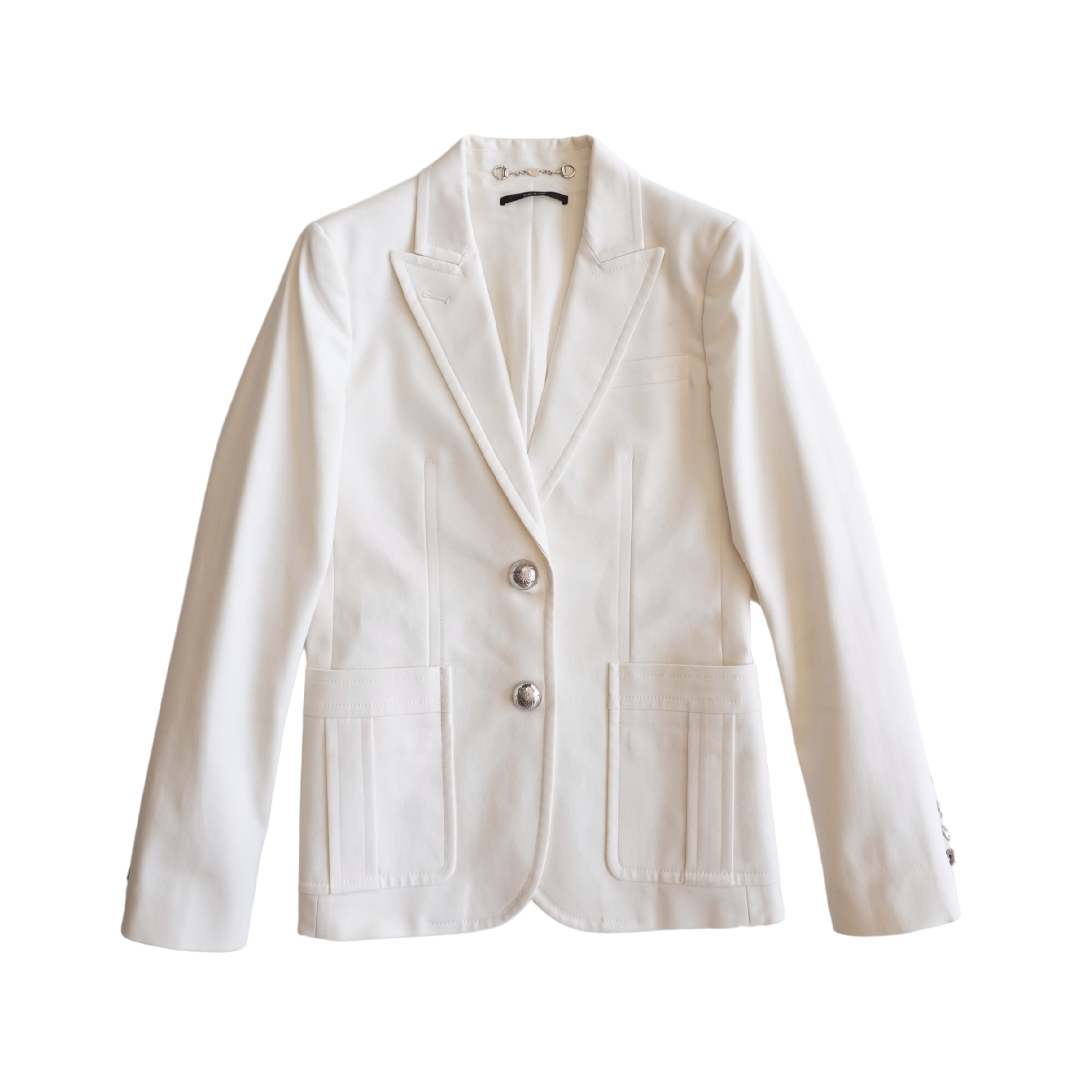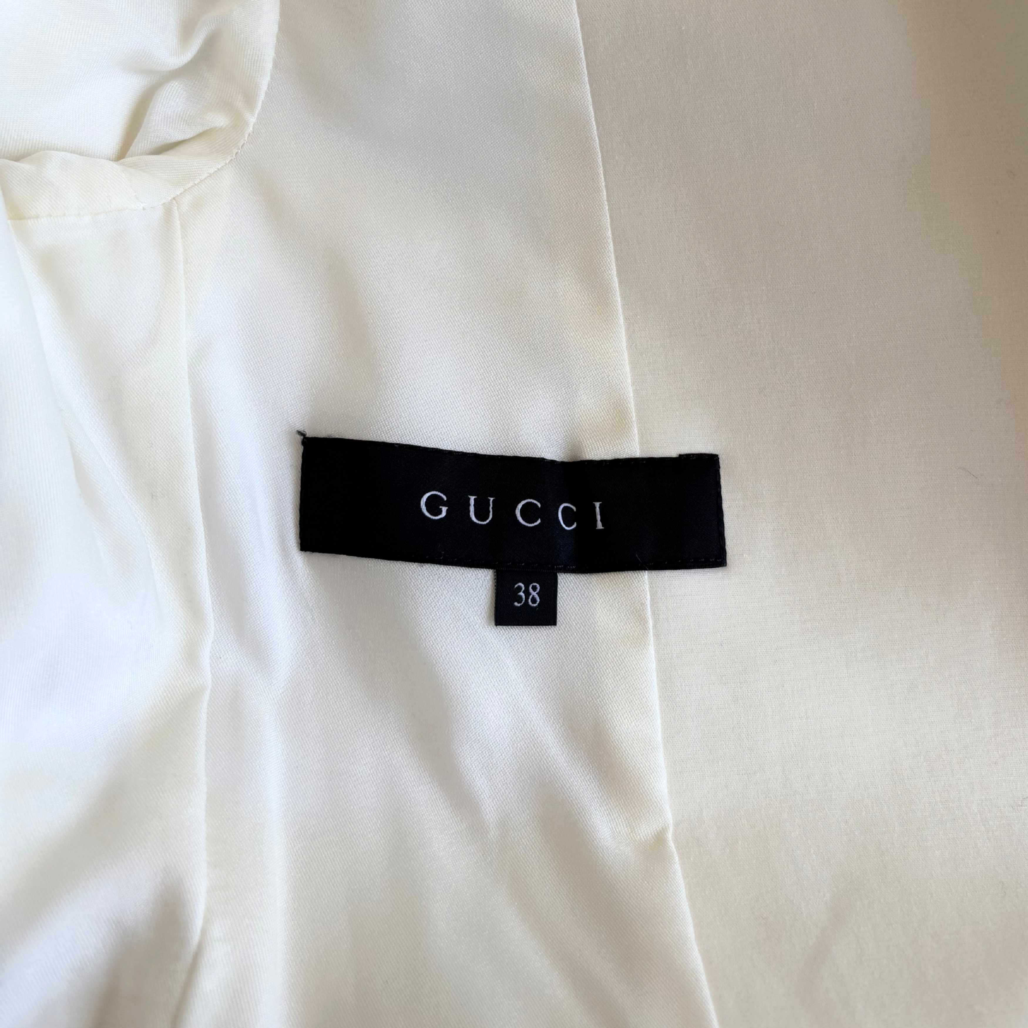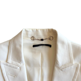 Gucci blazer jacket in cream cotton with a single breasted button closure with ornate silver button hardware, front slip pockets, and a peak lapel collar.