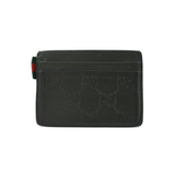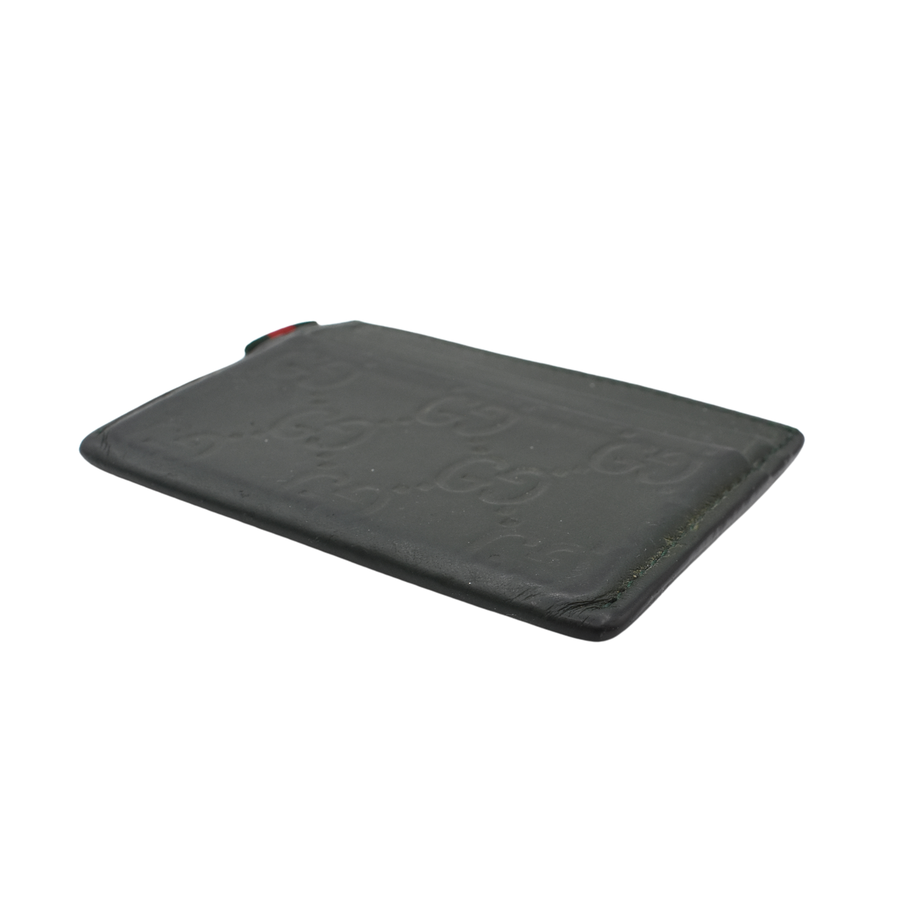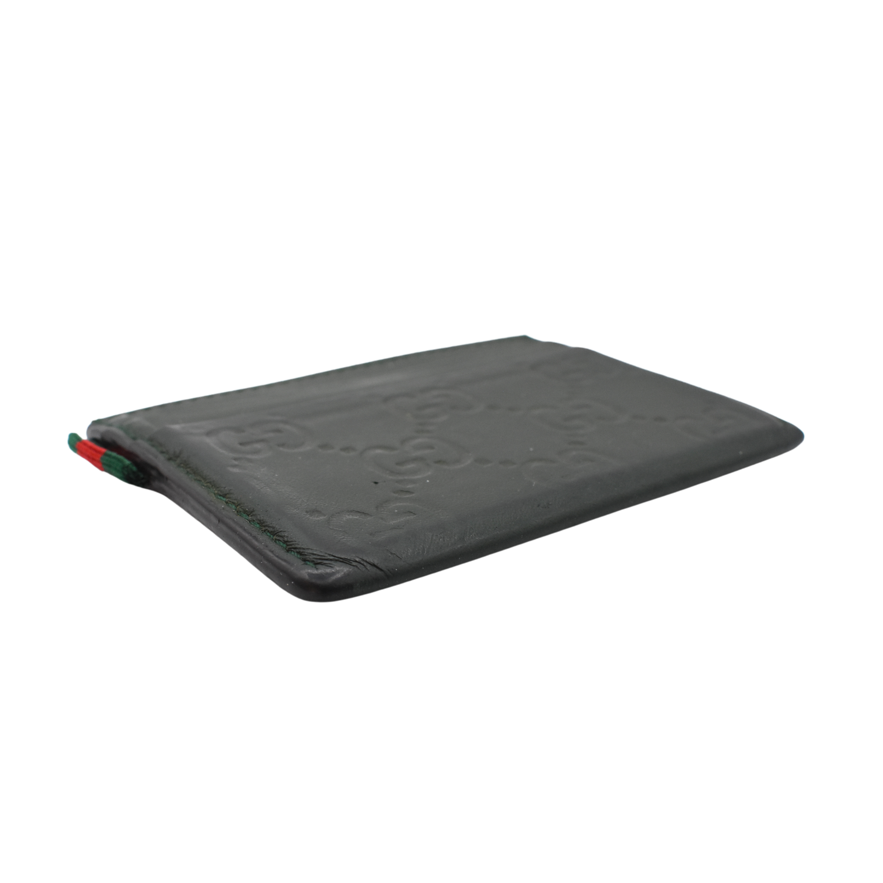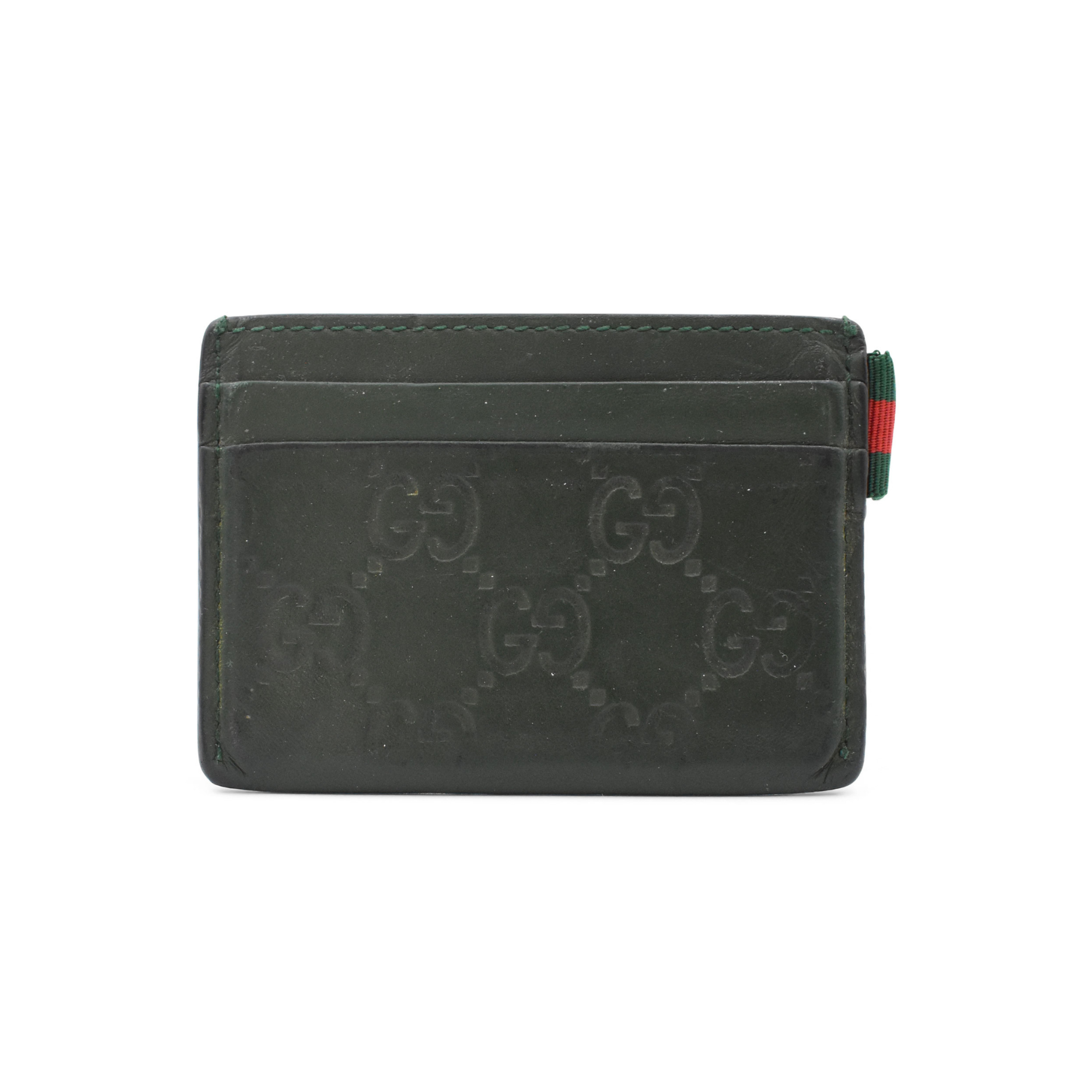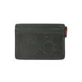 Gucci 'Guccissima' card holder in green logo monogram embossed leather with multiple card slots and canvas racing stripe tab on the side.