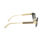 Gucci cat eye sunglasses with gold metal frames with black acetate corner details. Features red and green racing stripes along the front corners and arms and white acetate on the ends of the arms.