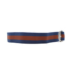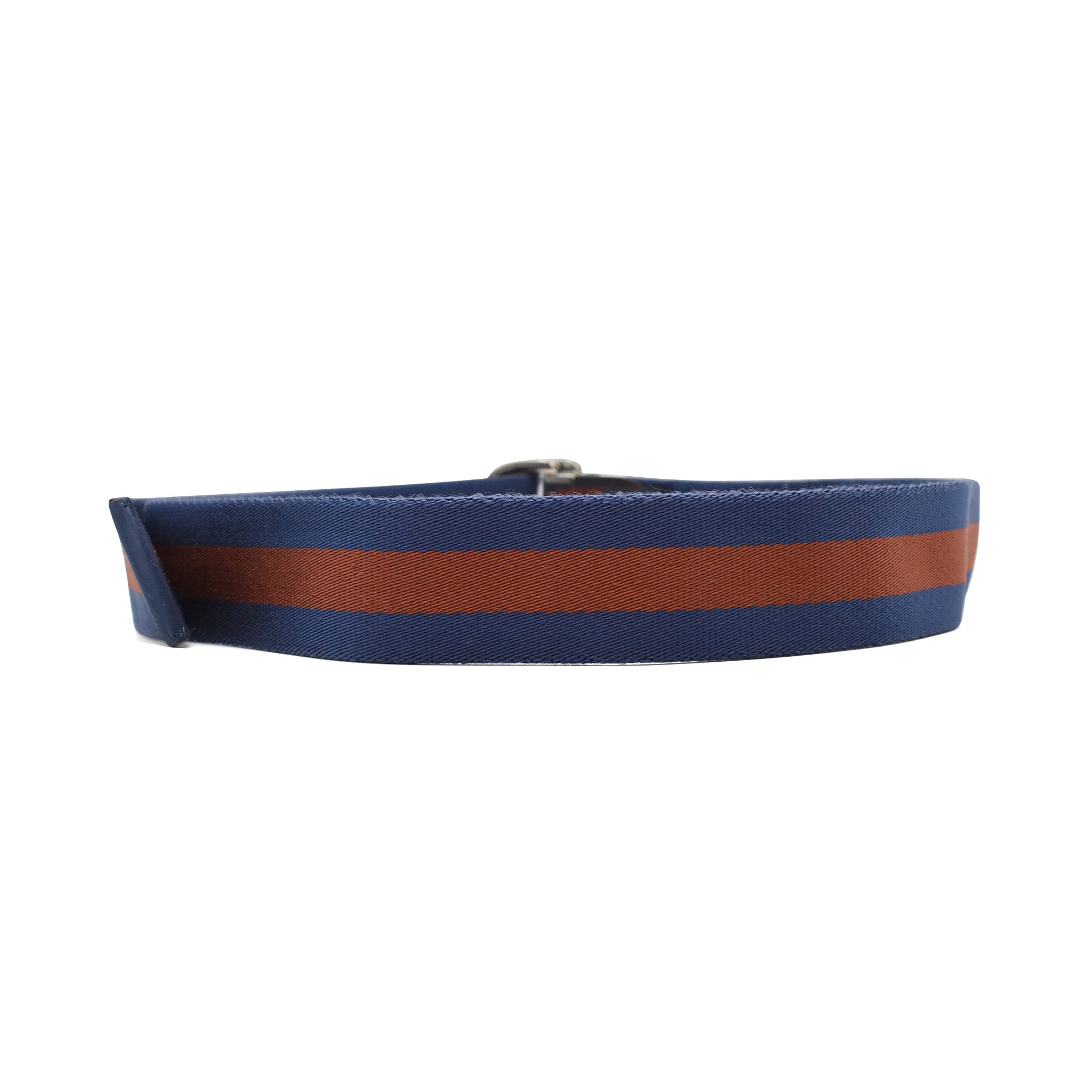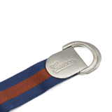 Gucci belt in blue and rust racing stripe webbing with silver D-ring buckle featuring engraved cursive logo.