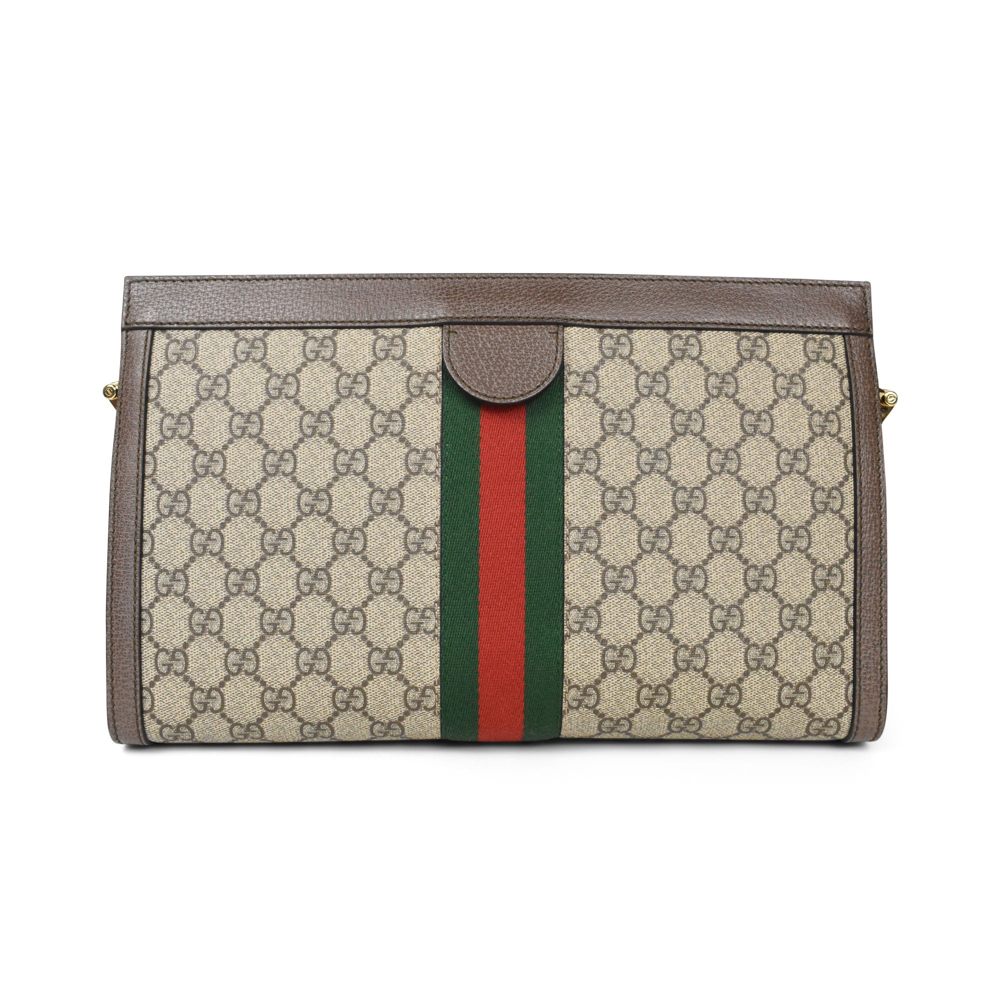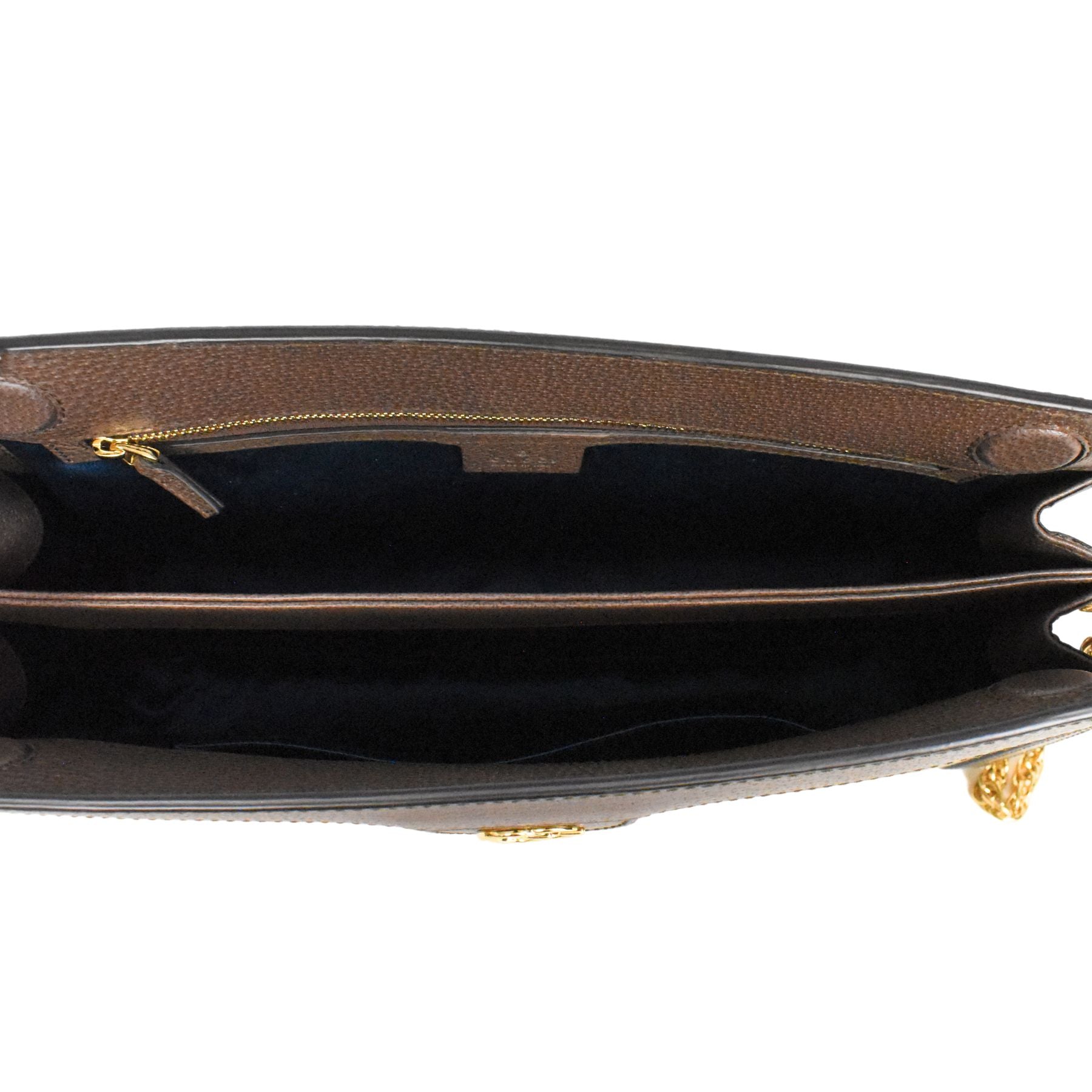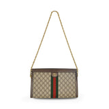 Gucci 'GG Supreme Ophidia' shoulder bag in brown logo monogram coated canvas. Features brown leather trim, a green and red canvas racing stripe down the centre, 'GG' gold hardware logo on the front, gold hardware chain strap, and a magnetic closure. The interior is blue satin lined with 2 main compartments, a zip pocket, and a slip pocket.