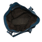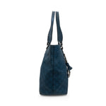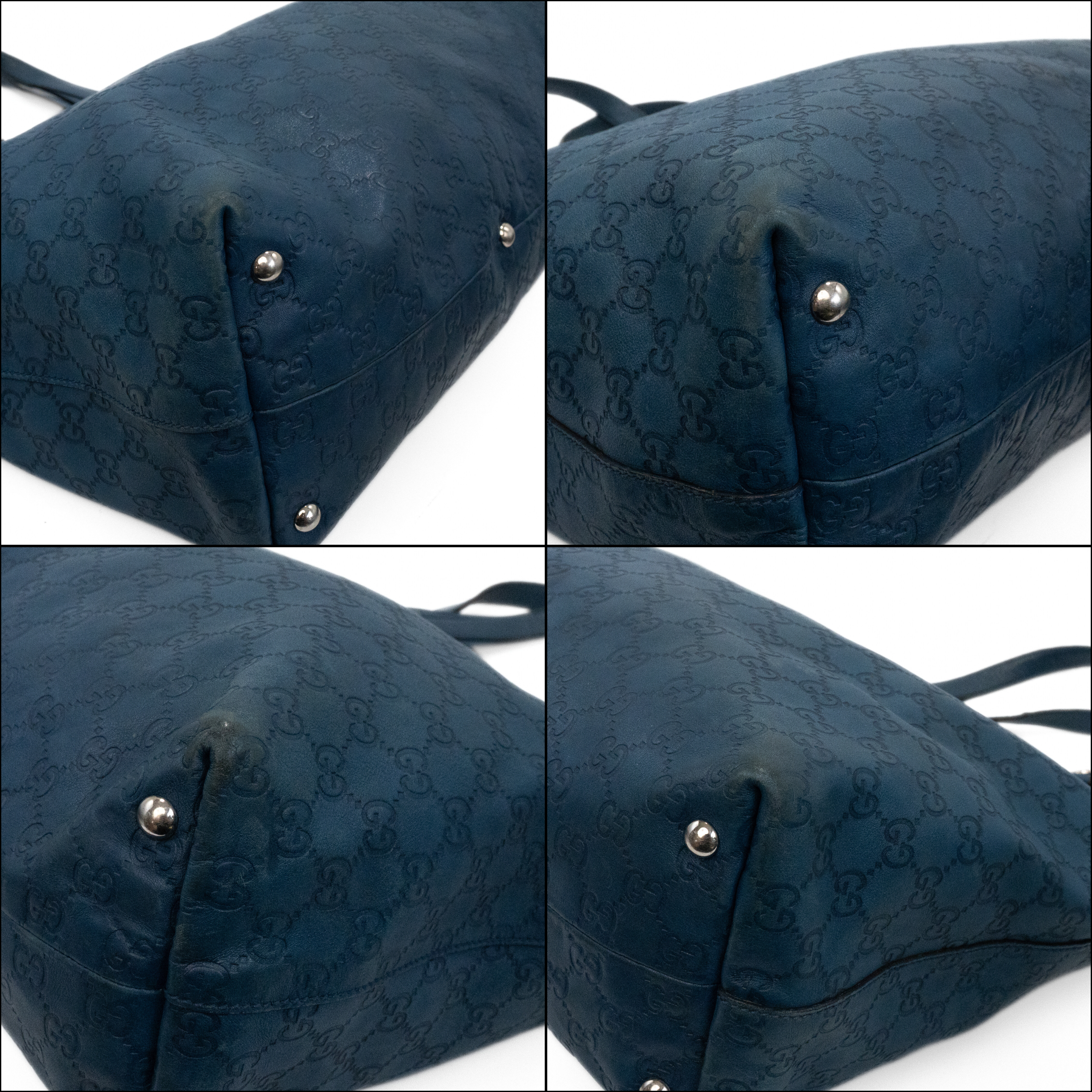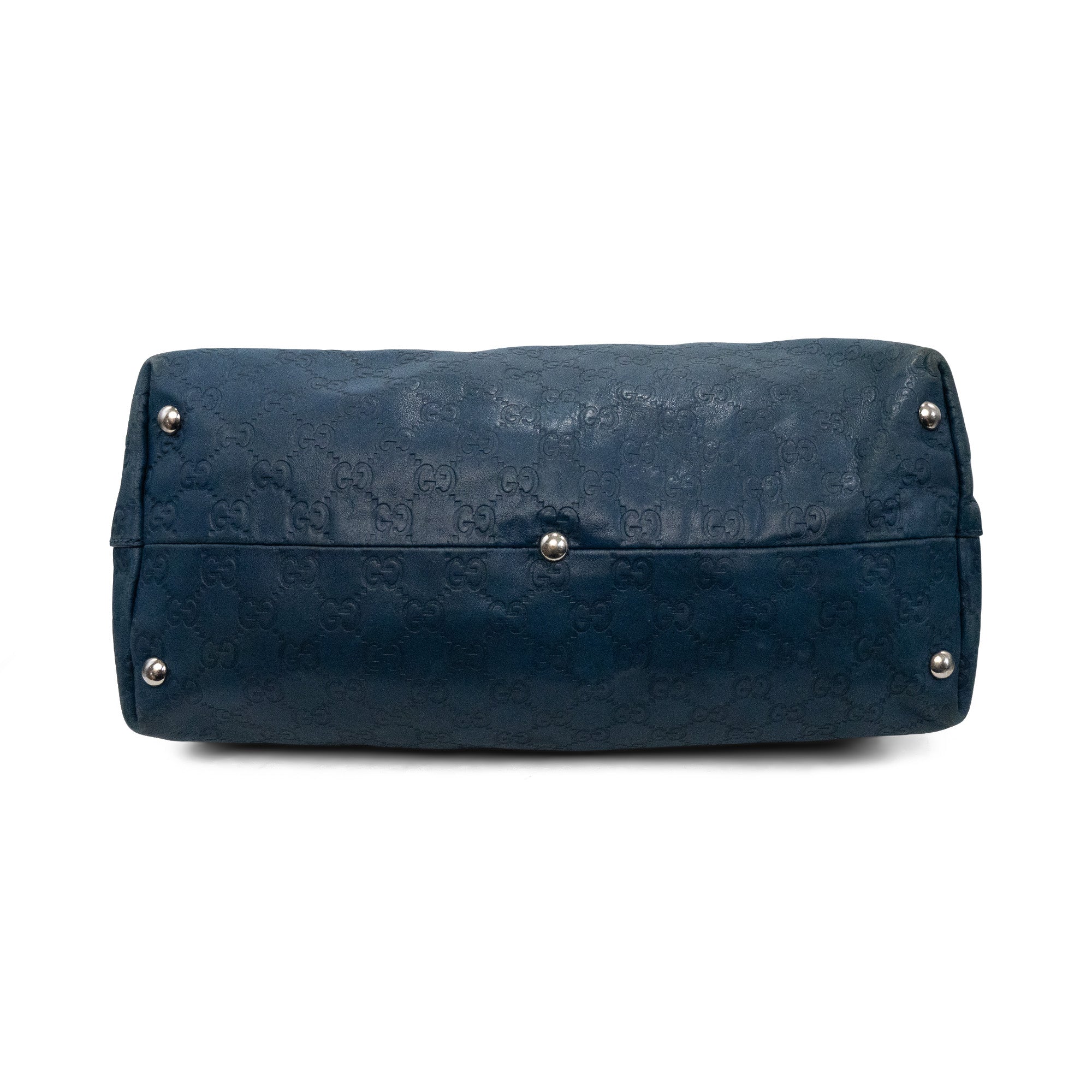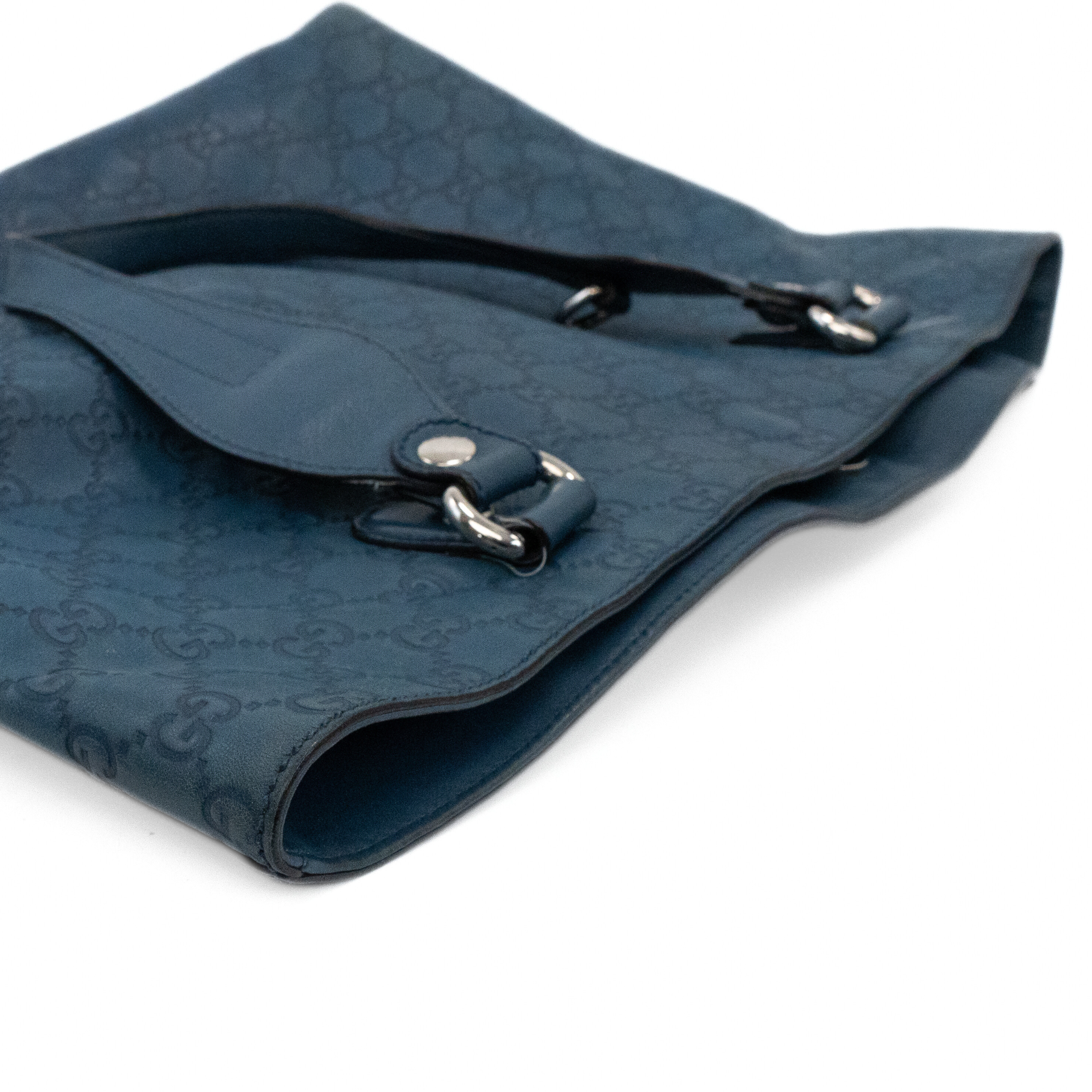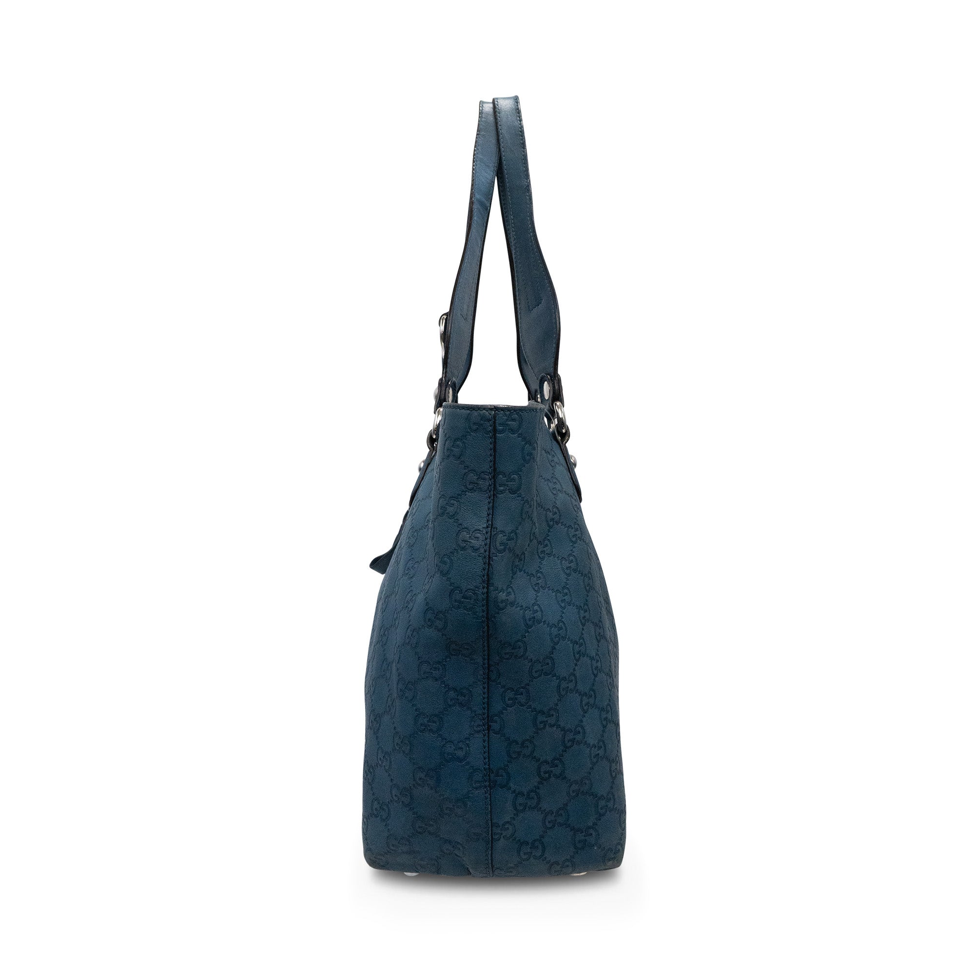 Gucci 'Icon Bit' tote bag in blue monogram Guccissima embossed leather with dual flat top handles with D-ring features and a large horsebit bag charm in silver hardware. Features a snap button closure opening to brown canvas lining two slip pockets and a zip pocket.