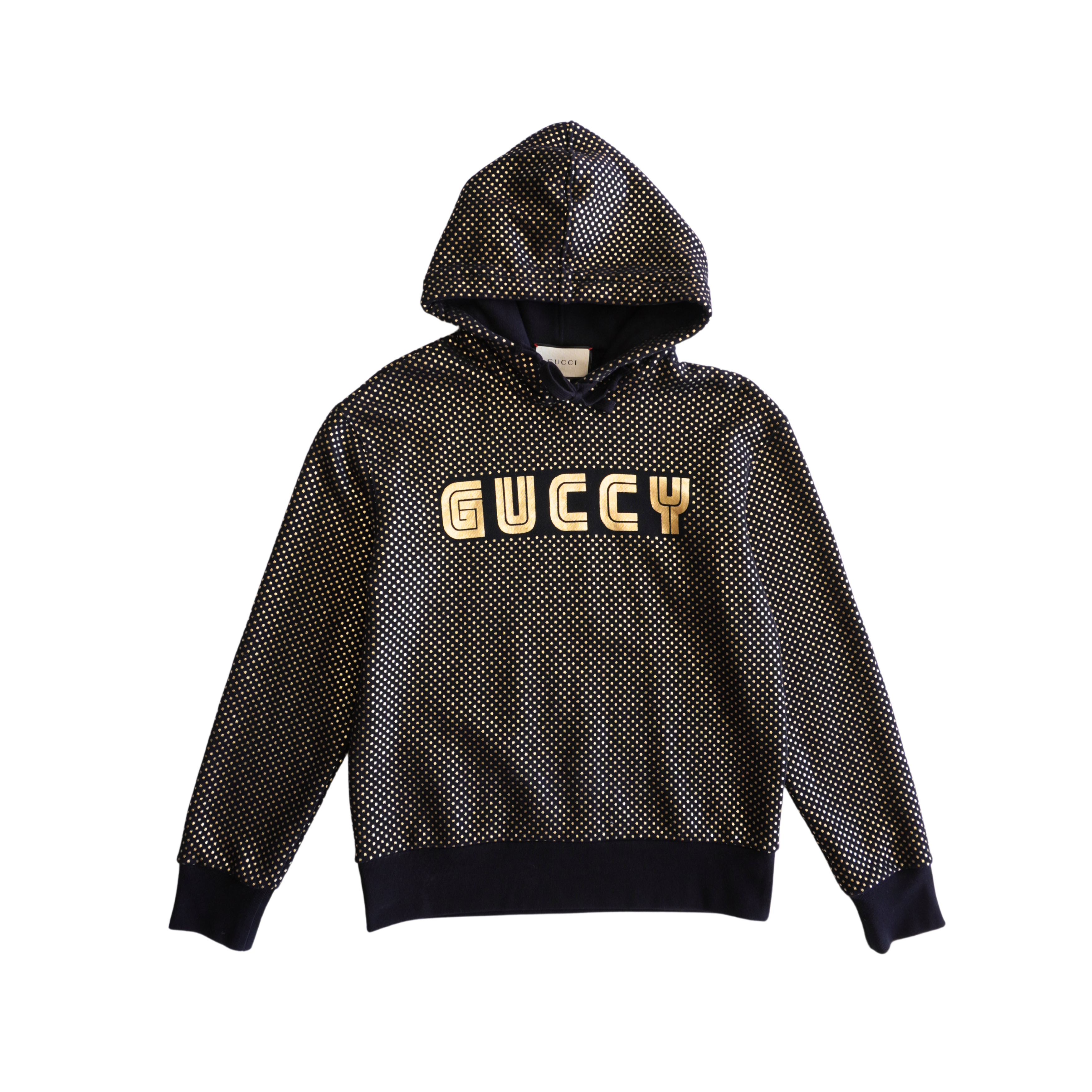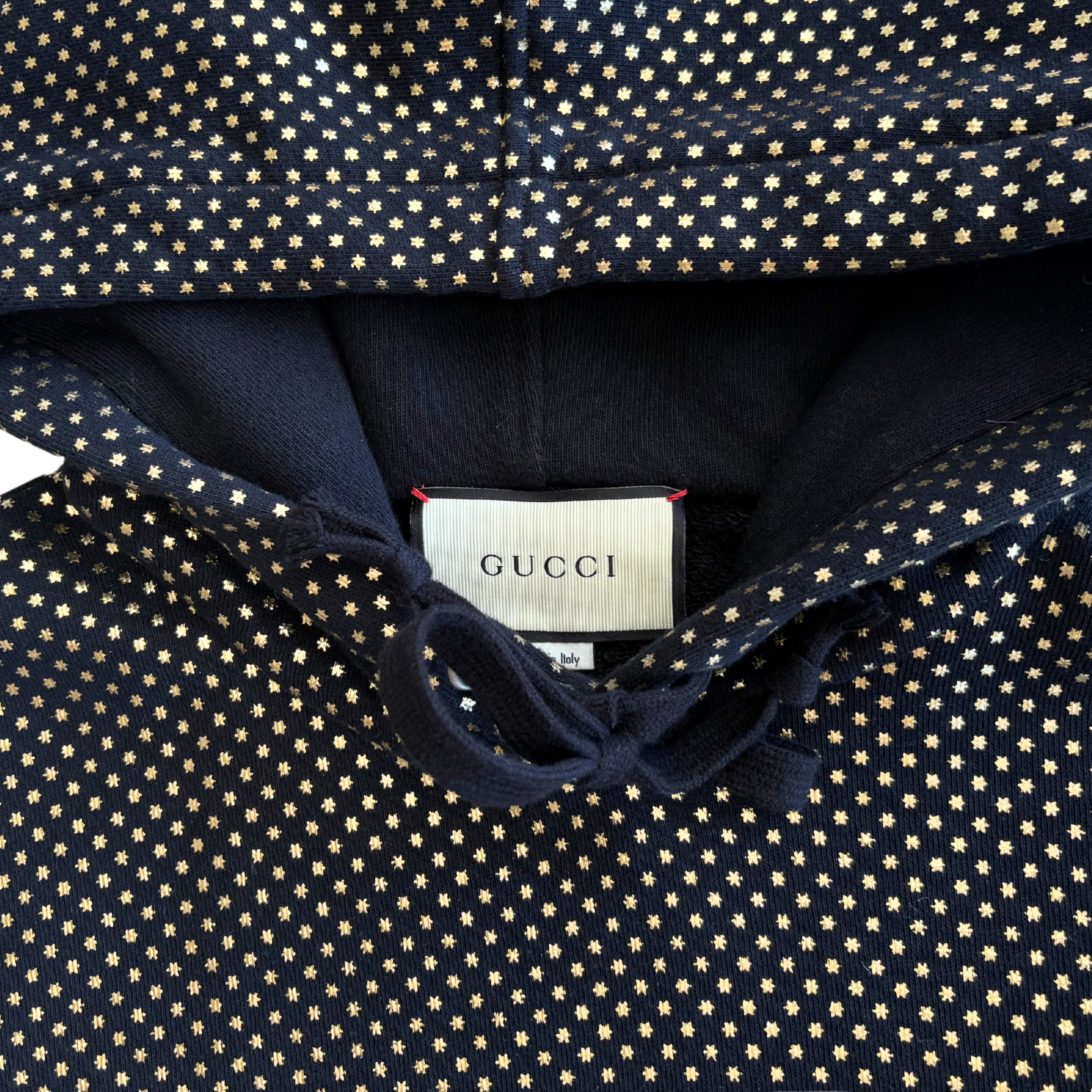 Gucci hoodie in black cotton with all-over metallic gold foil stars, a vintage 'GUCCY' logo across the chest, and a drawstring hood.