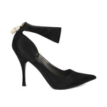 Gucci by Tom Ford pumps in black satin with a mary jane ankle strap, a back zip opening with a large gold rhinestone encrusted pull tab, and a pointed toe.