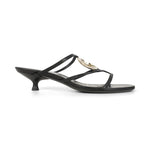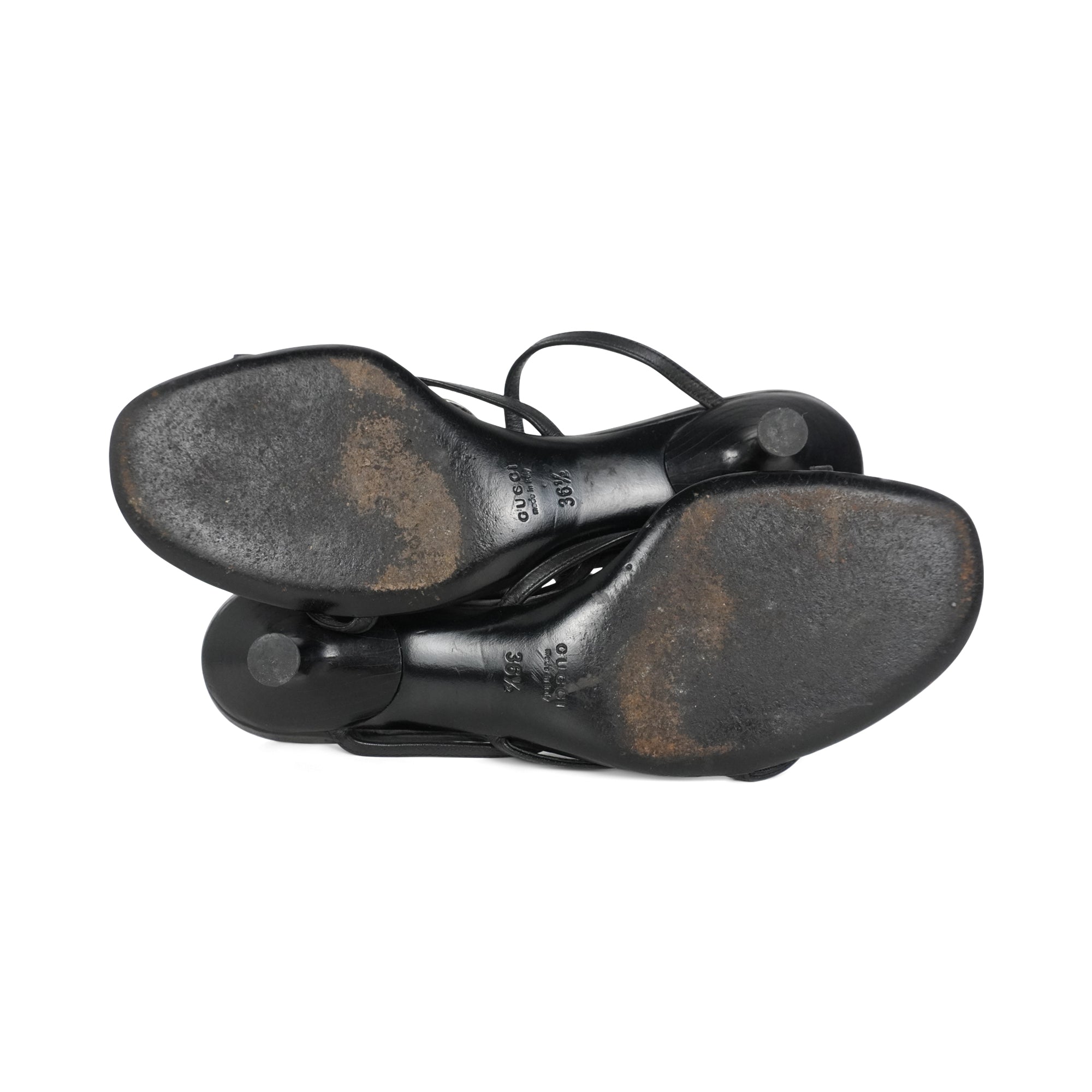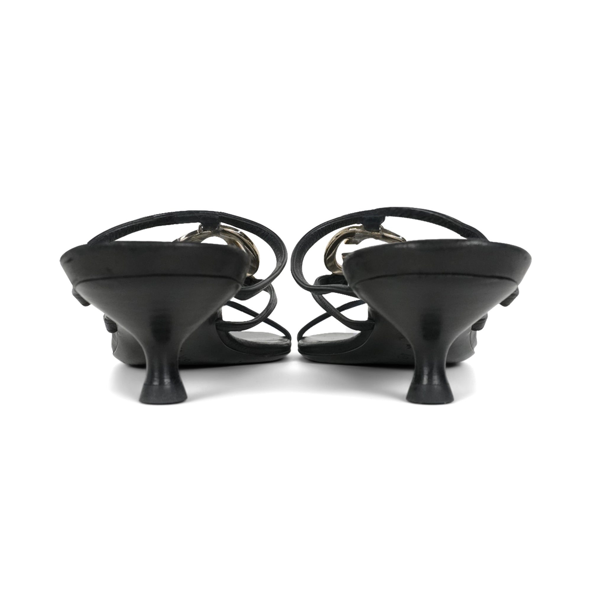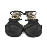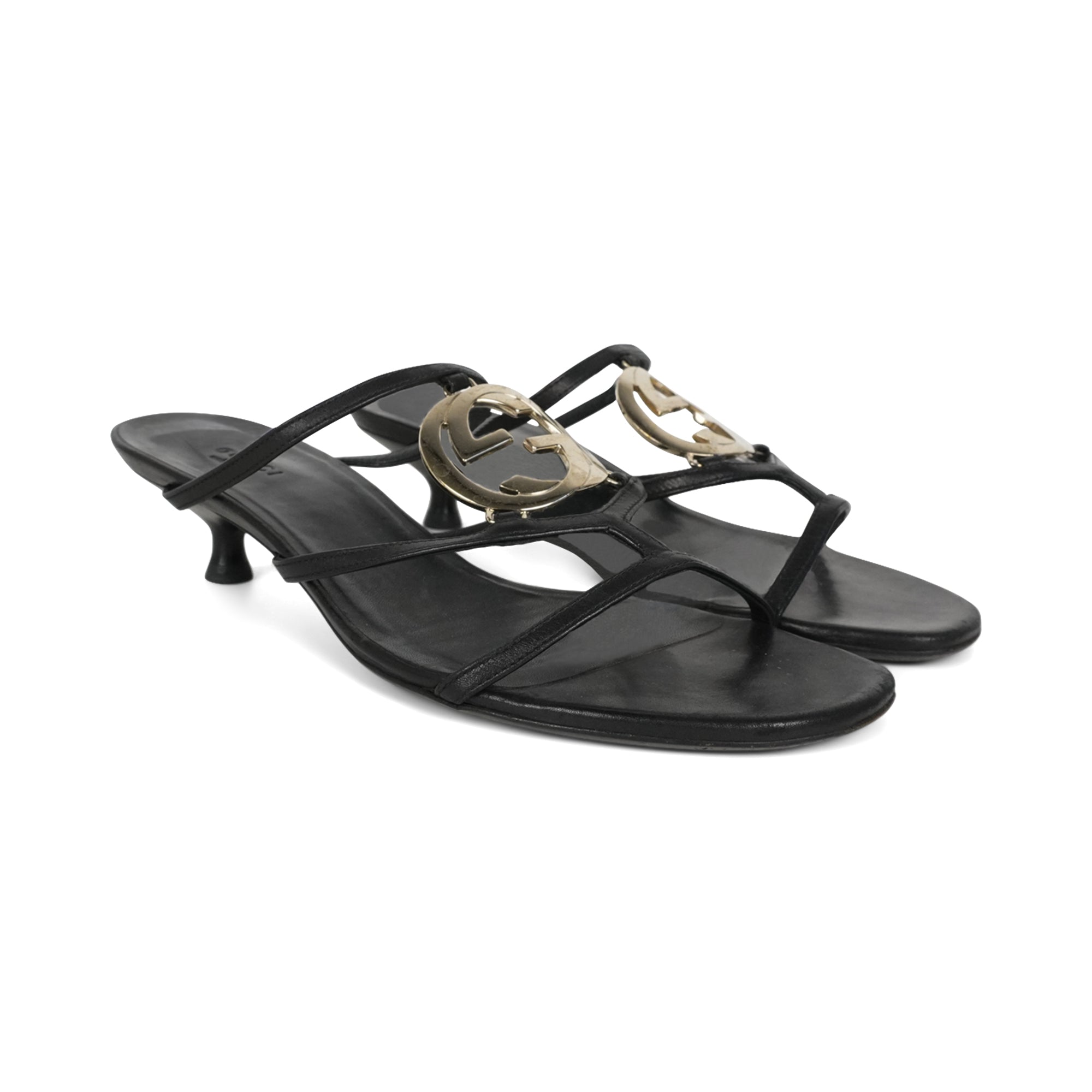 Gucci kitten heels in black leather with multi straps and interlocking 'GG' emblem in soft gold hardware.
