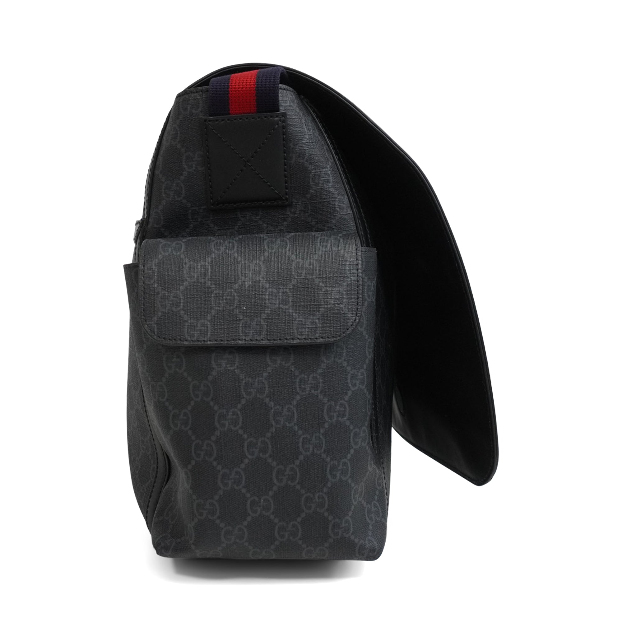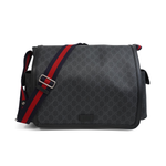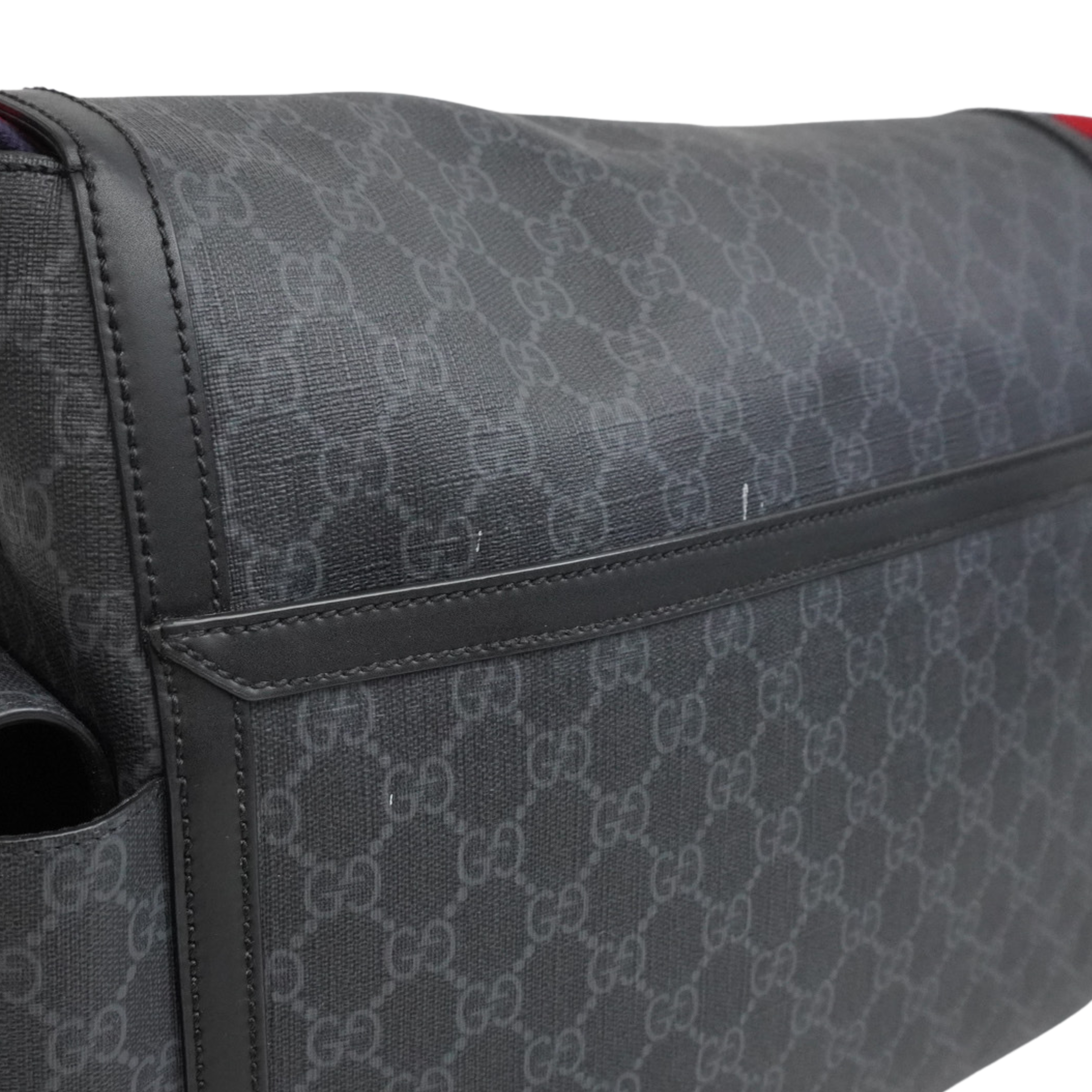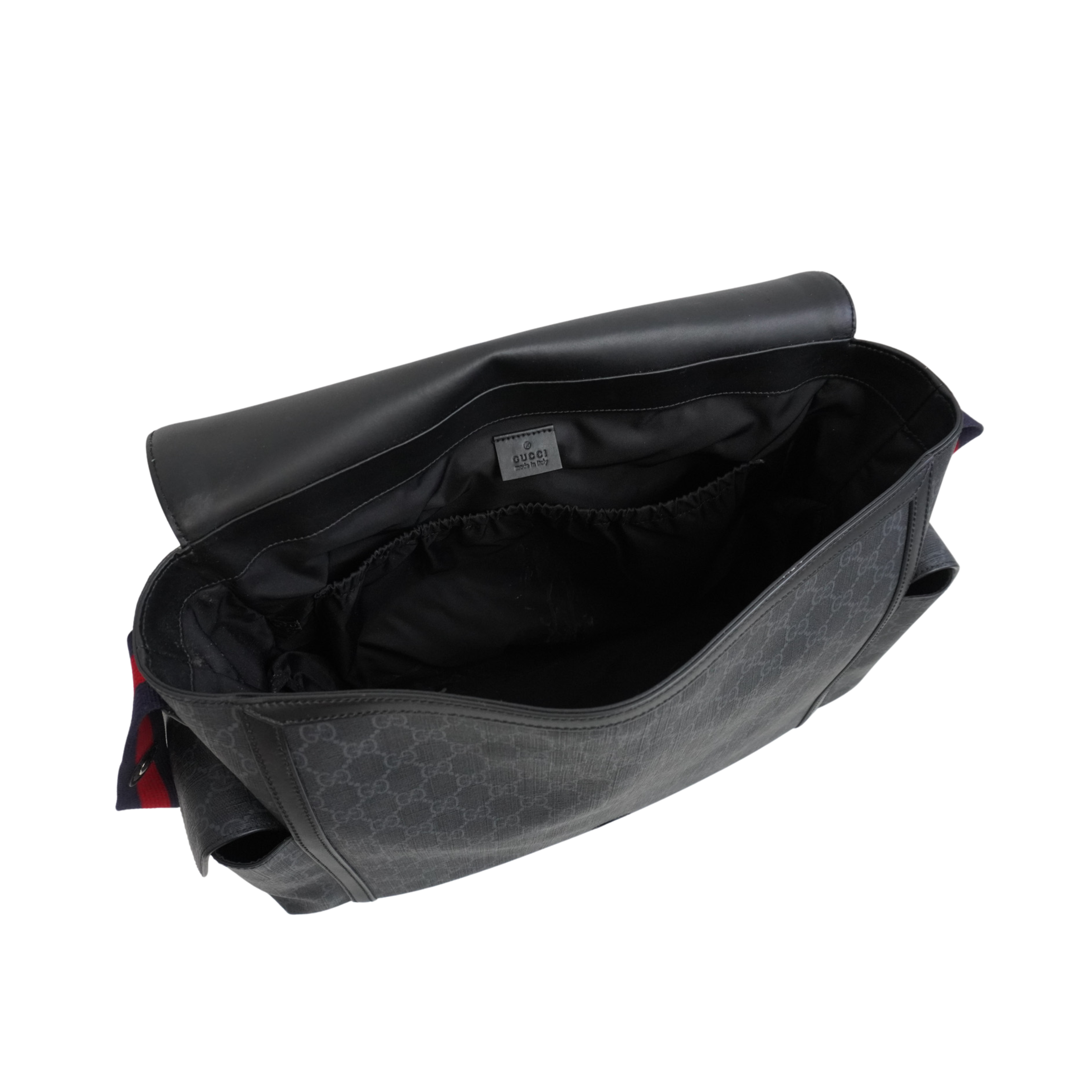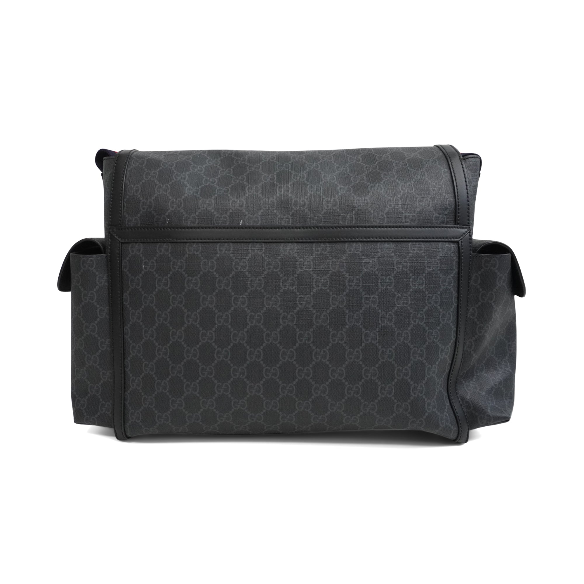 Gucci large diaper bag in navy and grey GG Supreme monogram coated canvas with black leather trim with full flap with snap closure, dual 3D side pockets and back slip pocket. Featuring navy and red racing stripe adjustable web strap. Interior features black nylon lining with three elasticized pockets and two bottle pockets.