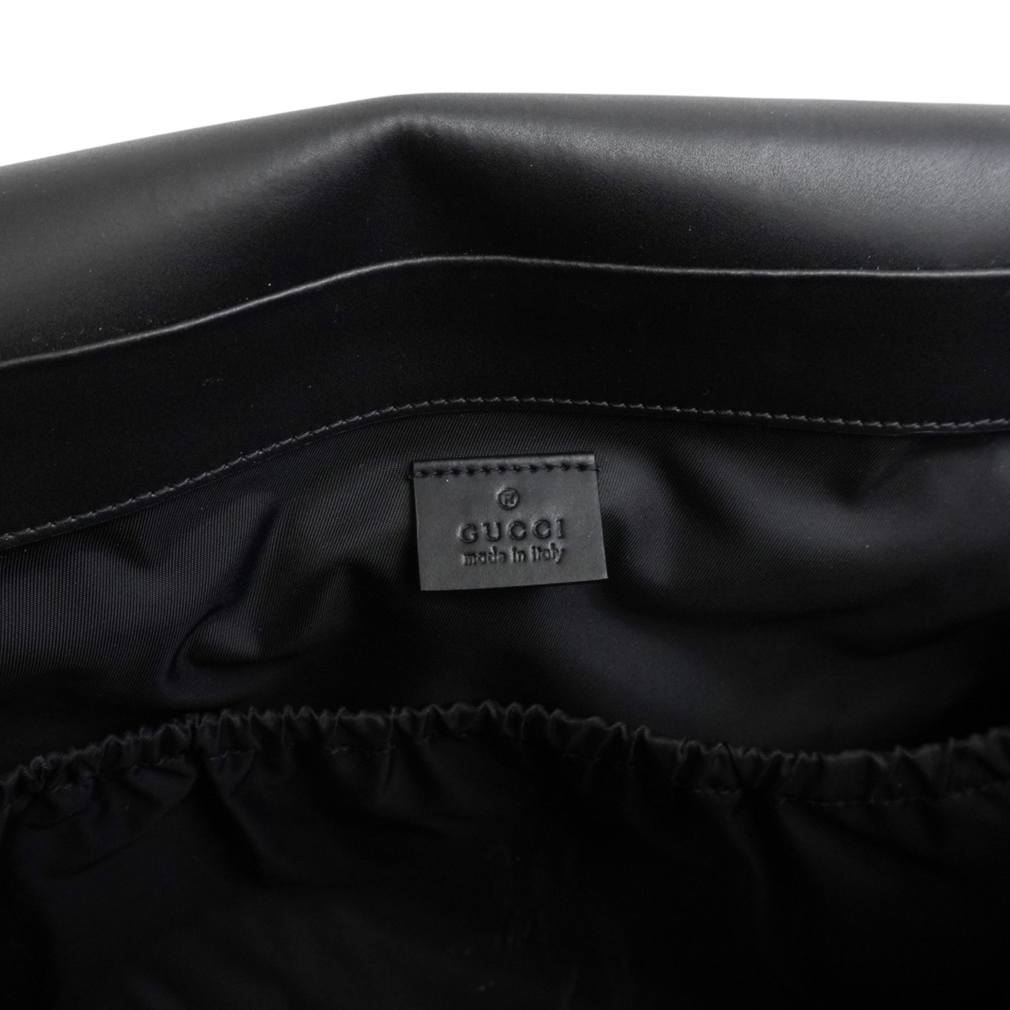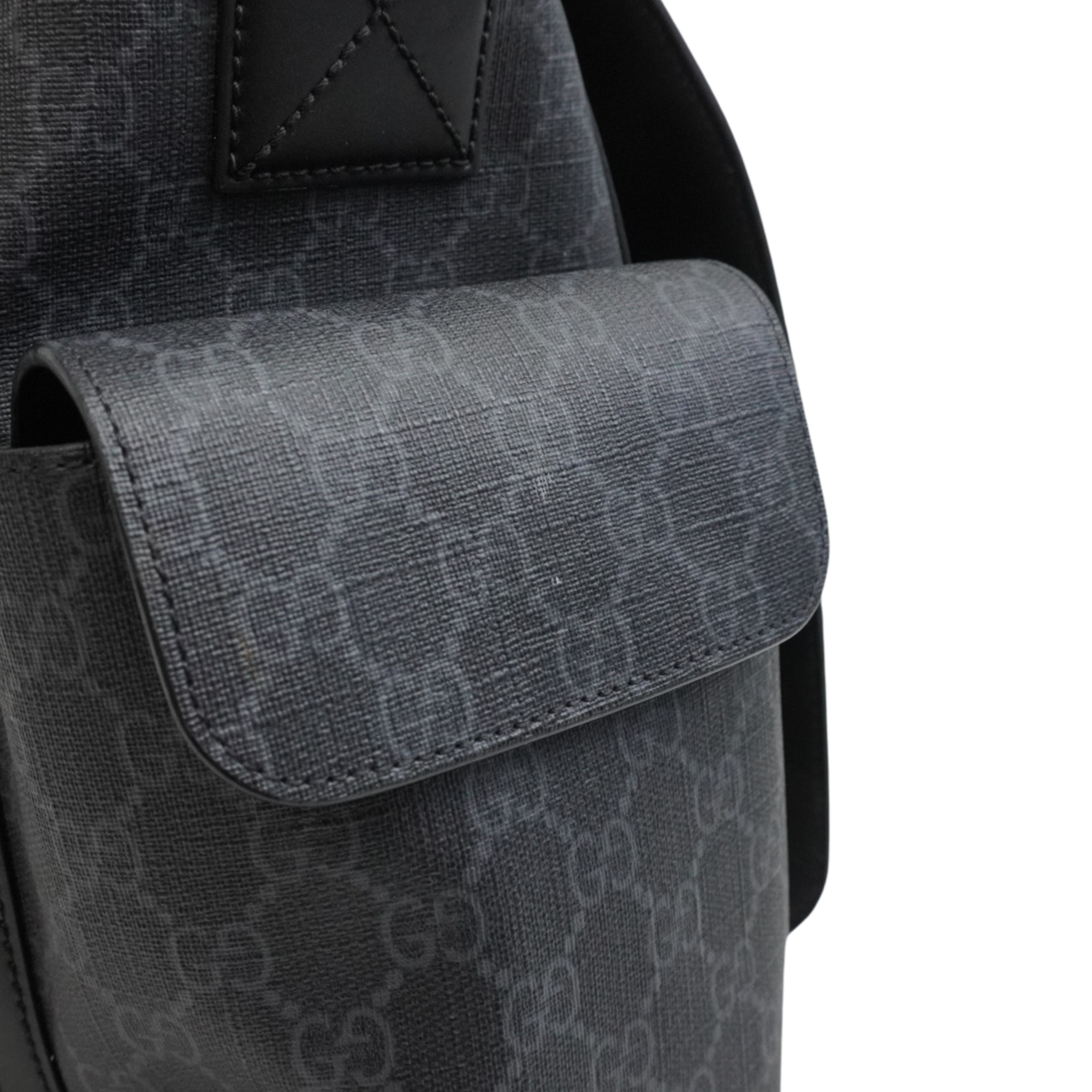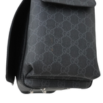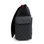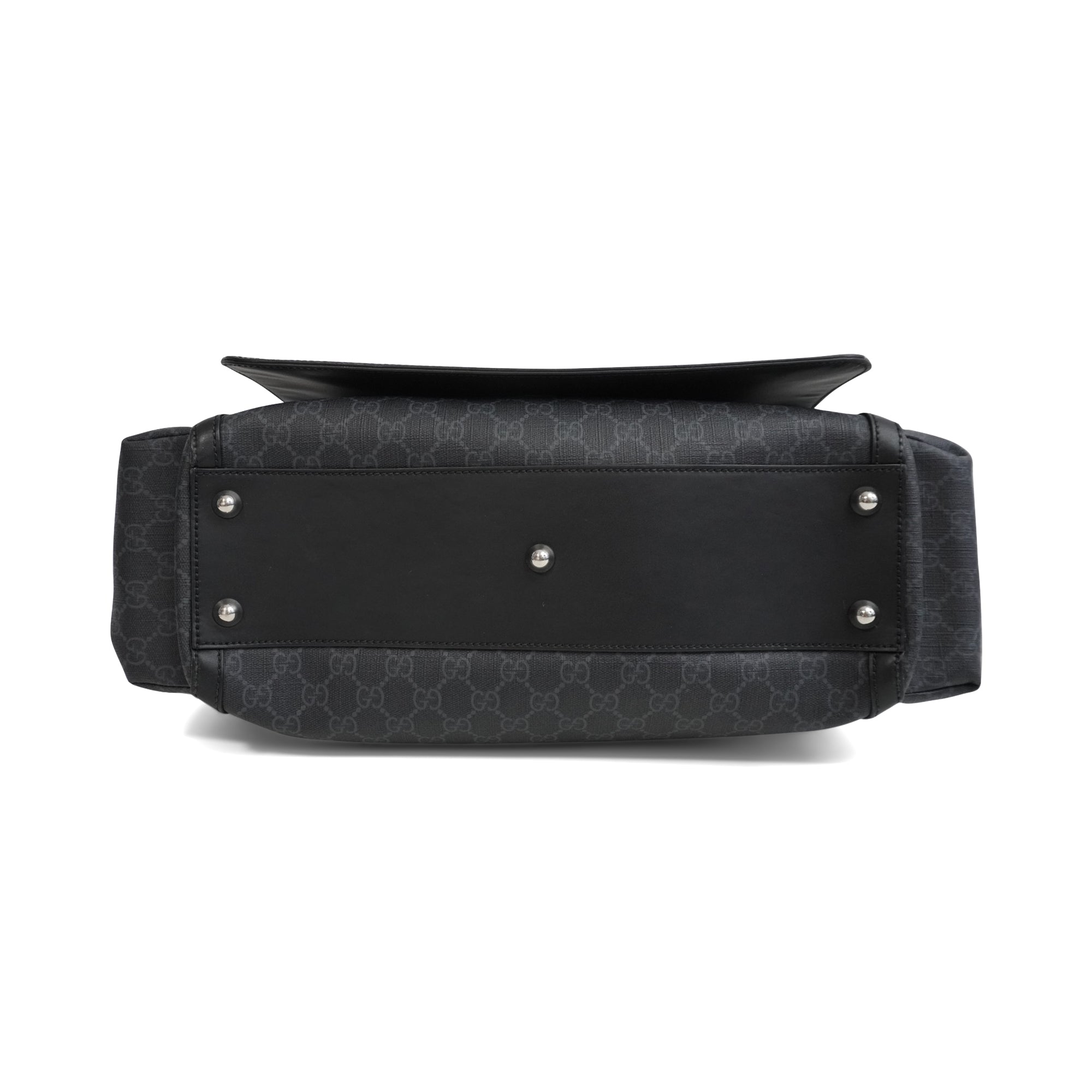 Gucci large diaper bag in navy and grey GG Supreme monogram coated canvas with black leather trim with full flap with snap closure, dual 3D side pockets and back slip pocket. Featuring navy and red racing stripe adjustable web strap. Interior features black nylon lining with three elasticized pockets and two bottle pockets.
