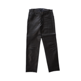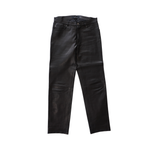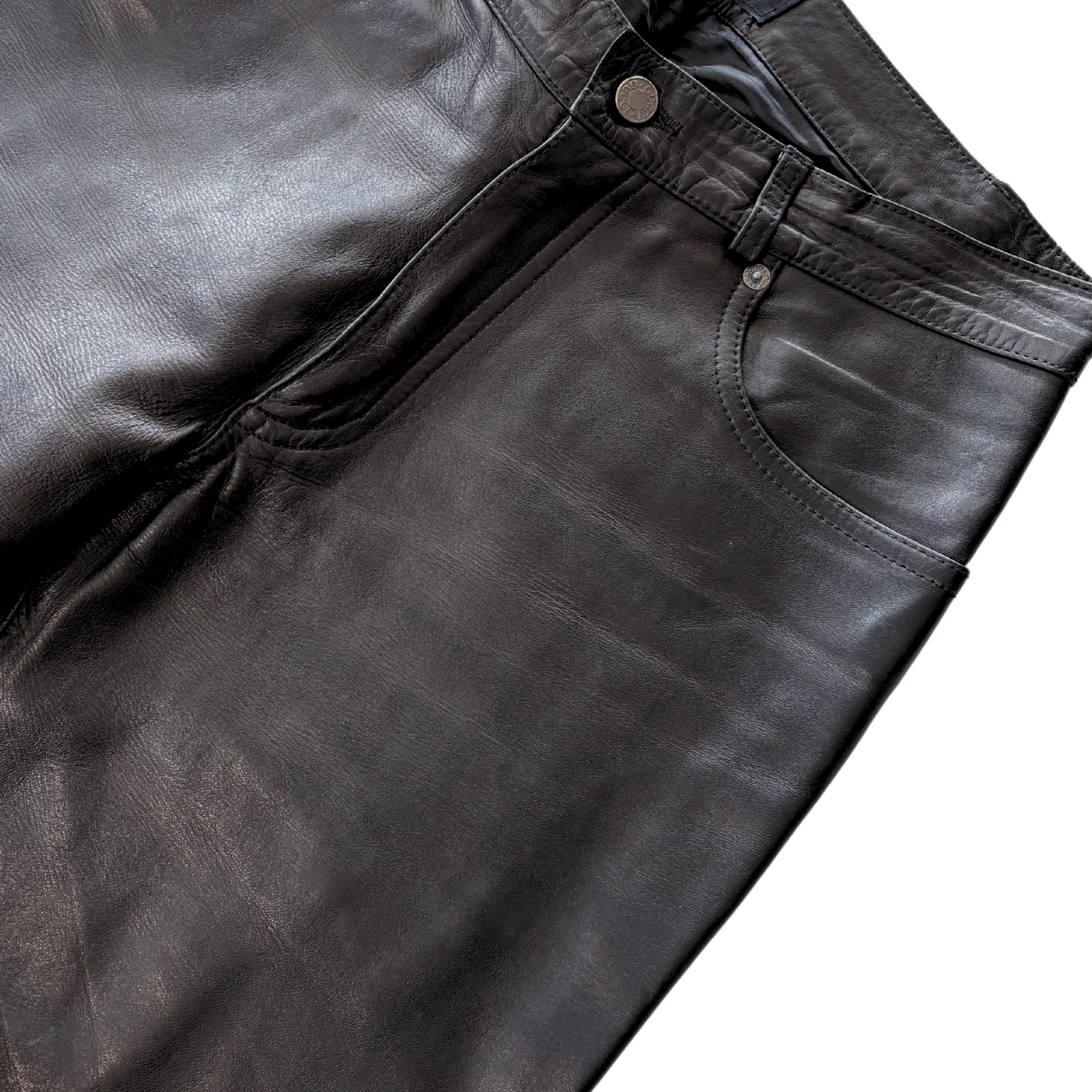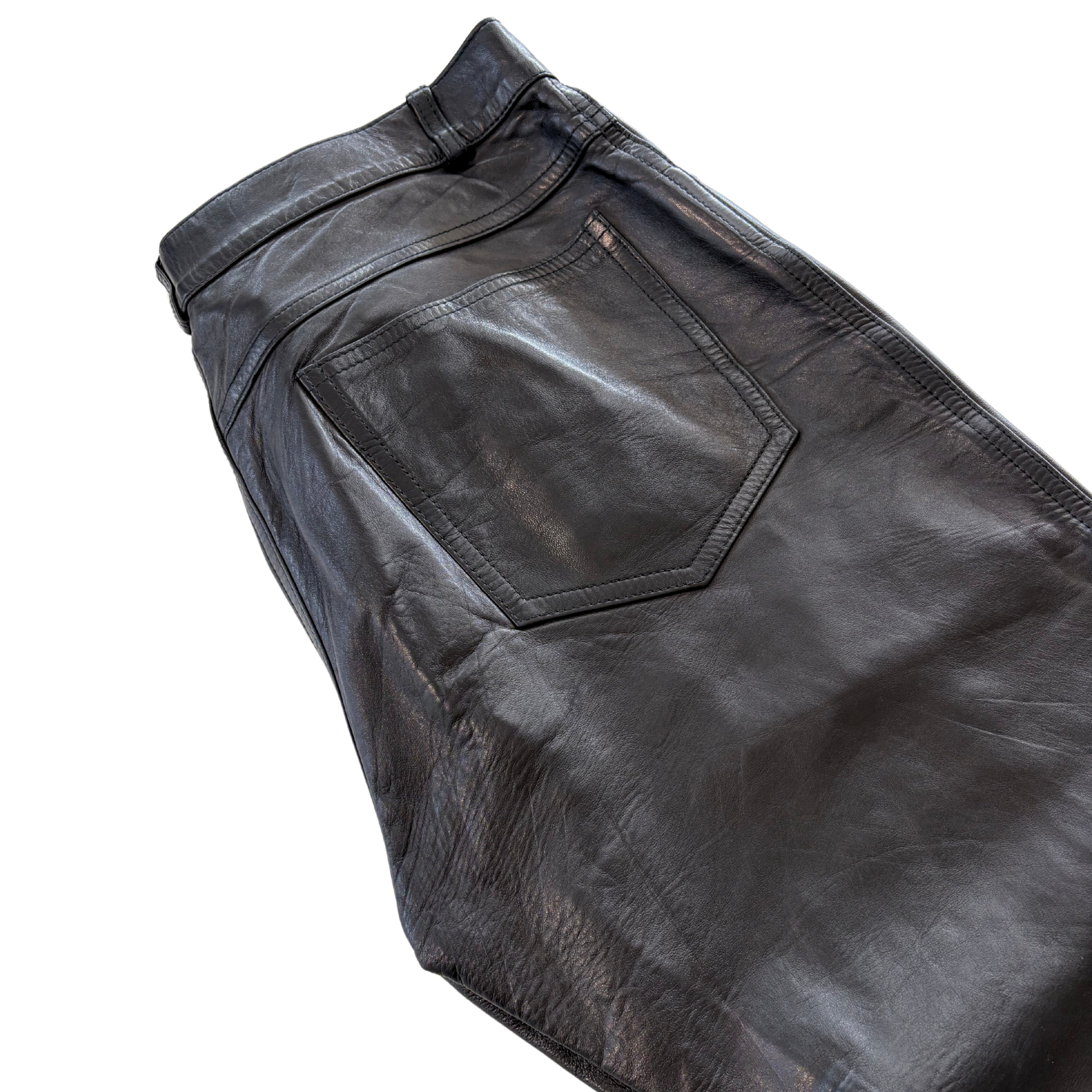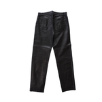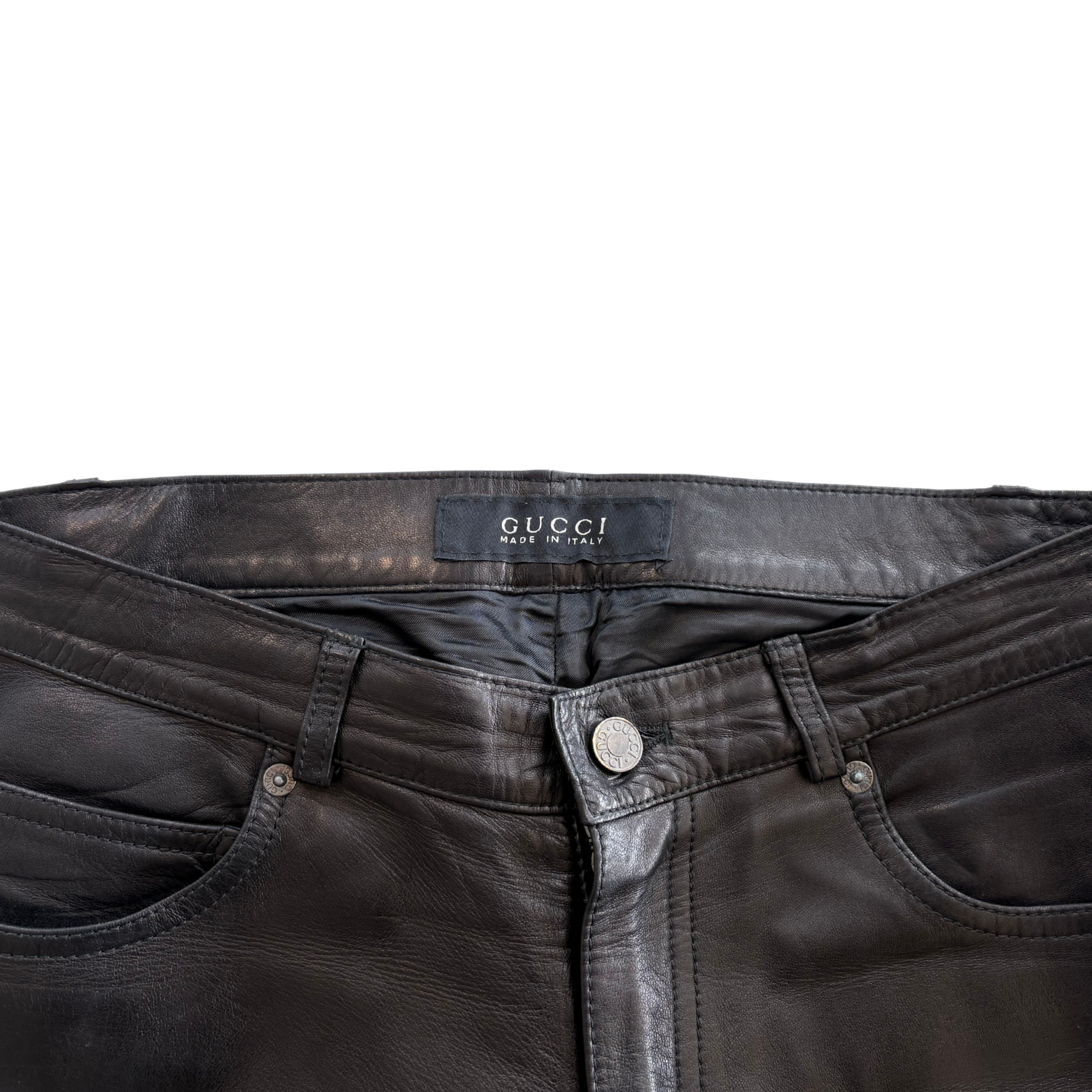 Gucci straight-leg pants in black leather with gunmetal zip and button hardware.