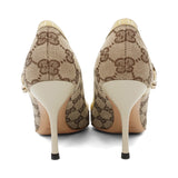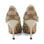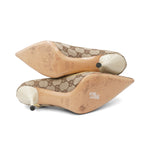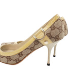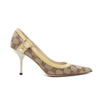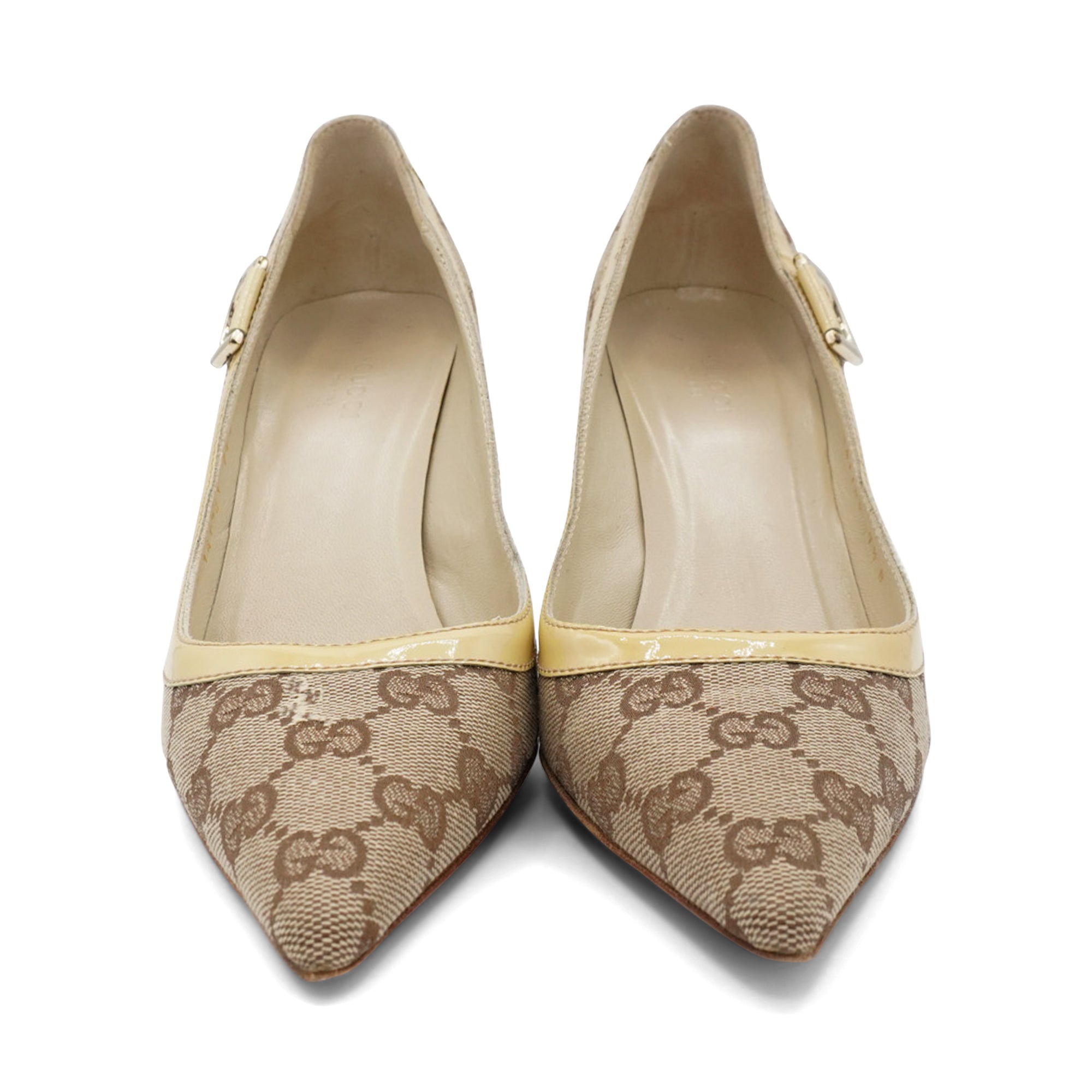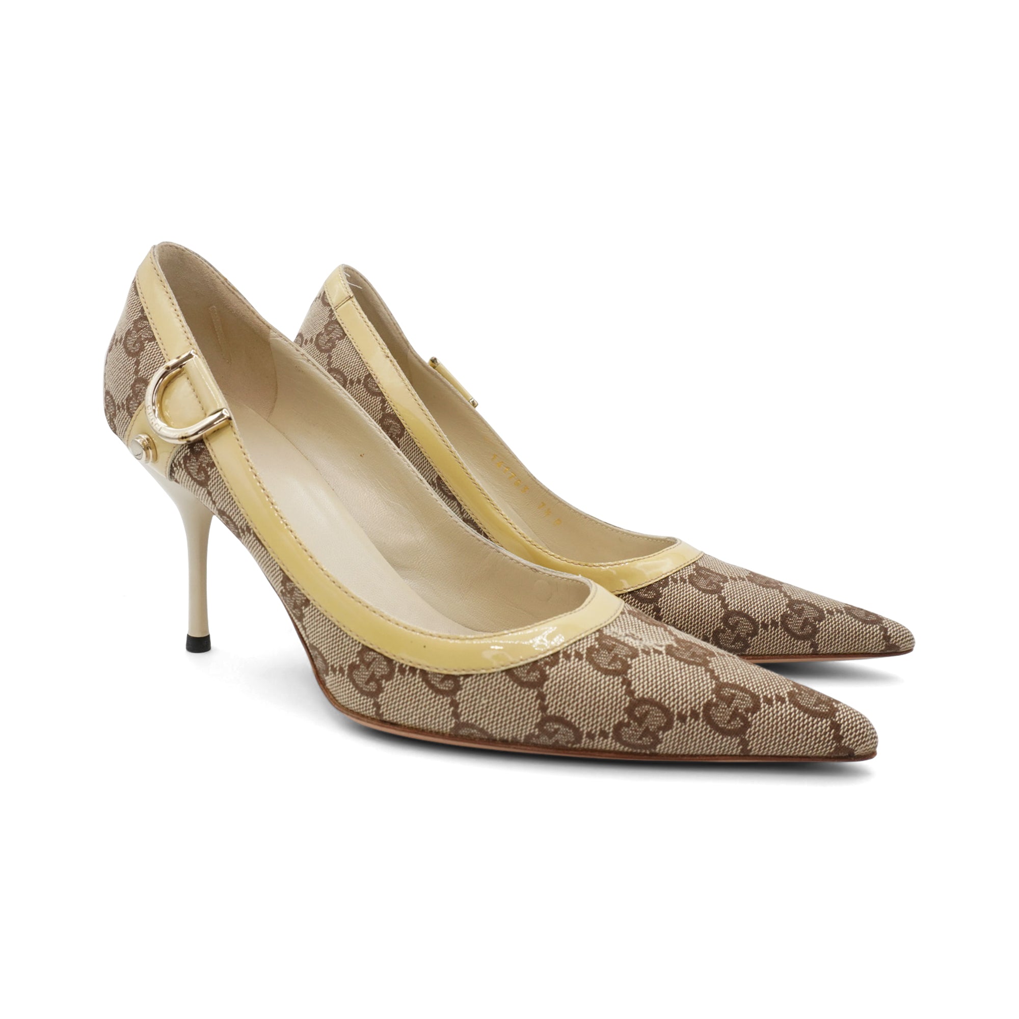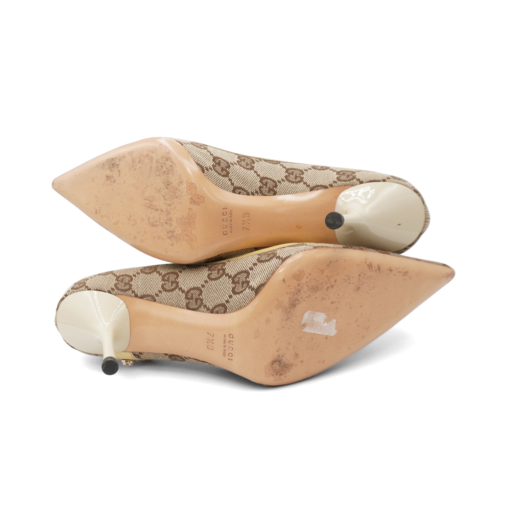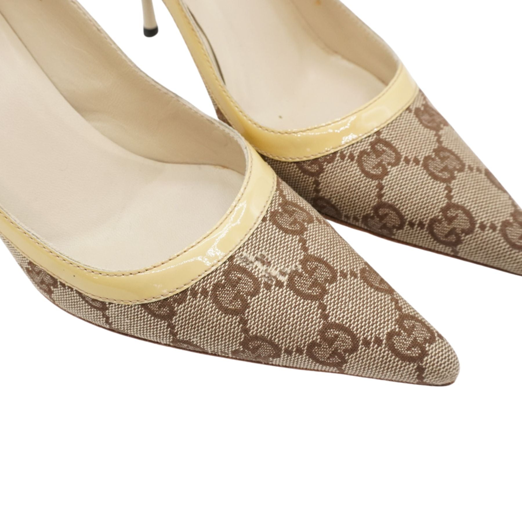 Gucci pointed-toe pumps in beige and brown logo monogram canvas. Features a butter yellow patent leather trim, cream patent leather stiletto heel, and soft-gold hardware details on the sides.