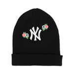 Gucci x MLB 'New York Yankees' toque in black wool with embroidered NY logo and flowers, as well as a rubberized Gucci logo on the back.