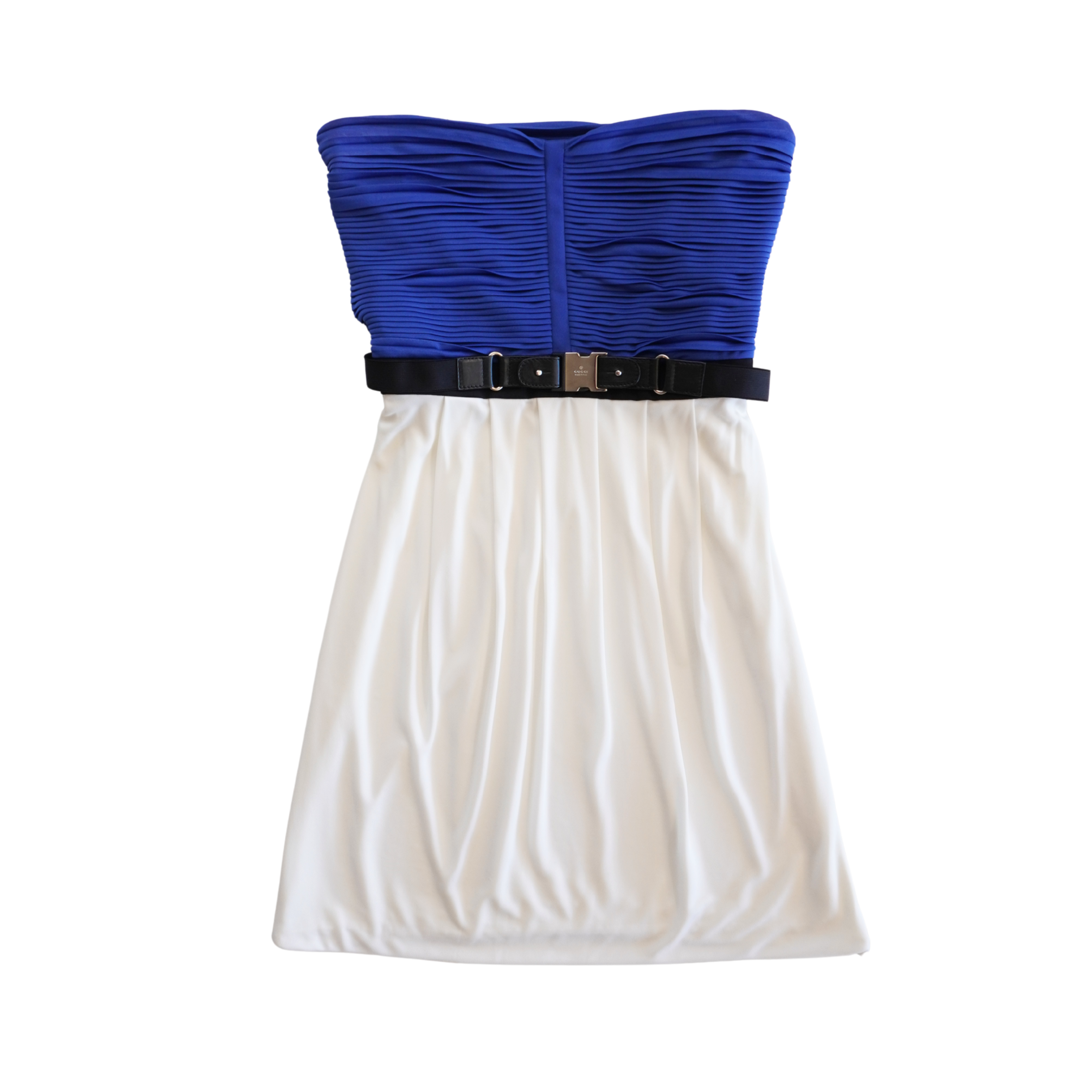 Gucci strapless mini dress with royal blue pleated bodice and white bubble skirt. Features a side seam silver zipper and removable black elastic belt with silver buckle.