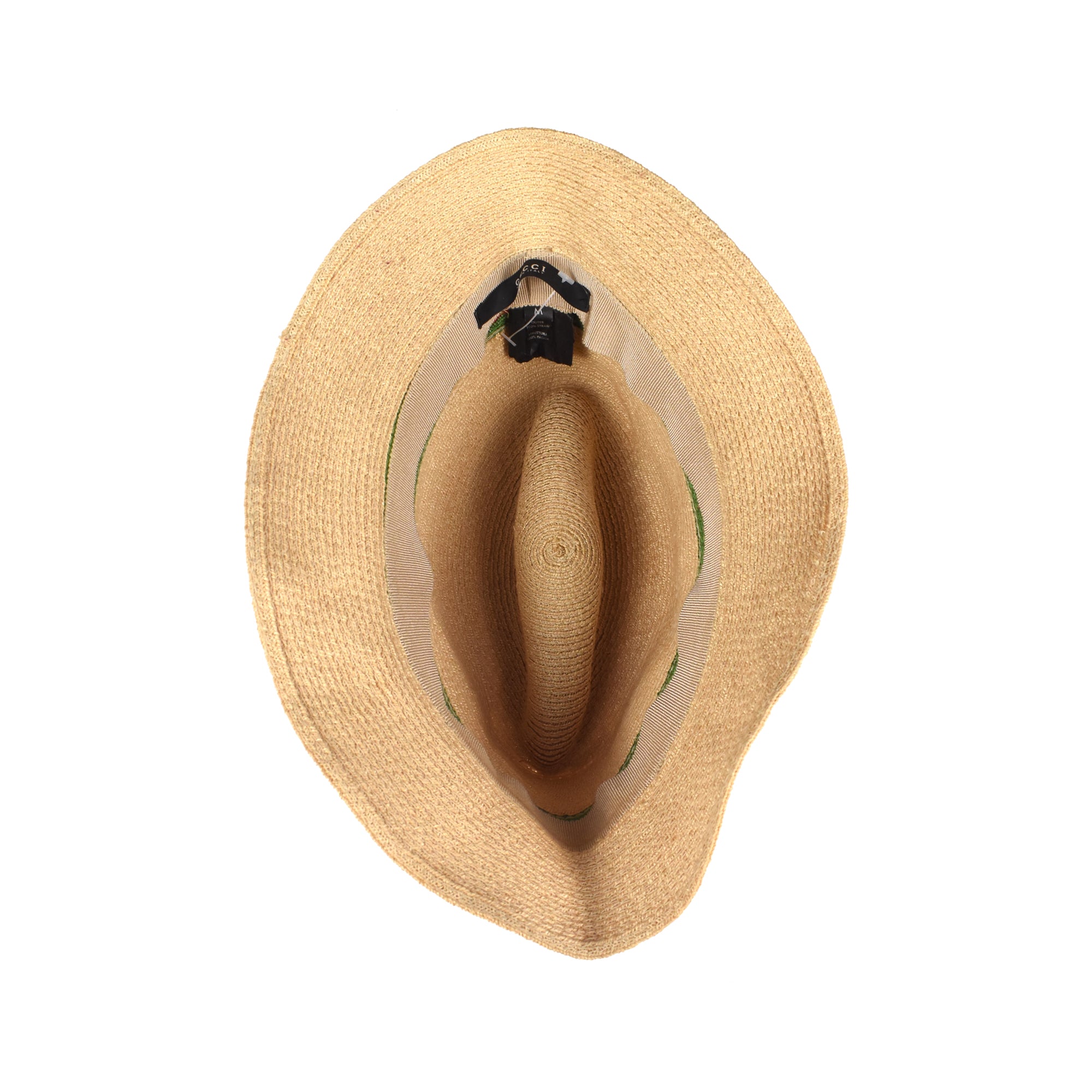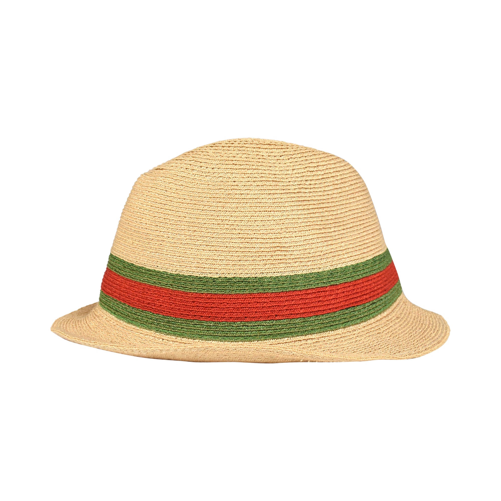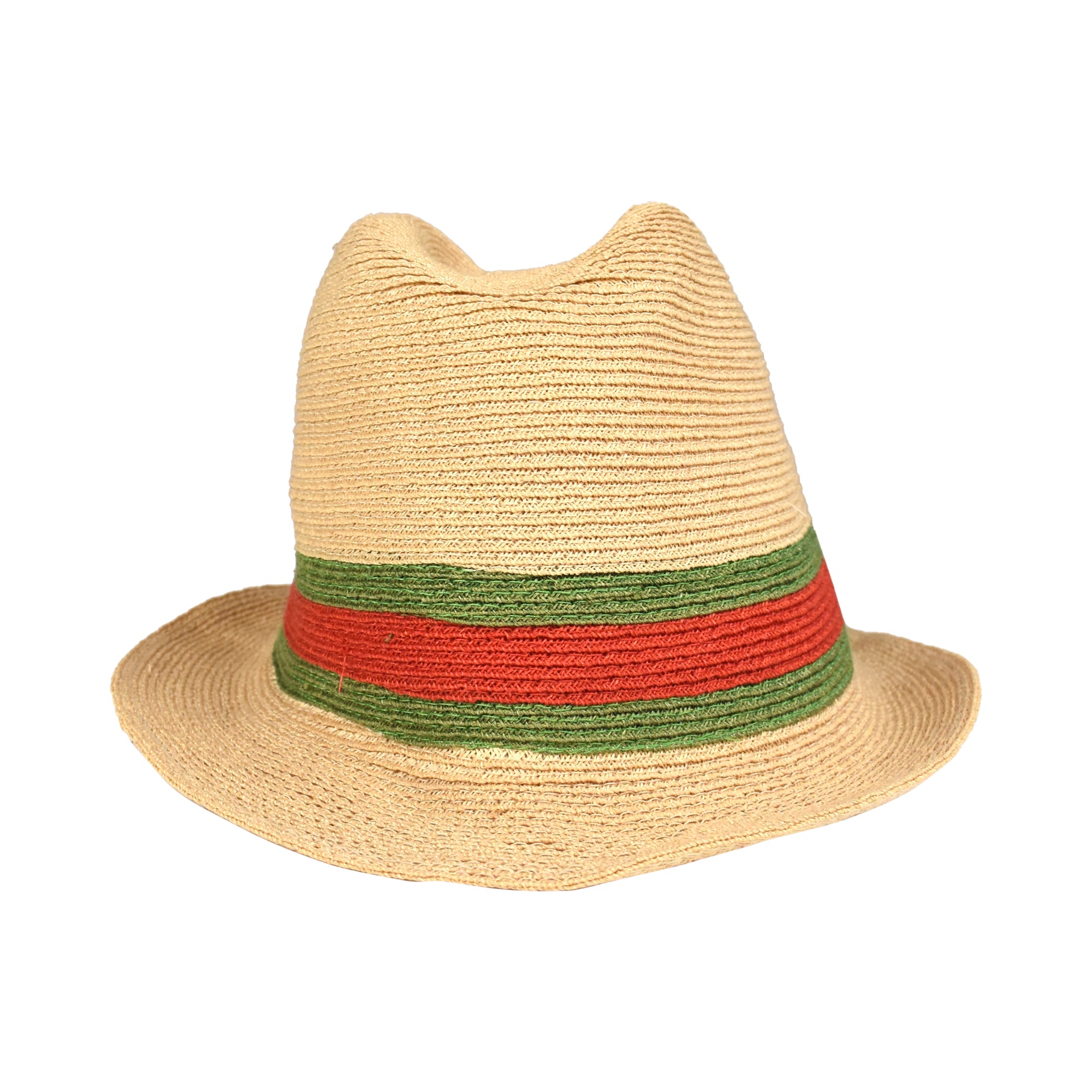 Gucci fedora hat in beige straw with a red and green racing stripe trim.