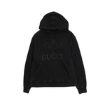 Gucci 'Tennis Club' hoodie in black cotton with black, embroidered, tonal tennis logo on the chest with kangaroo pocket, ribbed side panels and thick drawstrings.