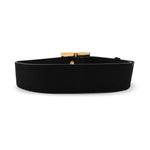 Gucci thick vintage belt in black suede with a large gold square buckle and gold grommet hardware.