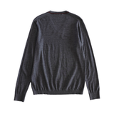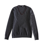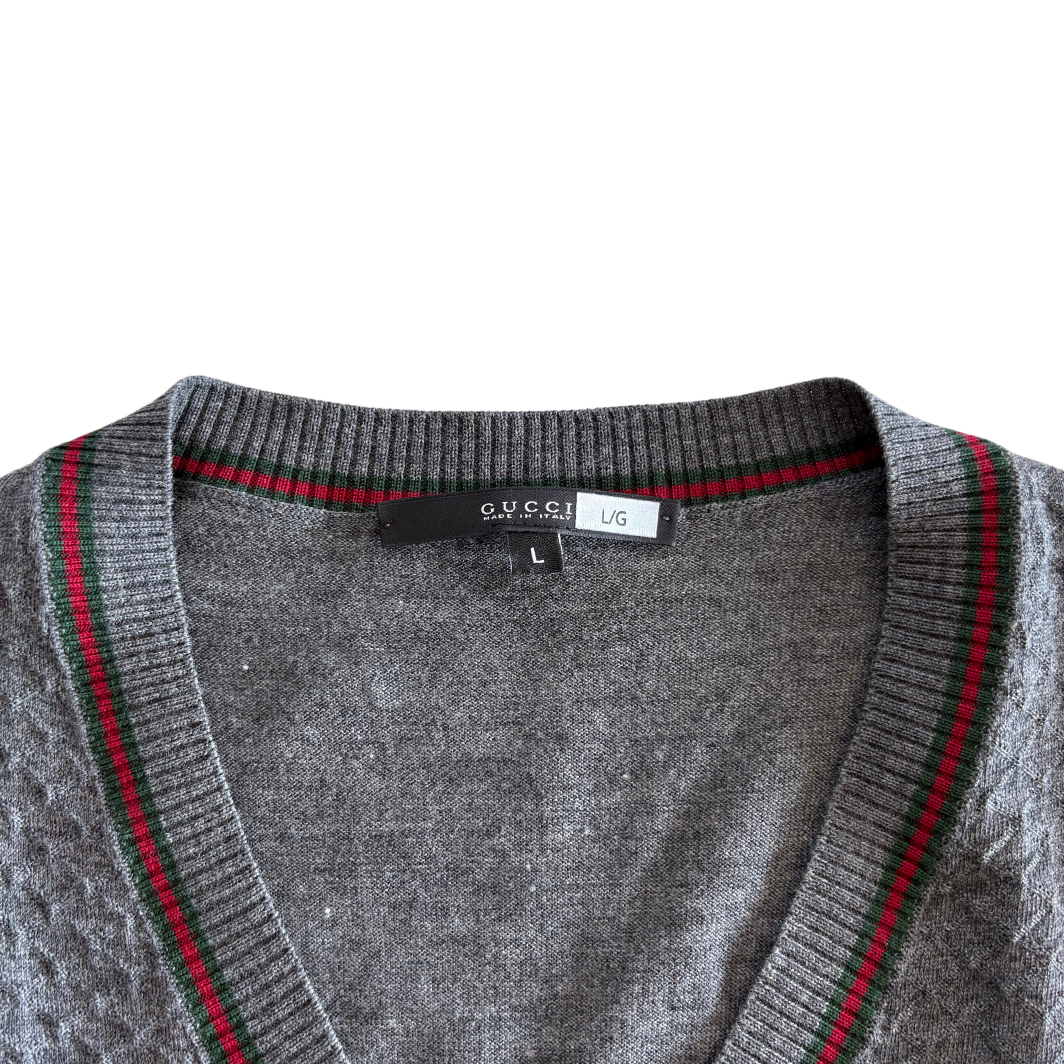 Gucci sweater in grey knit wool with a diamond weave, a v-neckline, and a signature red and green racing stripe around the collar.