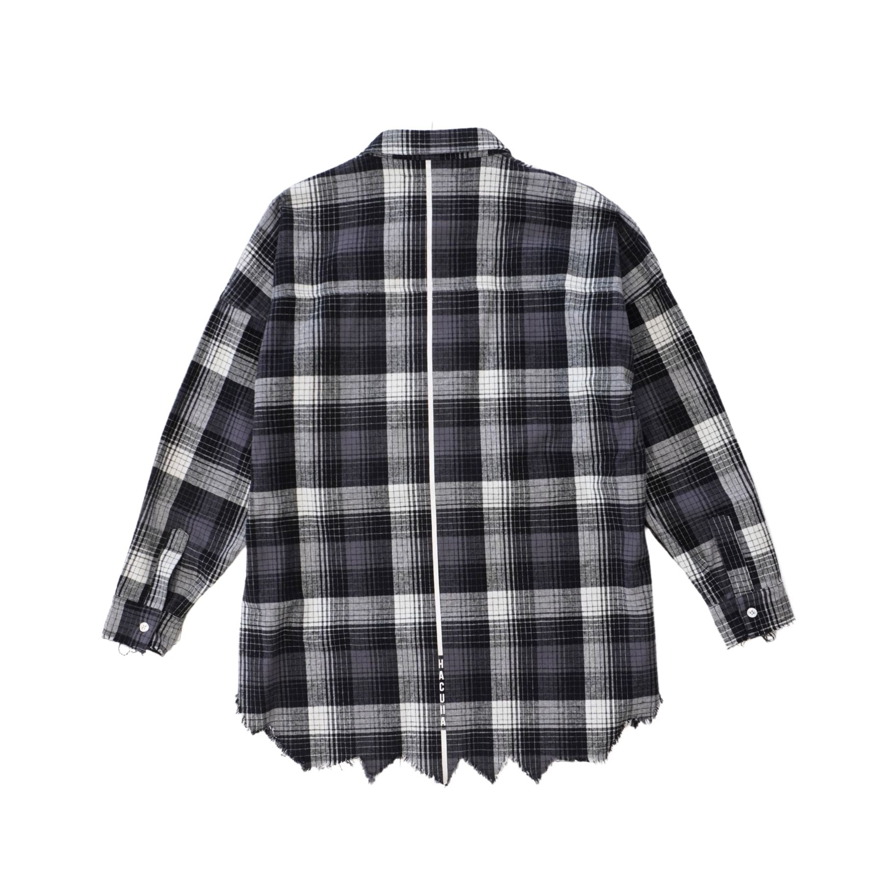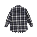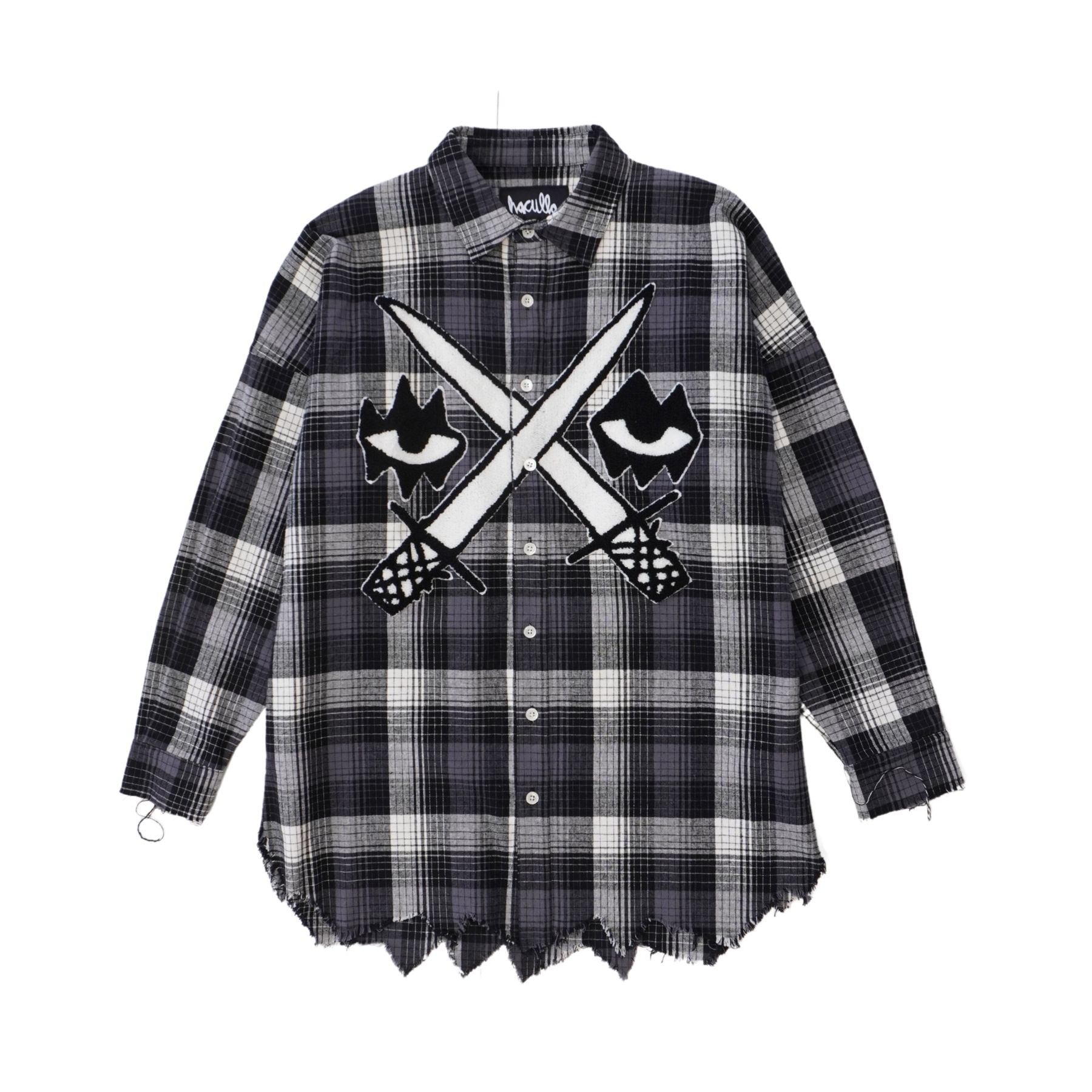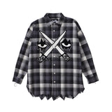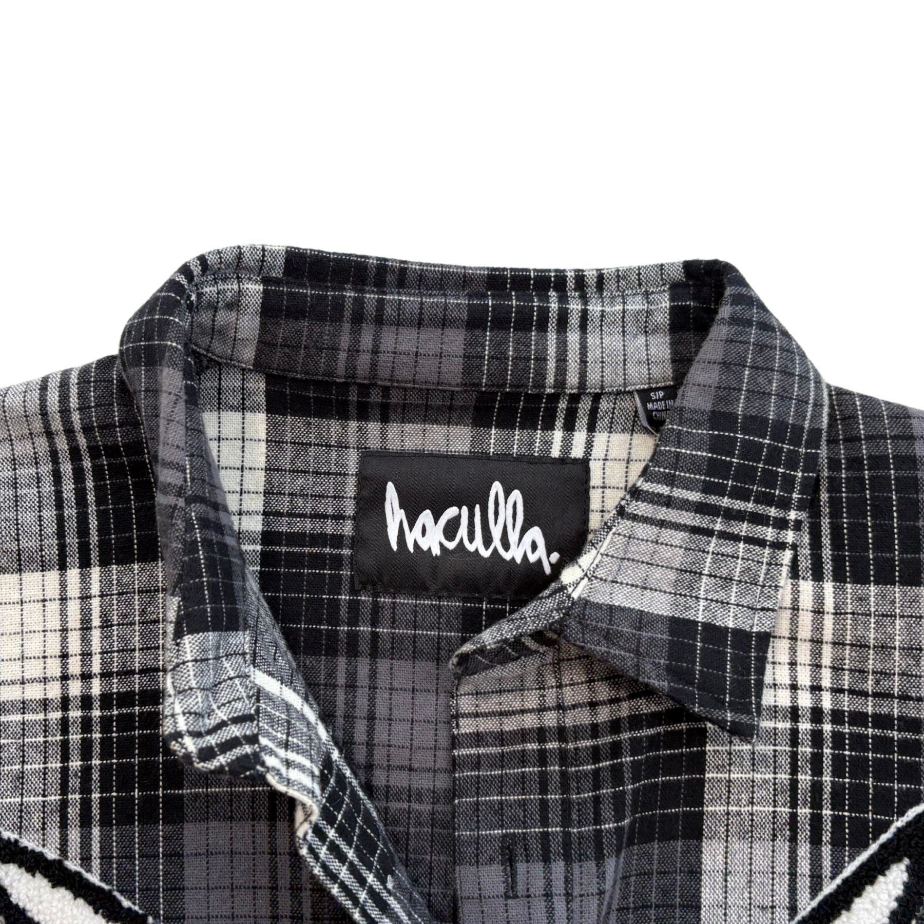 Haculla 'Fighter Eyez' button-down flannel shirt in black and white plaid cotton with terry cloth knife and eye patches on the chest and a raw hem.