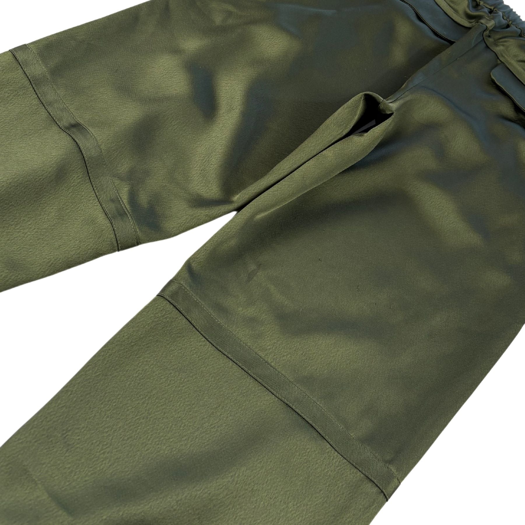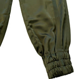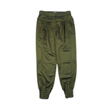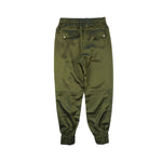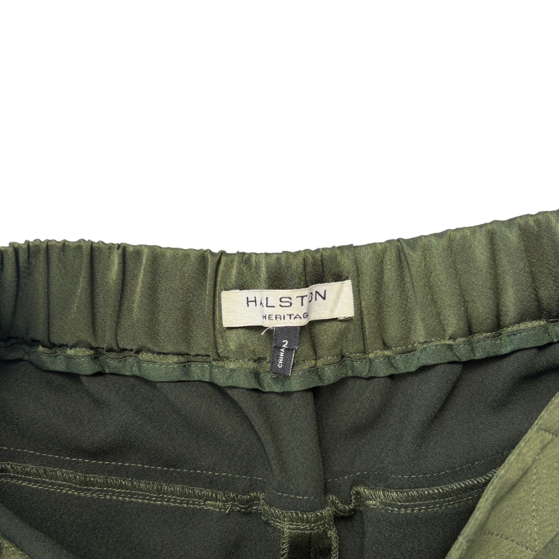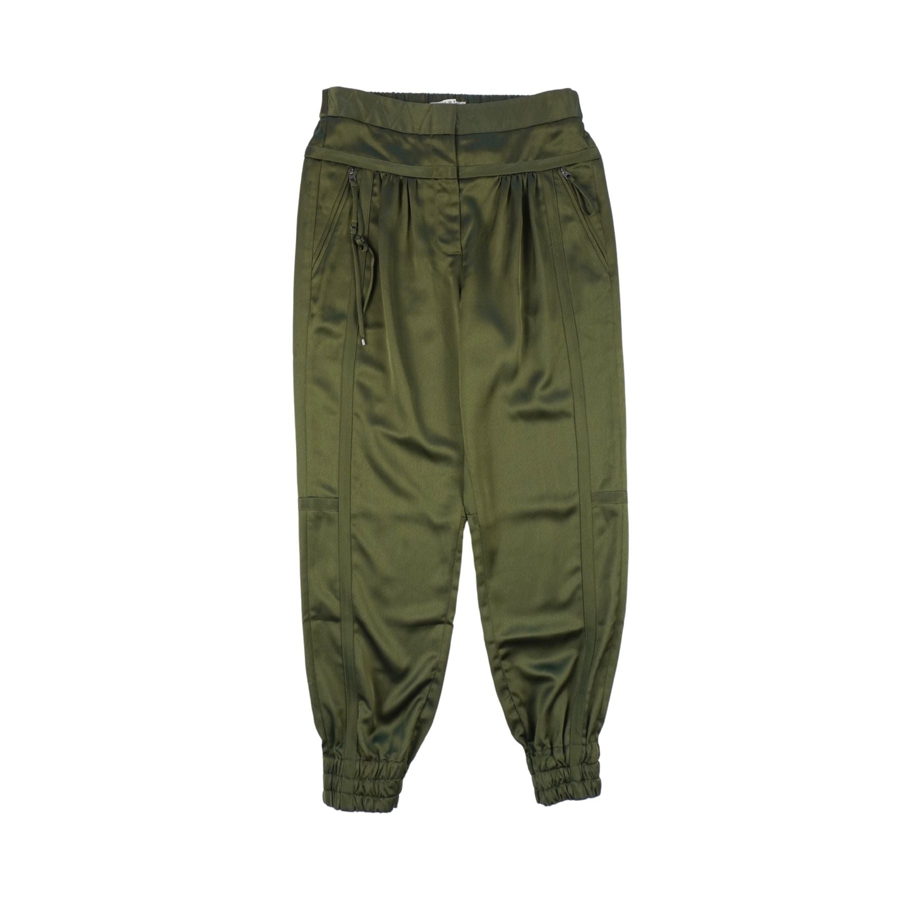 Halston track pants in olive green satin with ribbon detailing throughout, side-zip pockets, and tapered elasticized ankle cuffs.