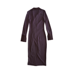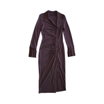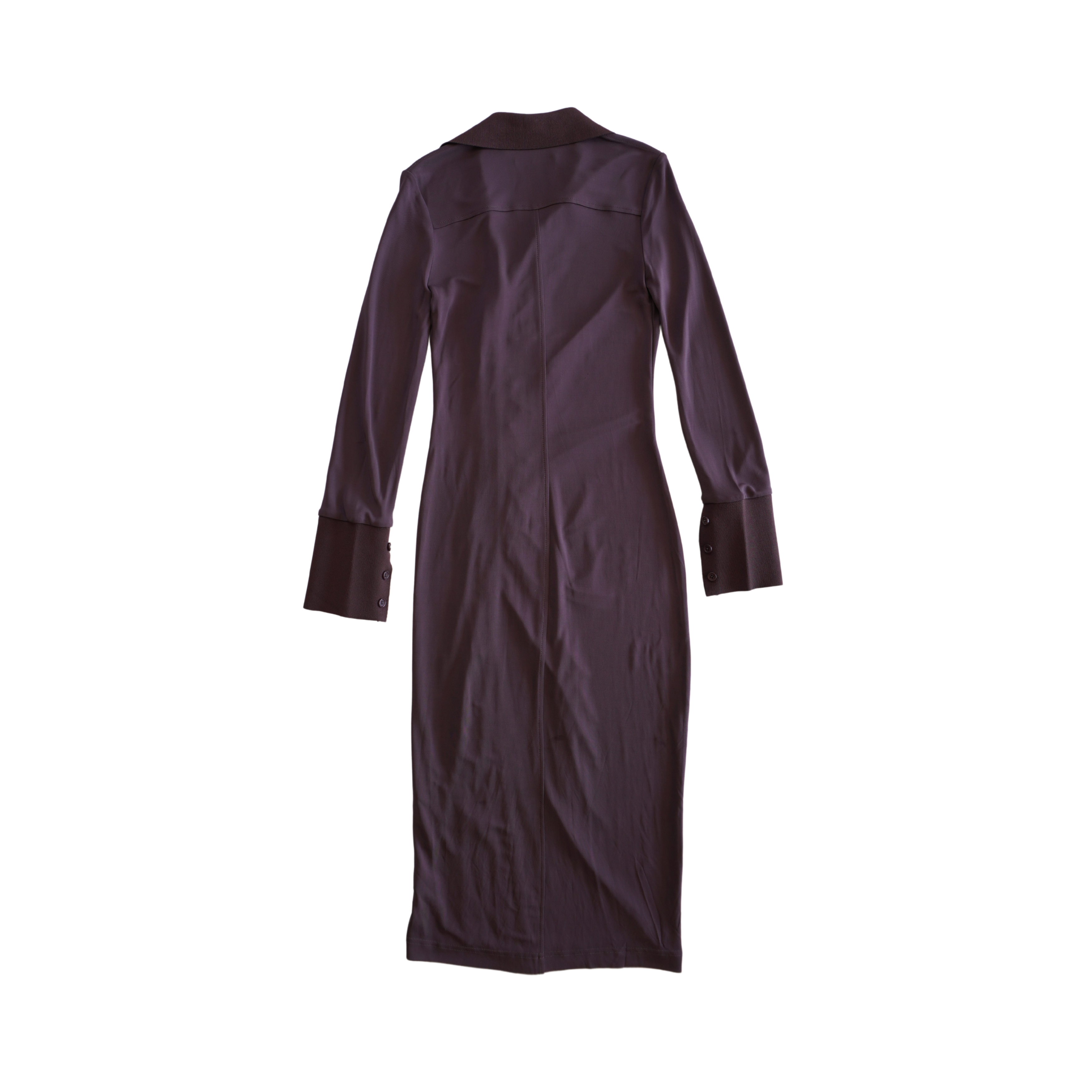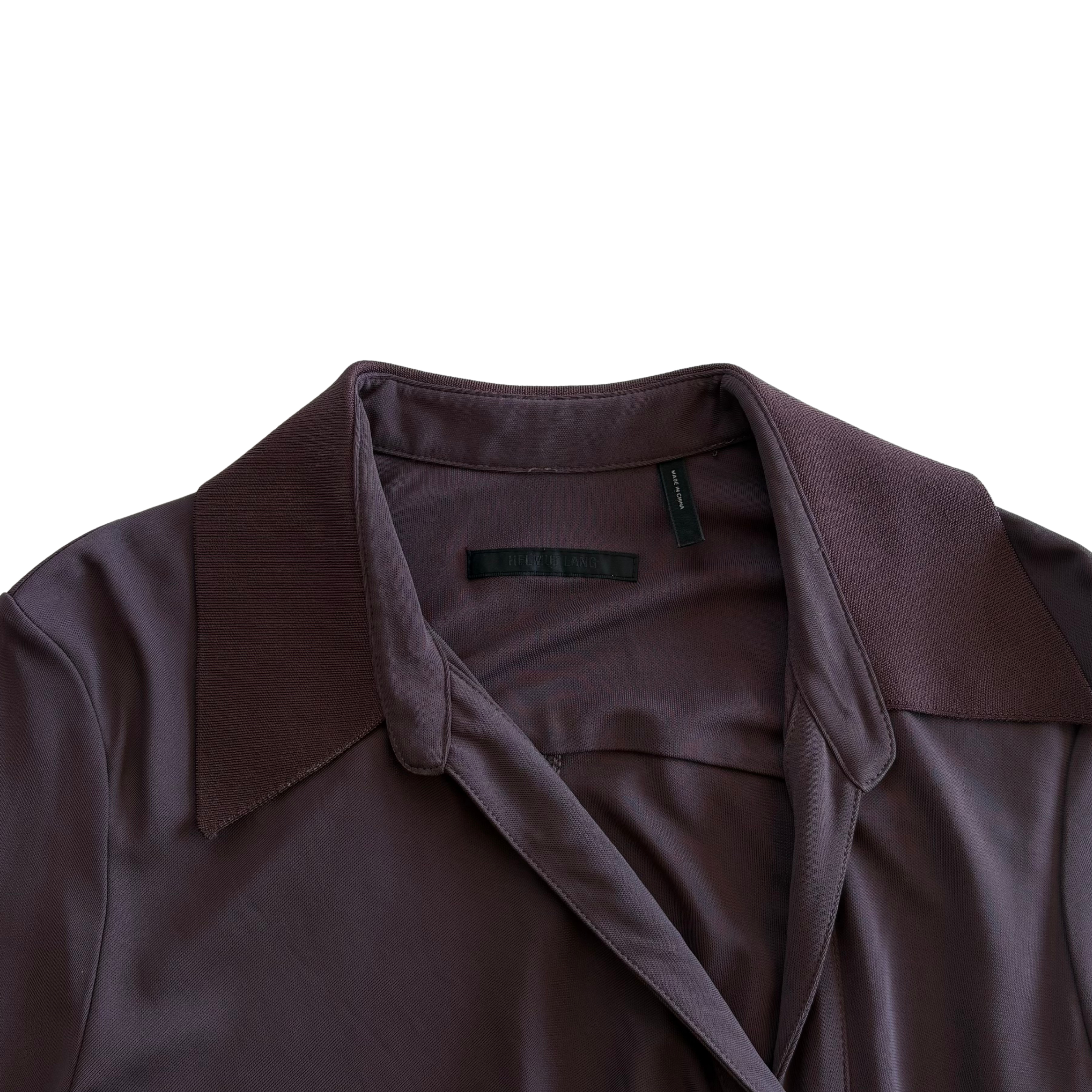 Helmut Lang midi shirt dress in brown stretch viscose with an asymmetrical front-button closure, ruching down the centre, and a ribbed trim at the cuffs and collar.