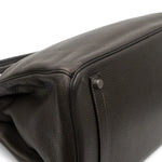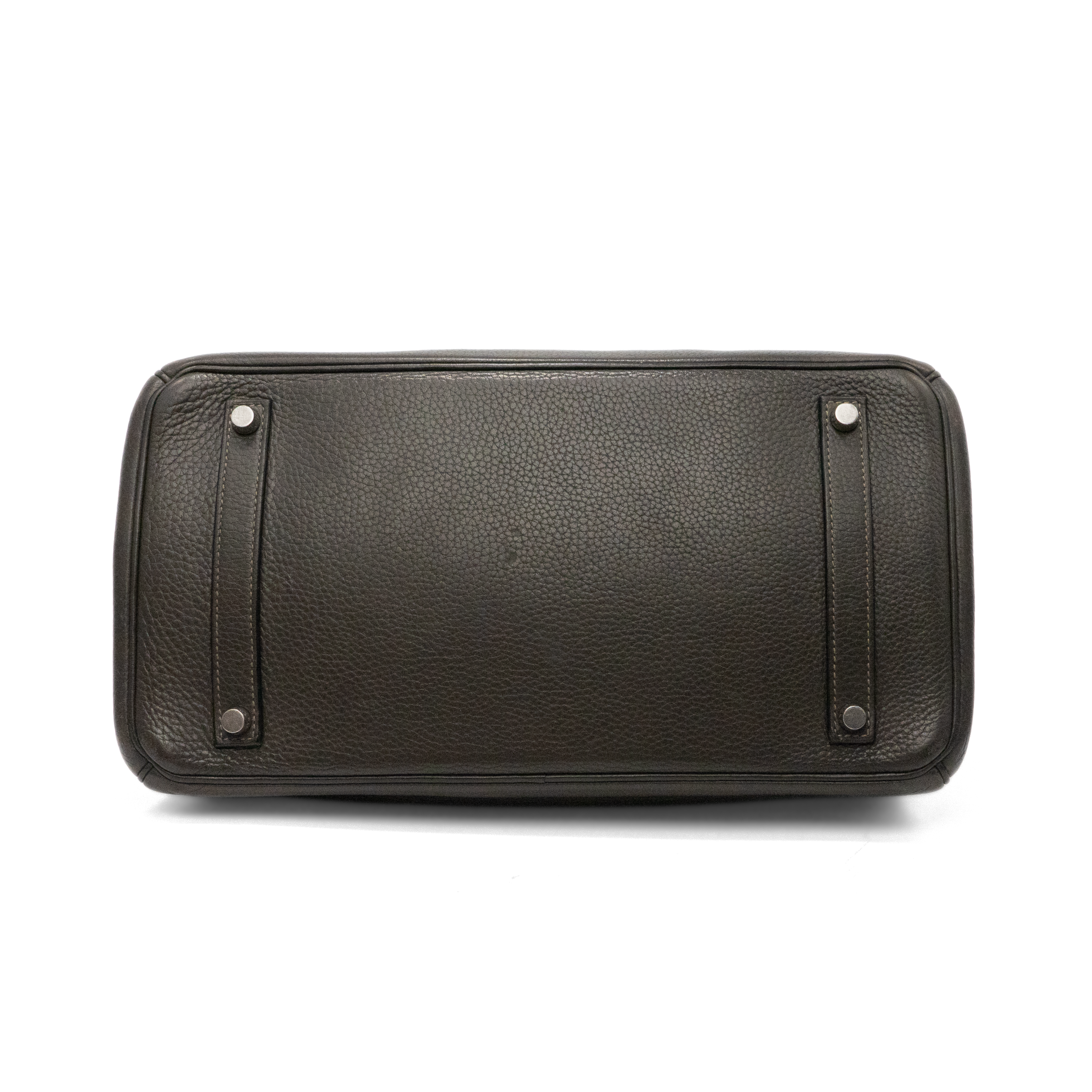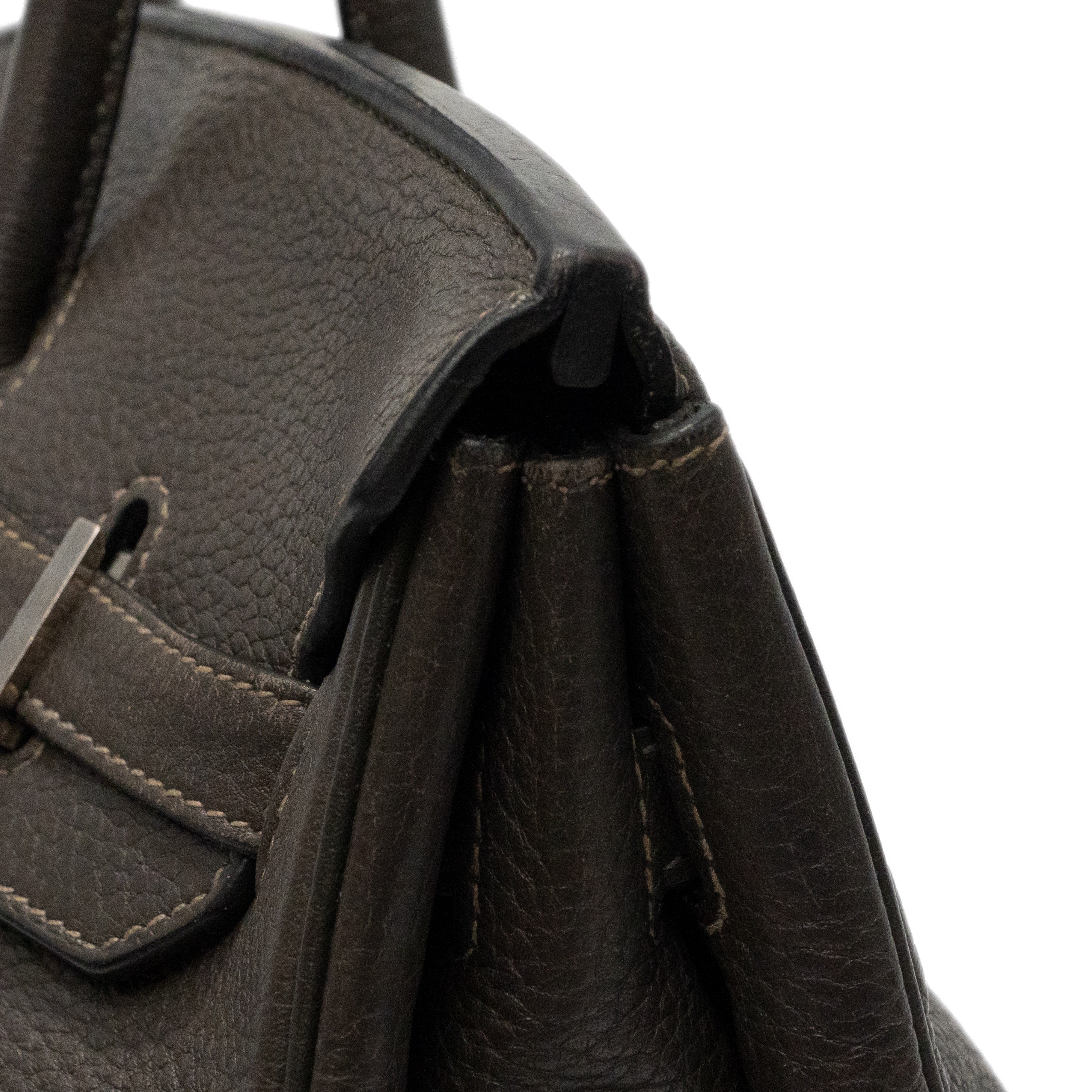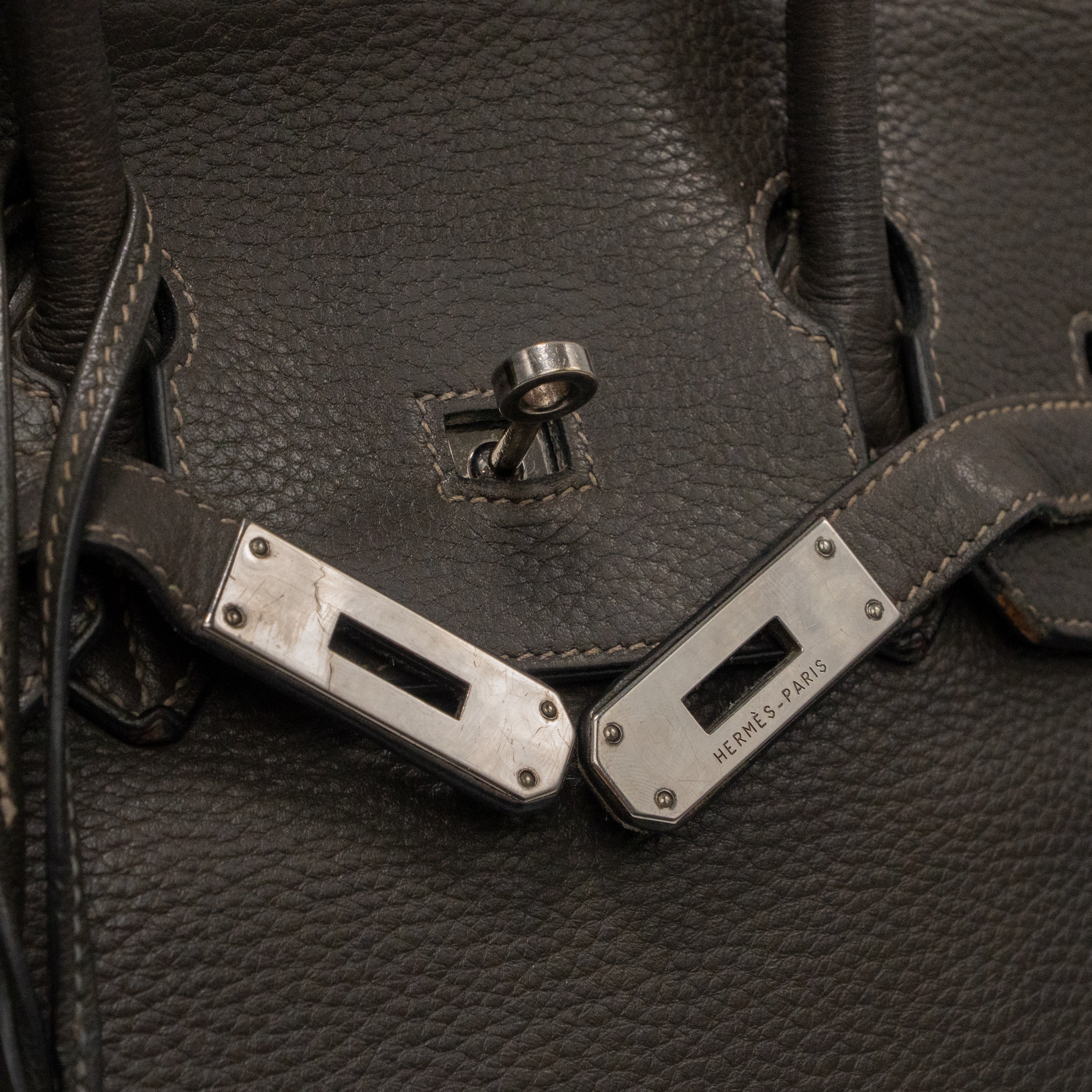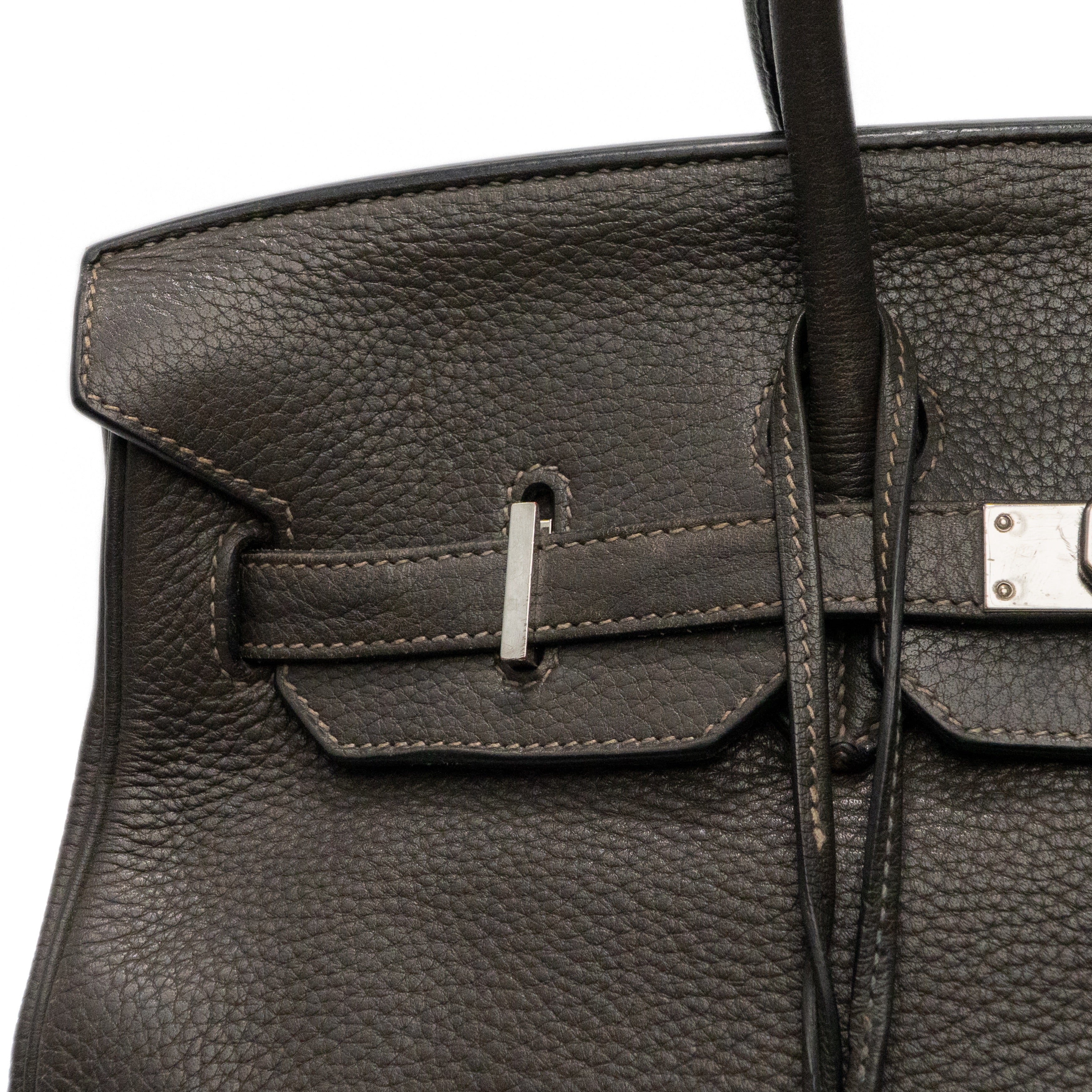 Hermes 'Birkin 35' handbag in grey 'Gris Meyer' clemence leather with palladium hardware and dual rolled top handles. The bag has a flap closure with sangle straps that fasten with signature 'Kelly' turnlock. The interior is lined with grey goat leather.