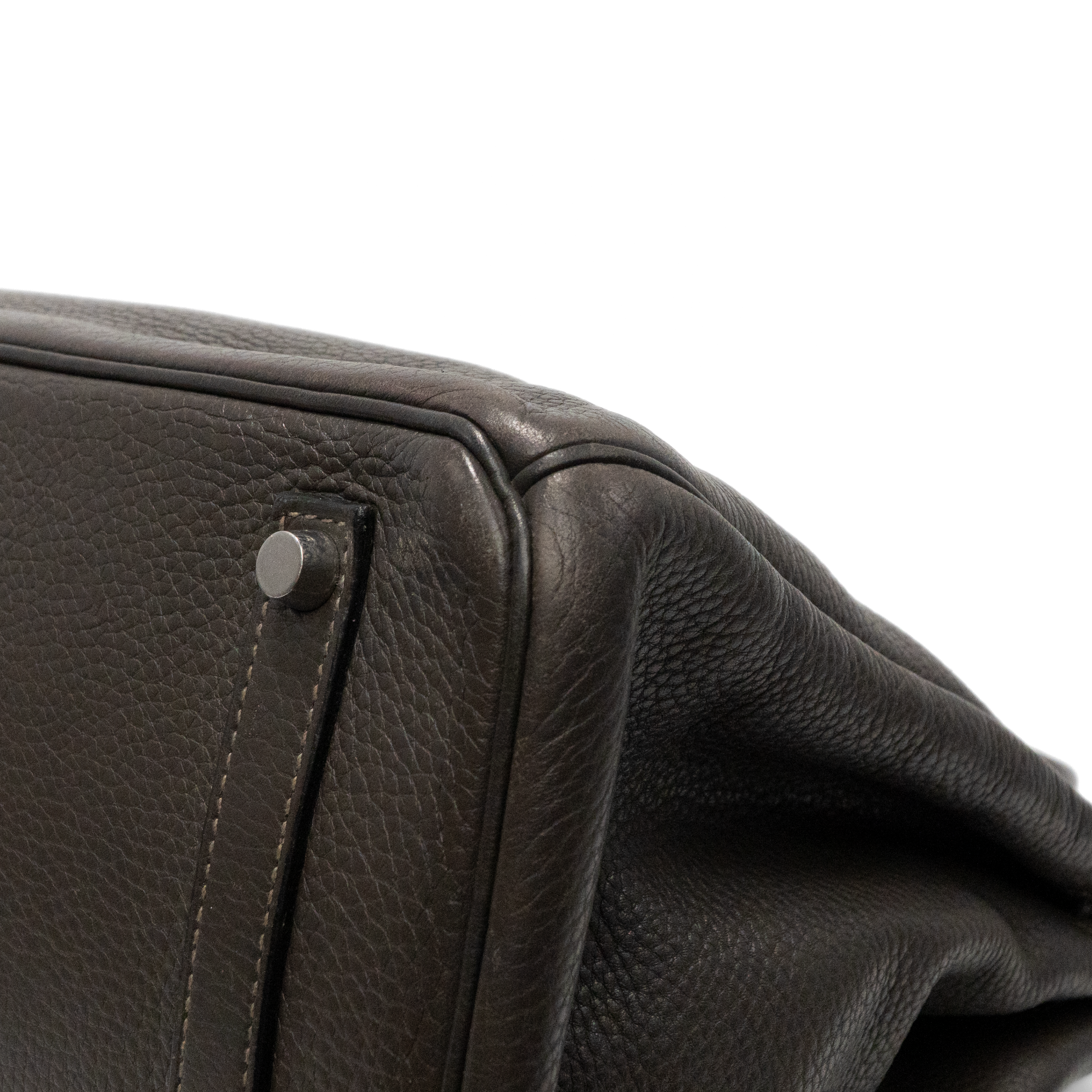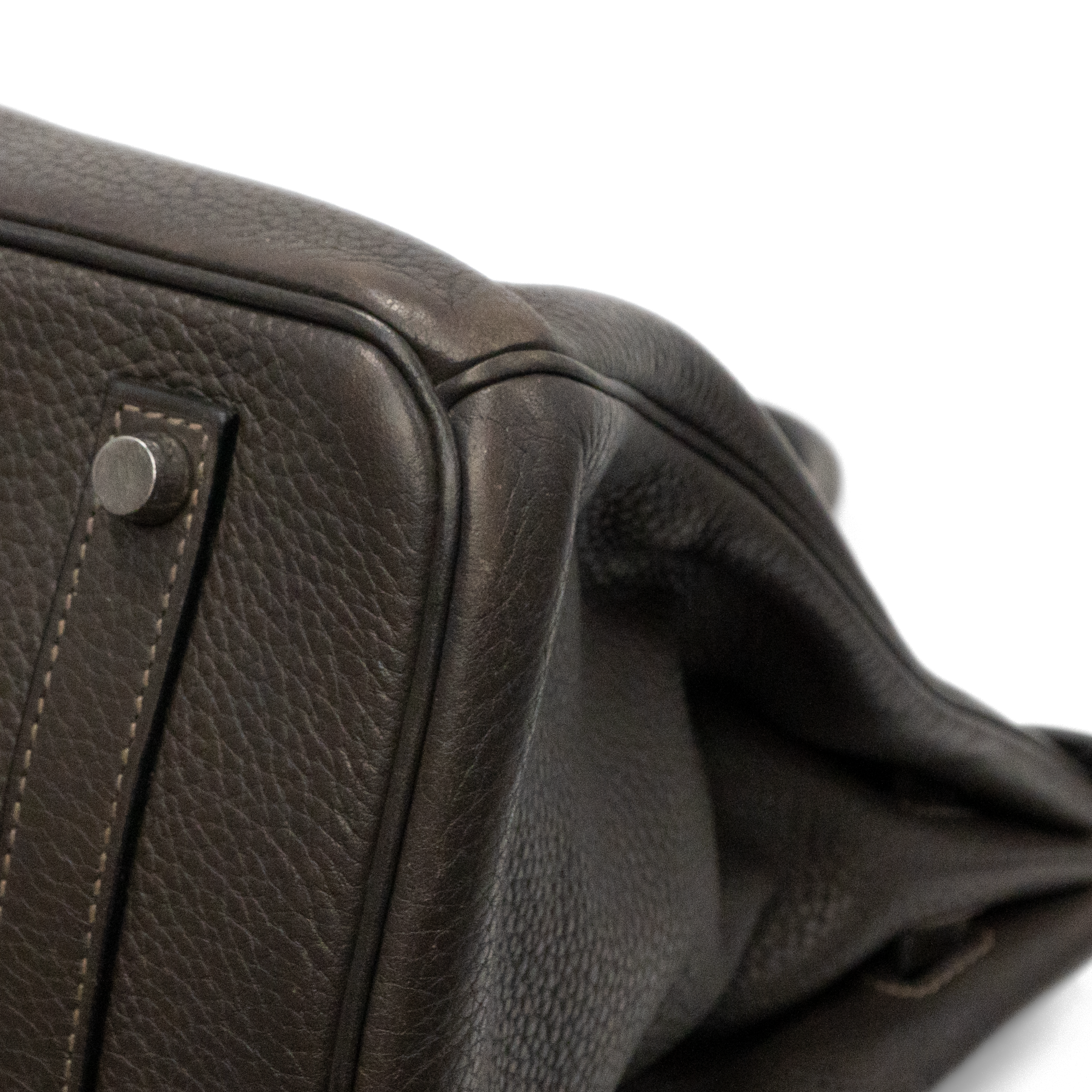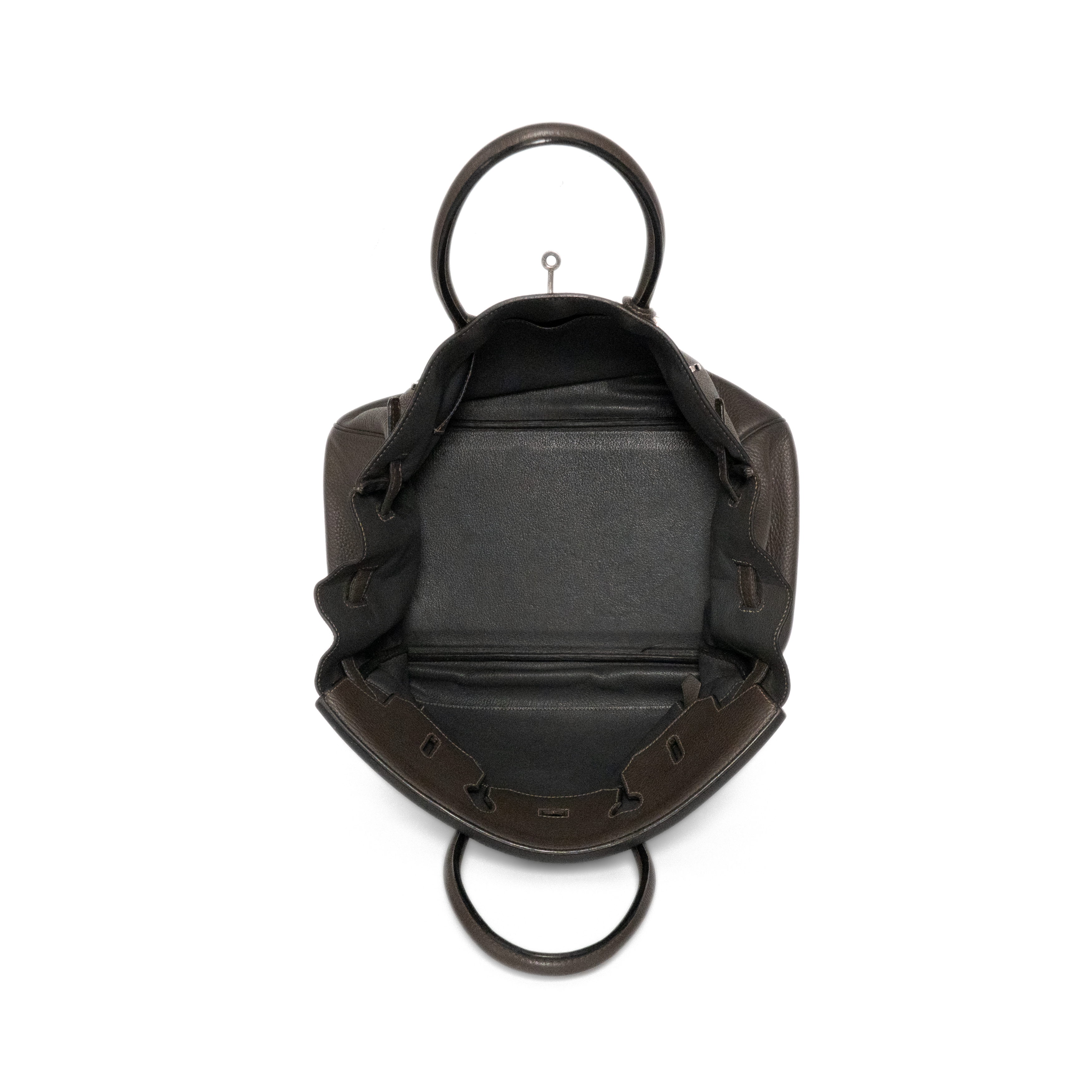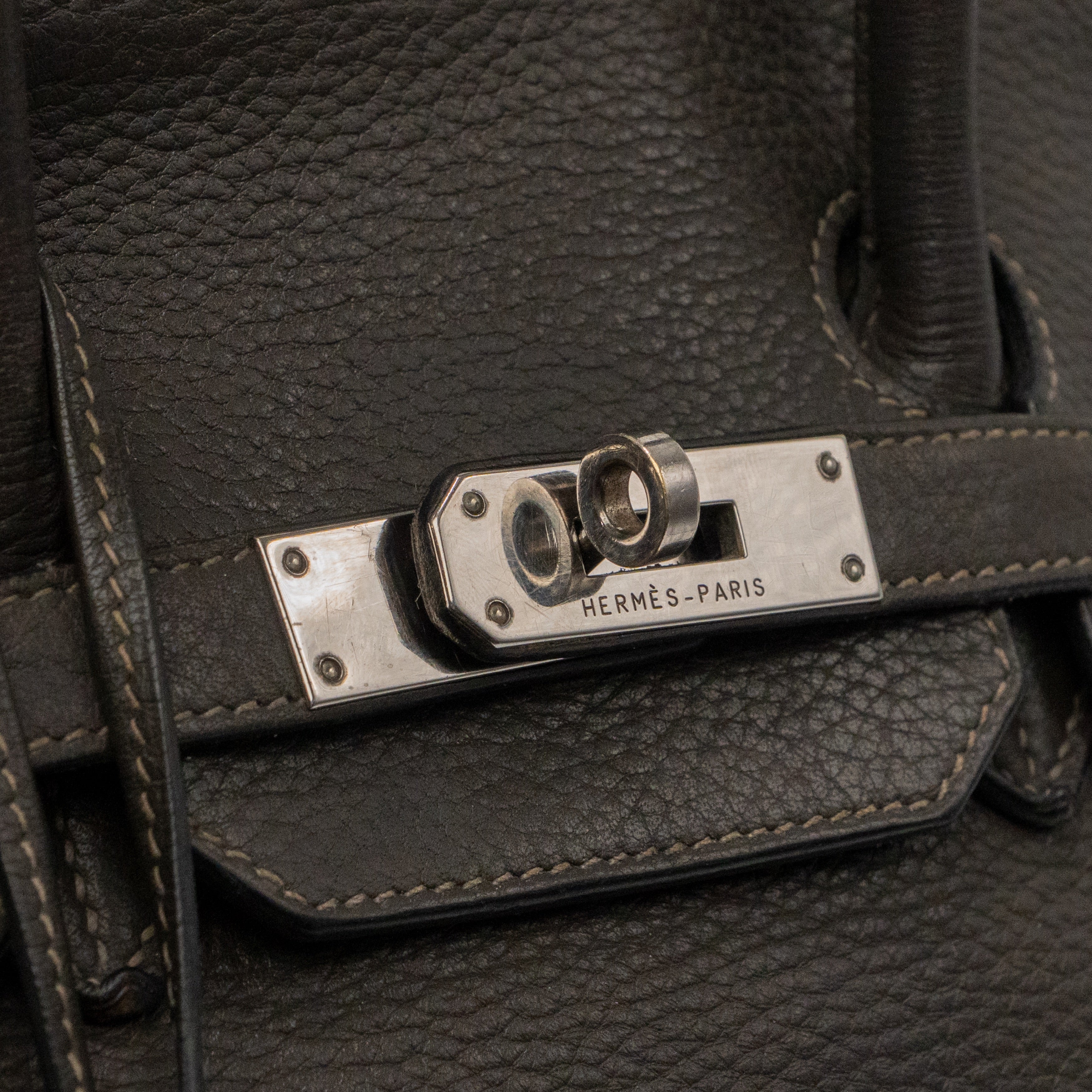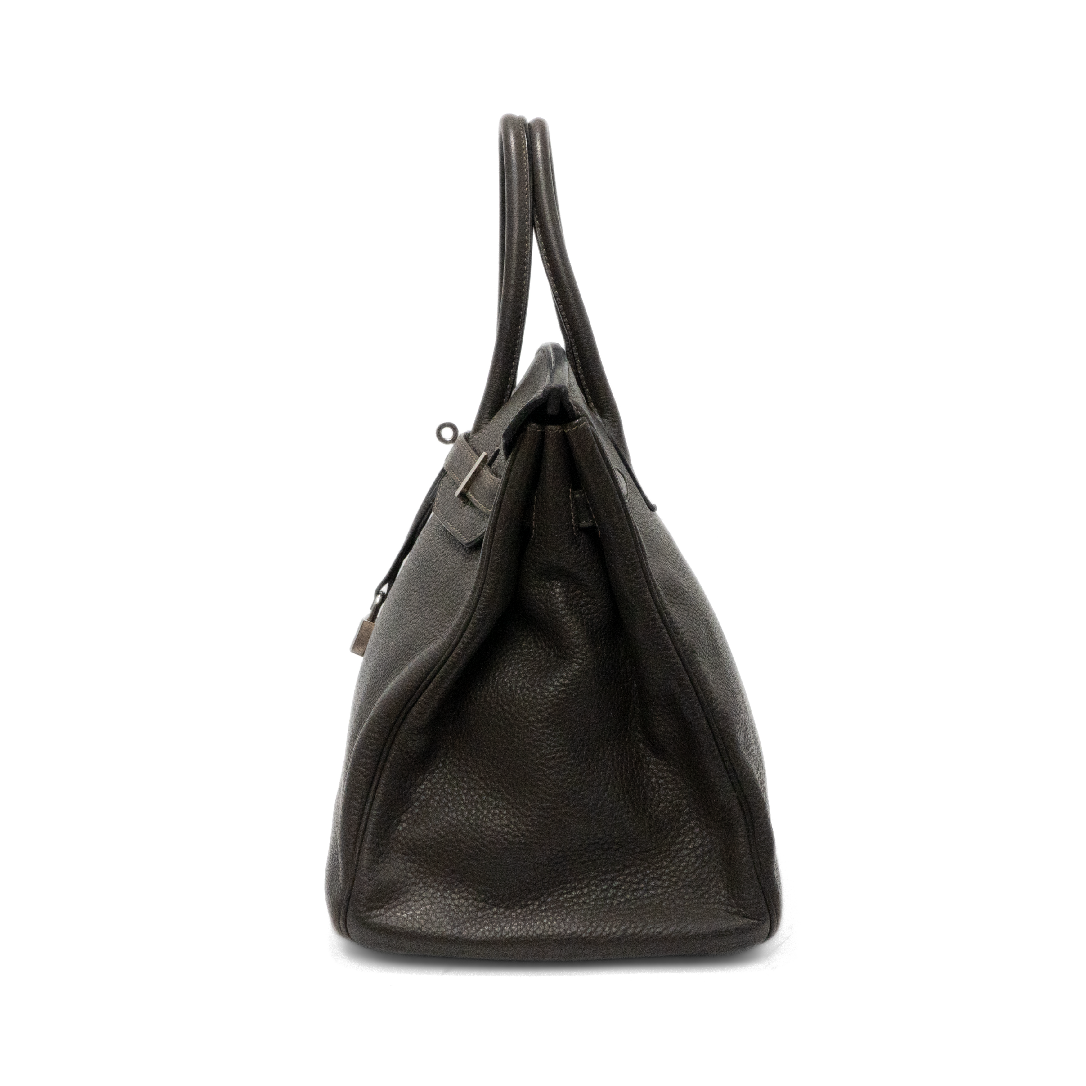 Hermes 'Birkin 35' handbag in grey 'Gris Meyer' clemence leather with palladium hardware and dual rolled top handles. The bag has a flap closure with sangle straps that fasten with signature 'Kelly' turnlock. The interior is lined with grey goat leather.