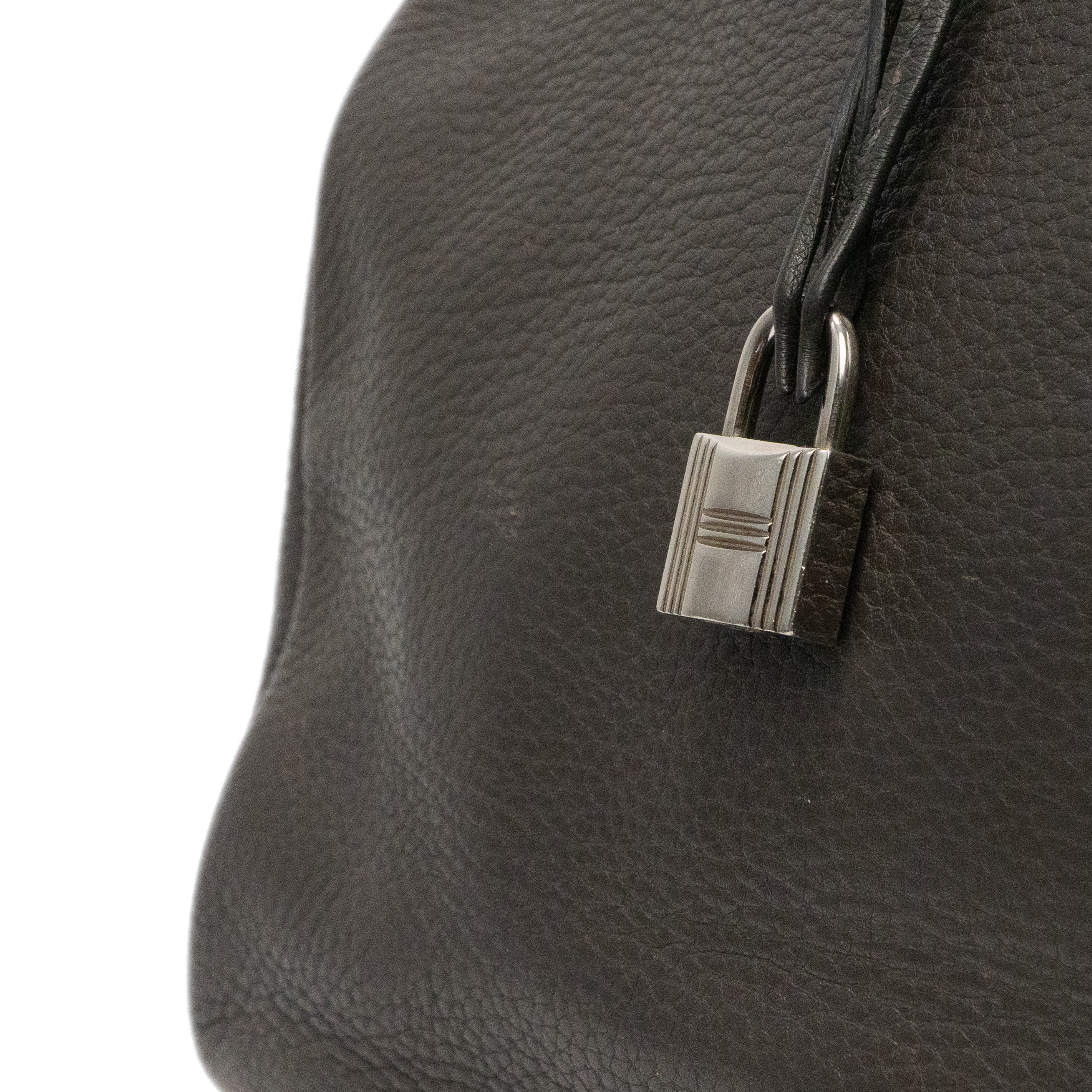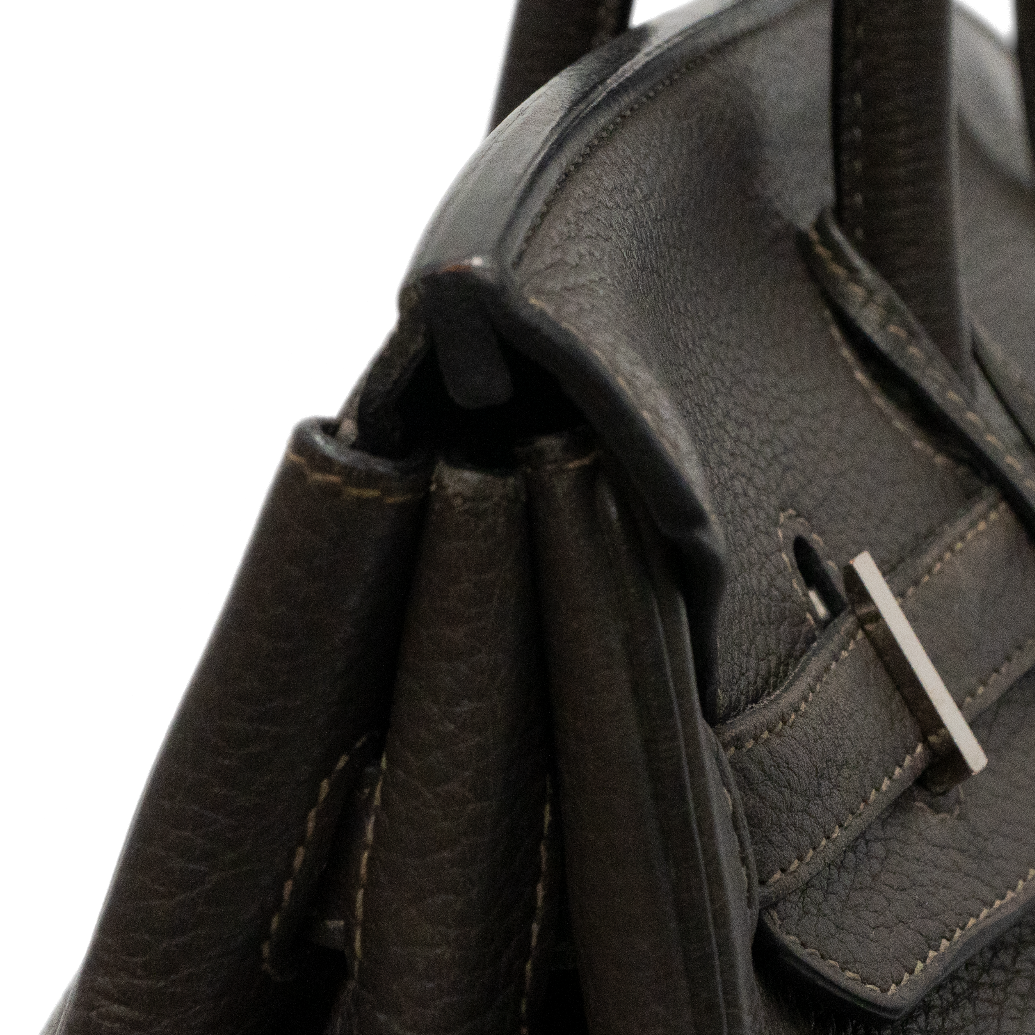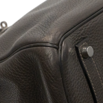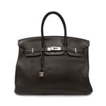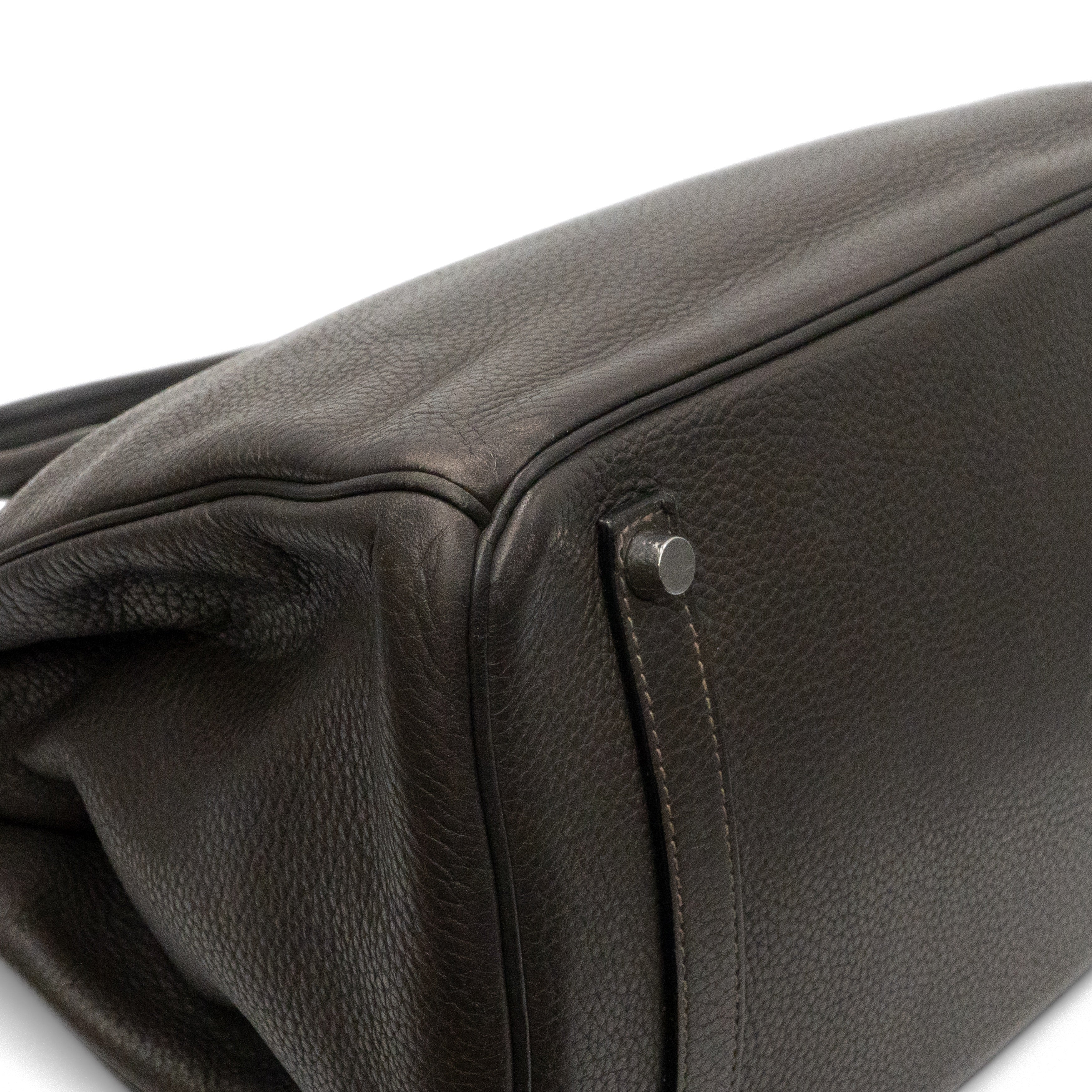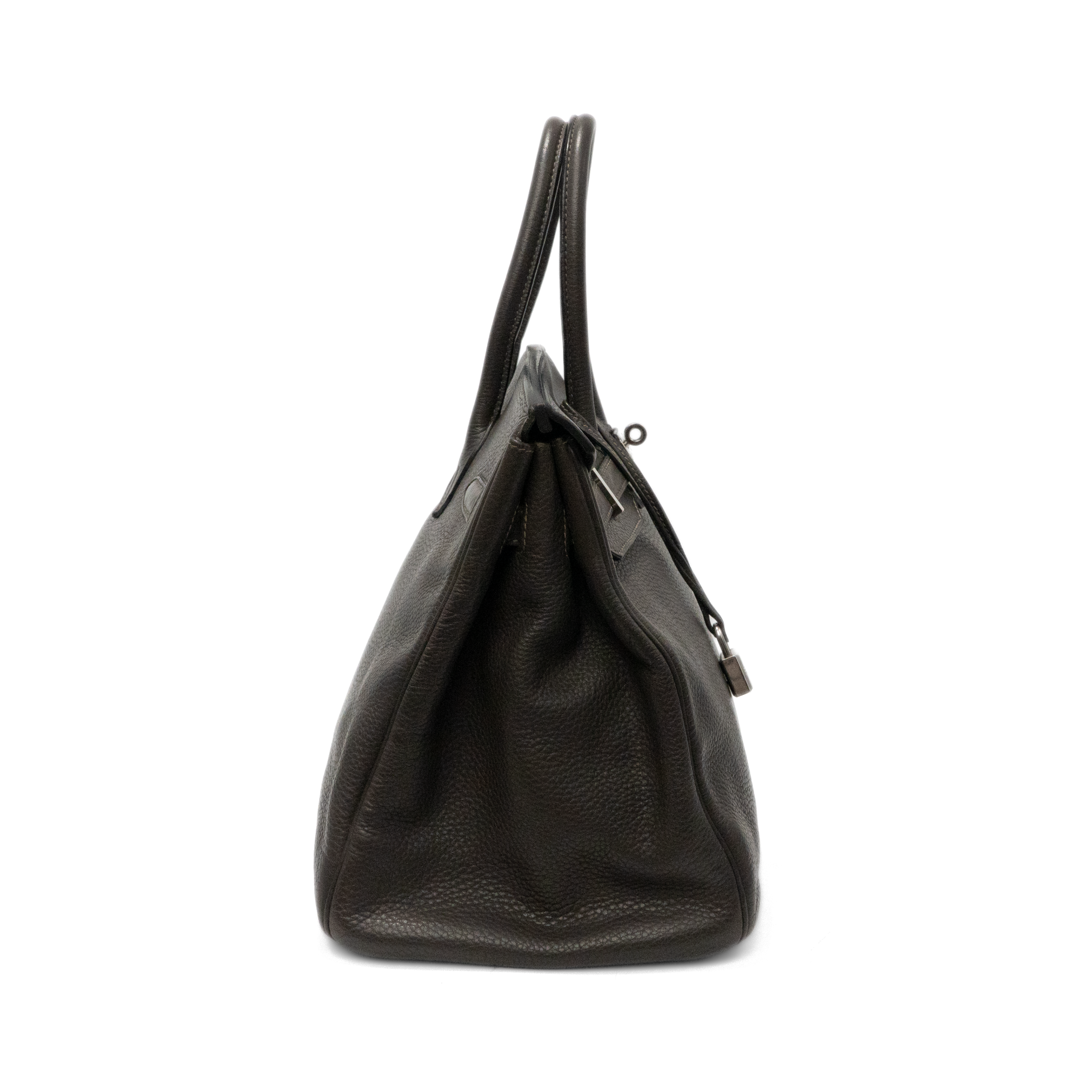 Hermes 'Birkin 35' handbag in grey 'Gris Meyer' clemence leather with palladium hardware and dual rolled top handles. The bag has a flap closure with sangle straps that fasten with signature 'Kelly' turnlock. The interior is lined with grey goat leather.