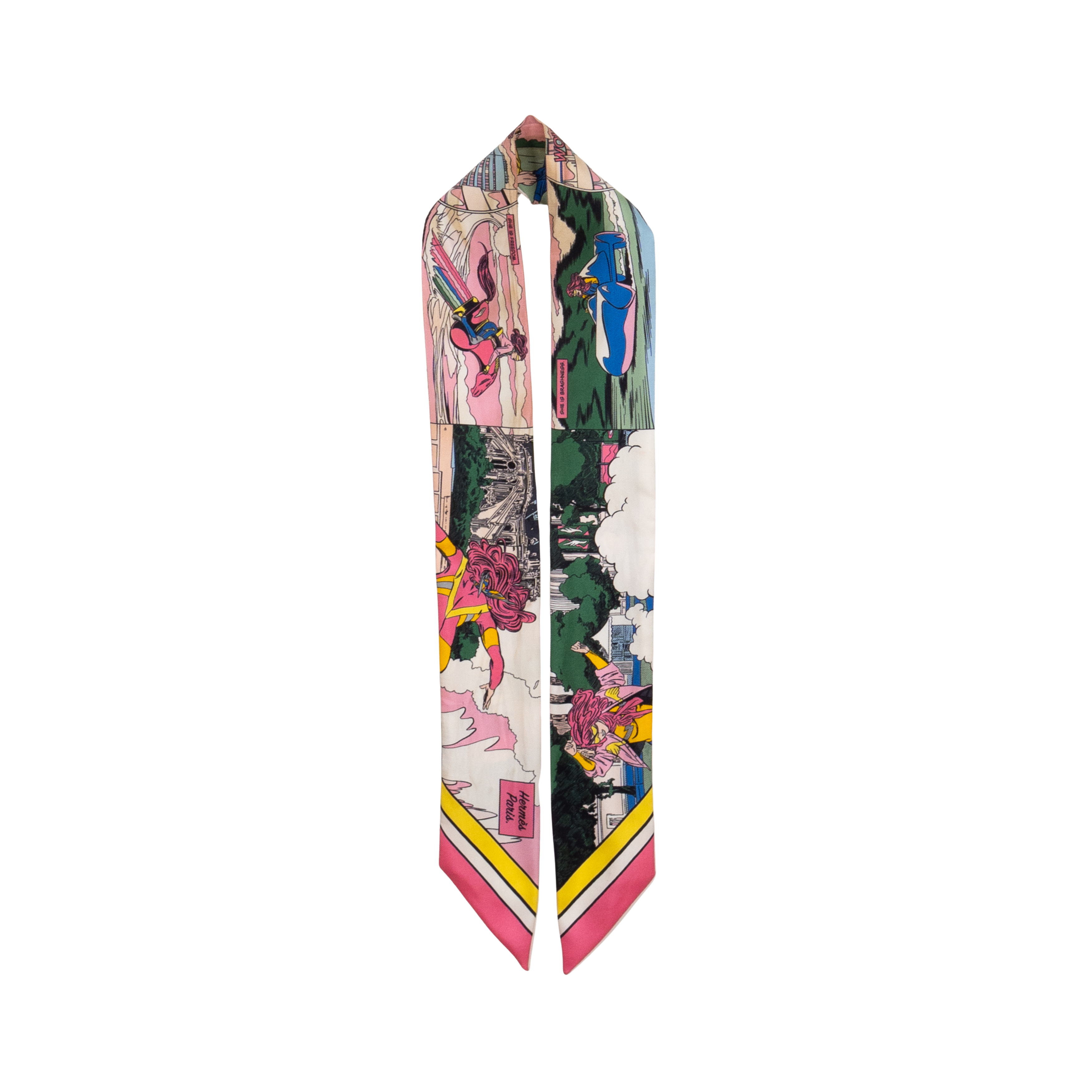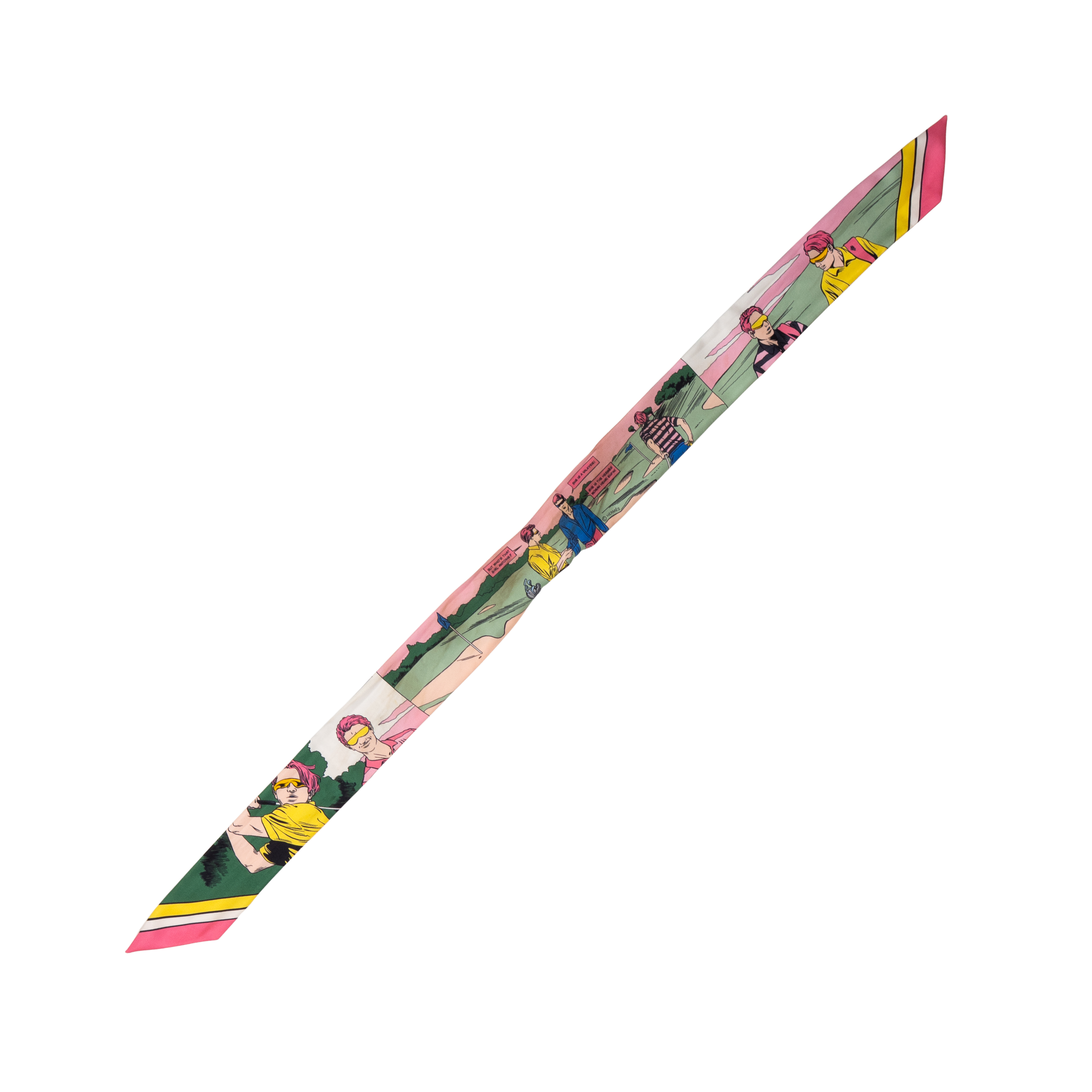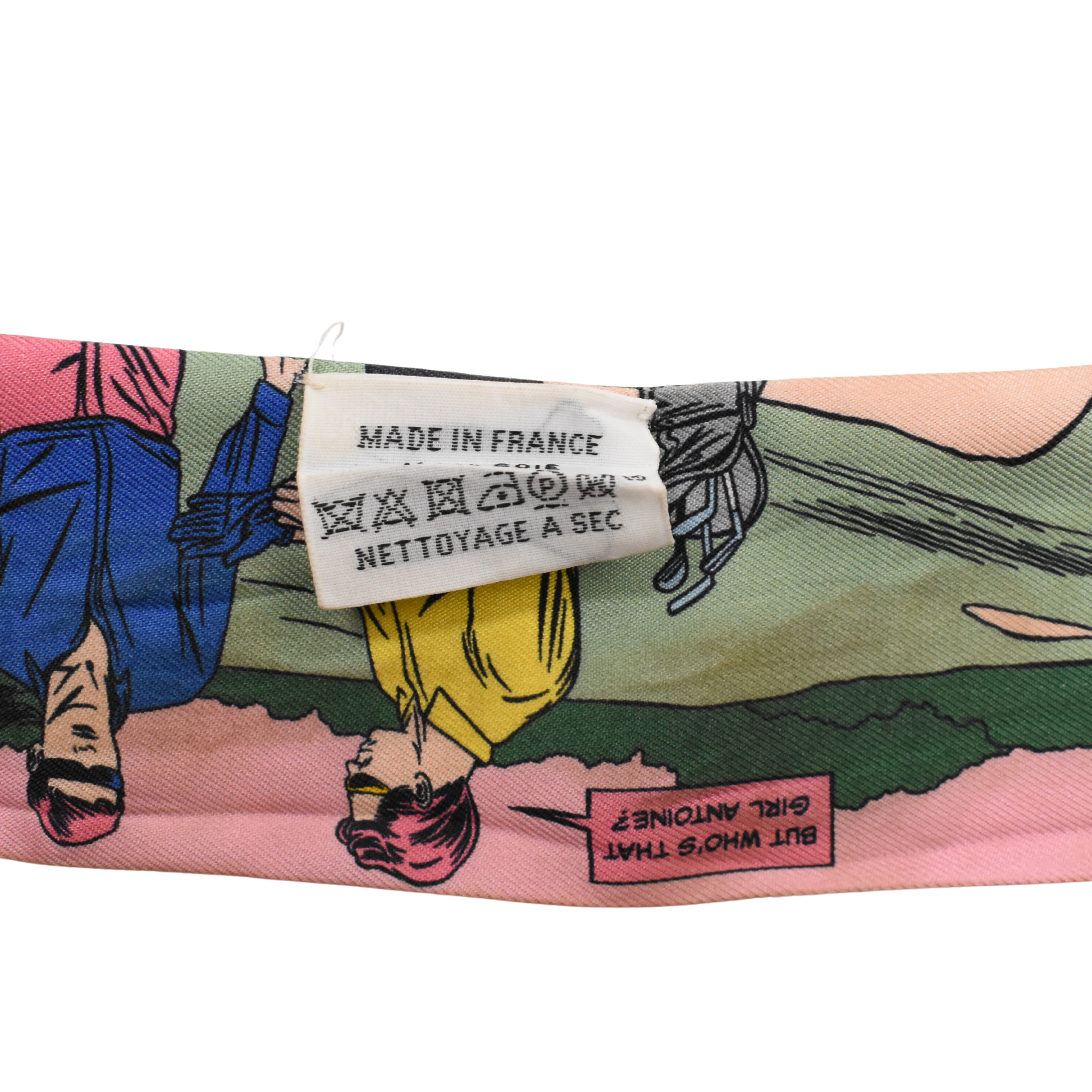Hermes 'Wow' twilly scarf in multicolour silk with an all-over golf comic strip print.