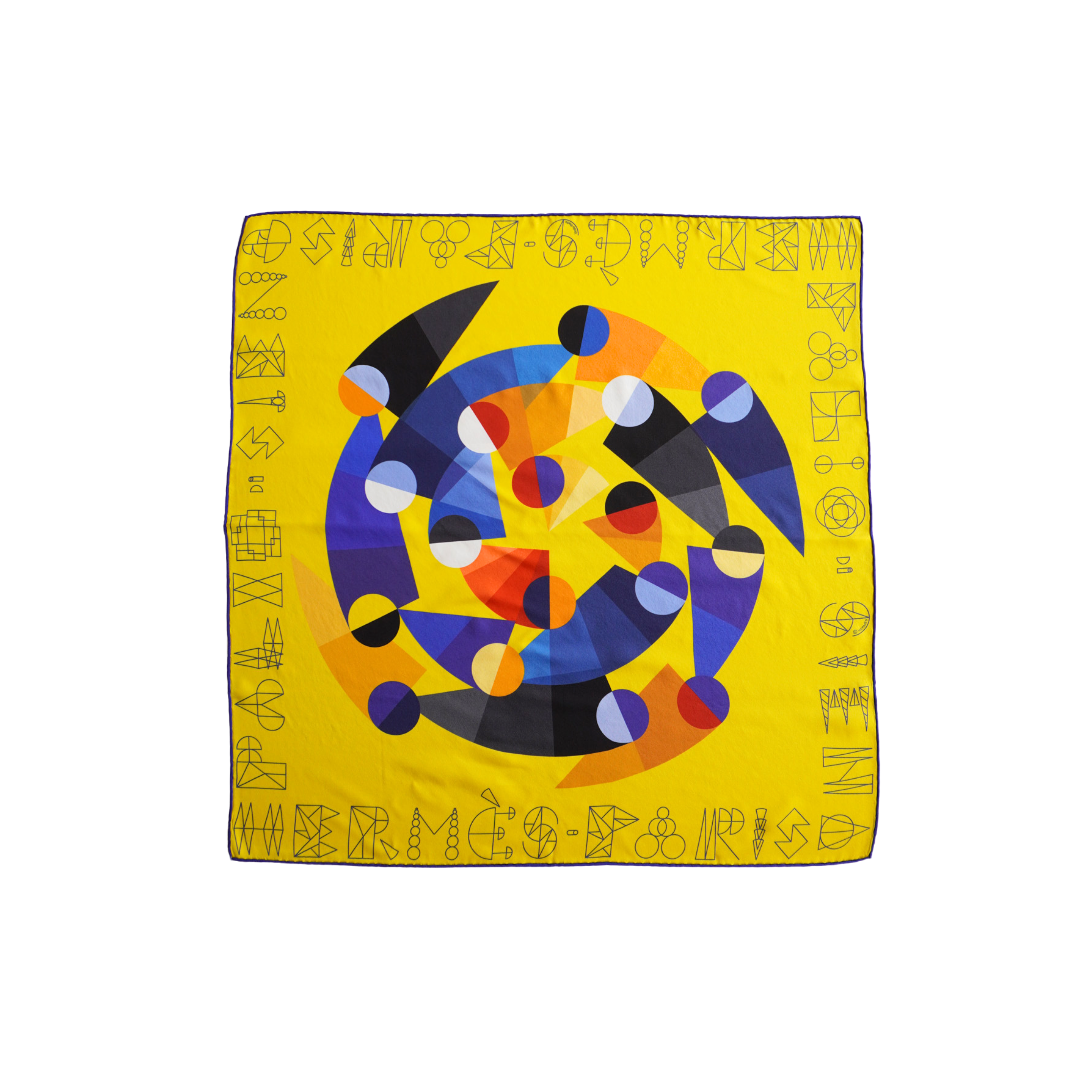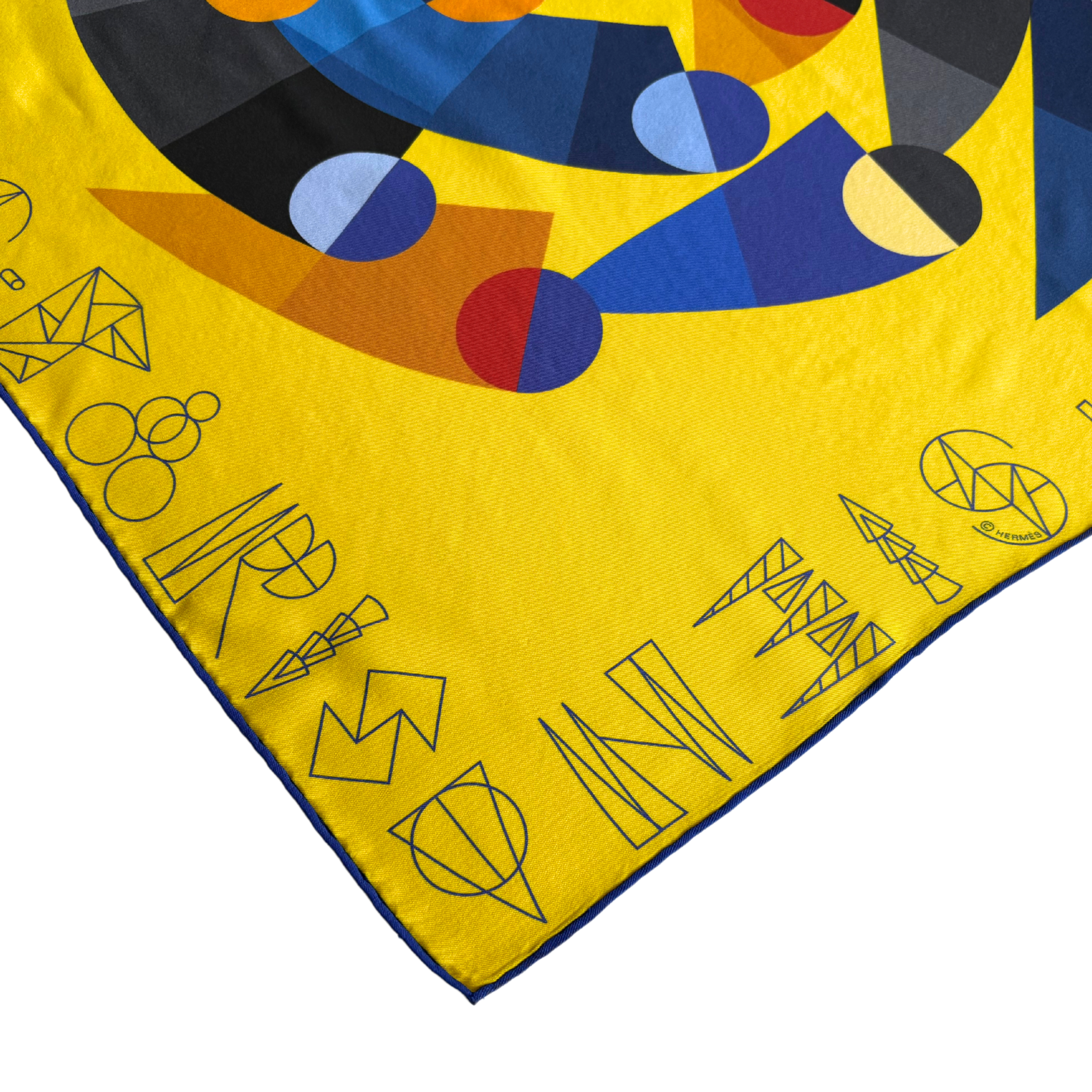Hermes 'Palio di Siena 70' yellow silk scarf with blue trim and a multicoloured geometric print.