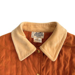 Hermes 'Caban' vintage jacket in an orange tufted poly-blend with gold snap buttons, large front pockets, and a yellow velour collar.