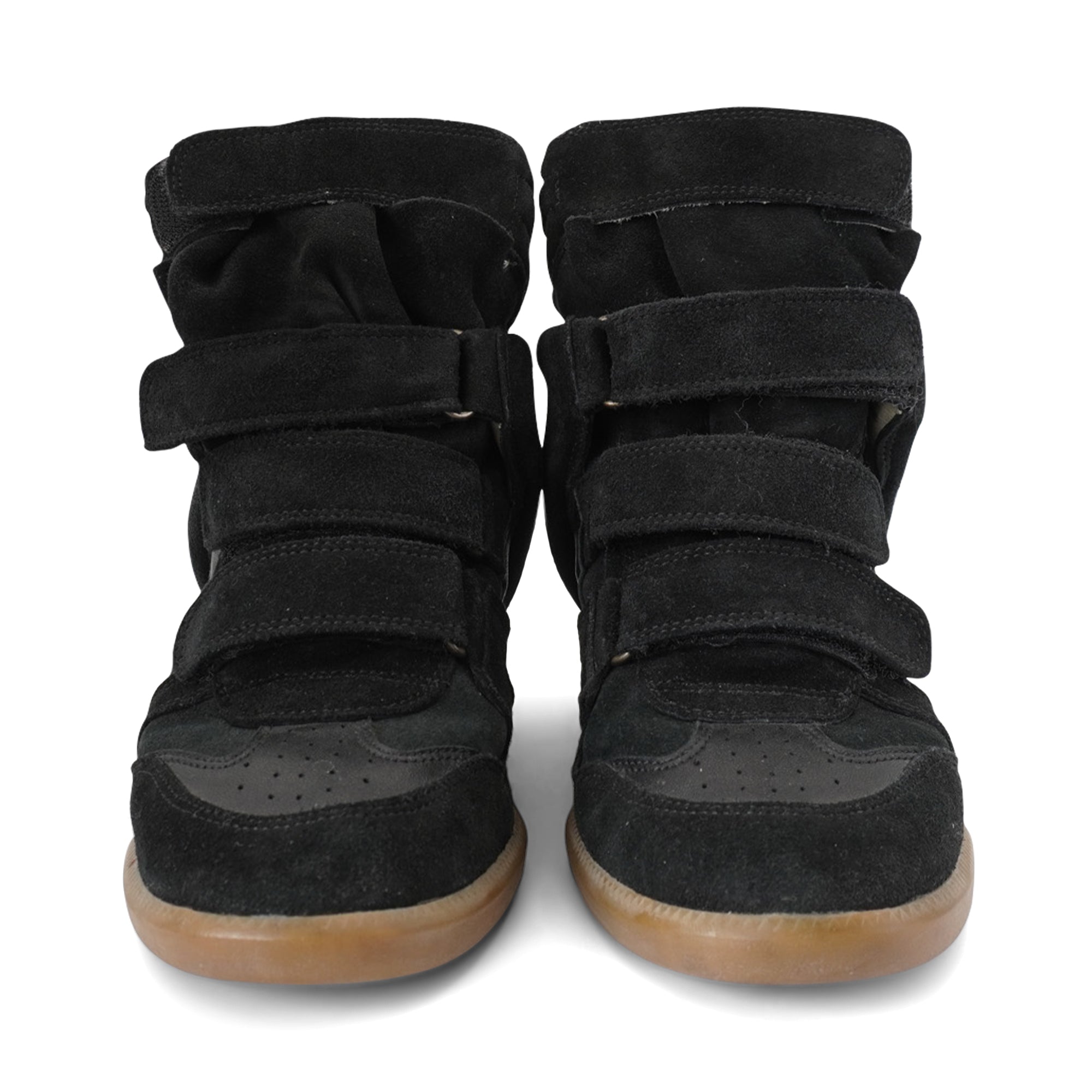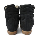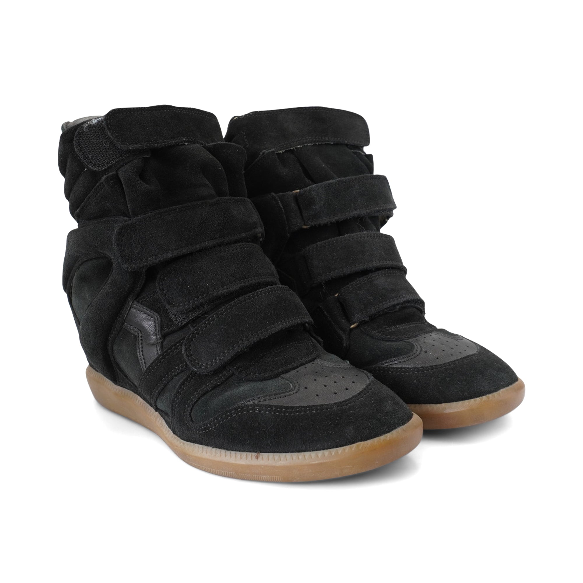 Isabel Marant 'Bekett' wedge sneakers in black suede and leather with velcro straps, a puffy tongue, and gum soles.