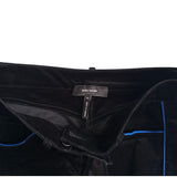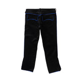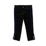 Isabel Marant capri pants in black velvet with bright blue piping trim and ornate gunmetal buttons at the hem.