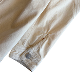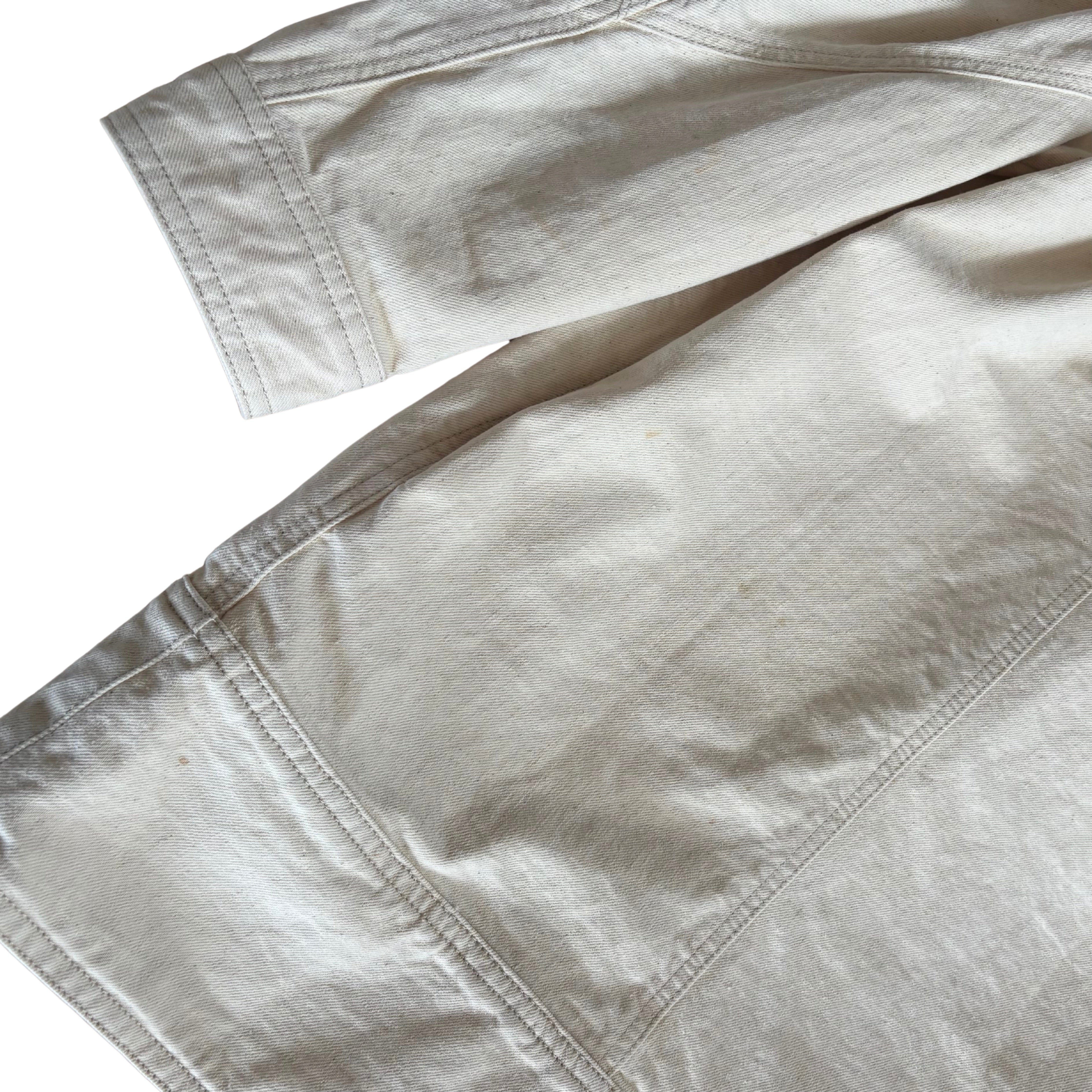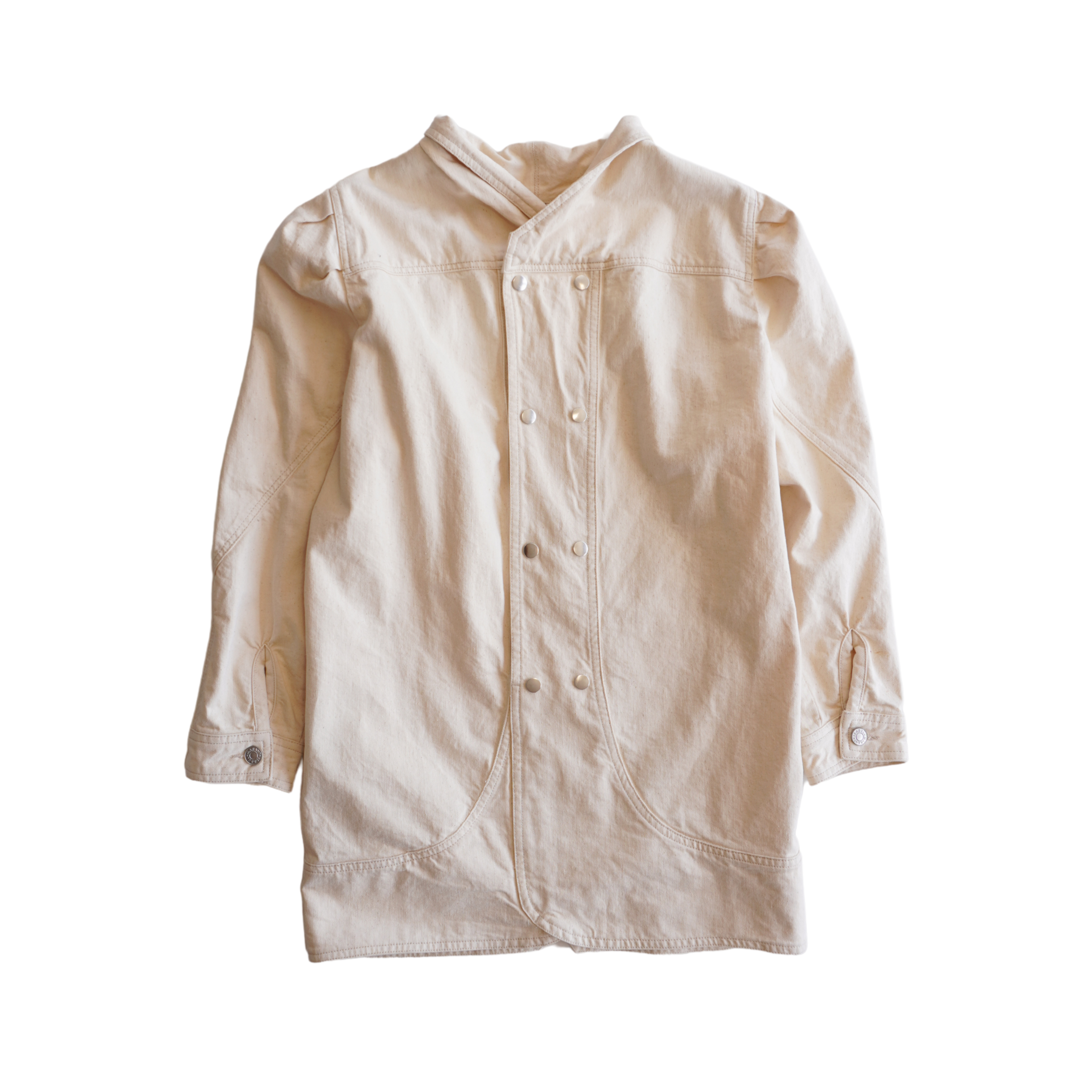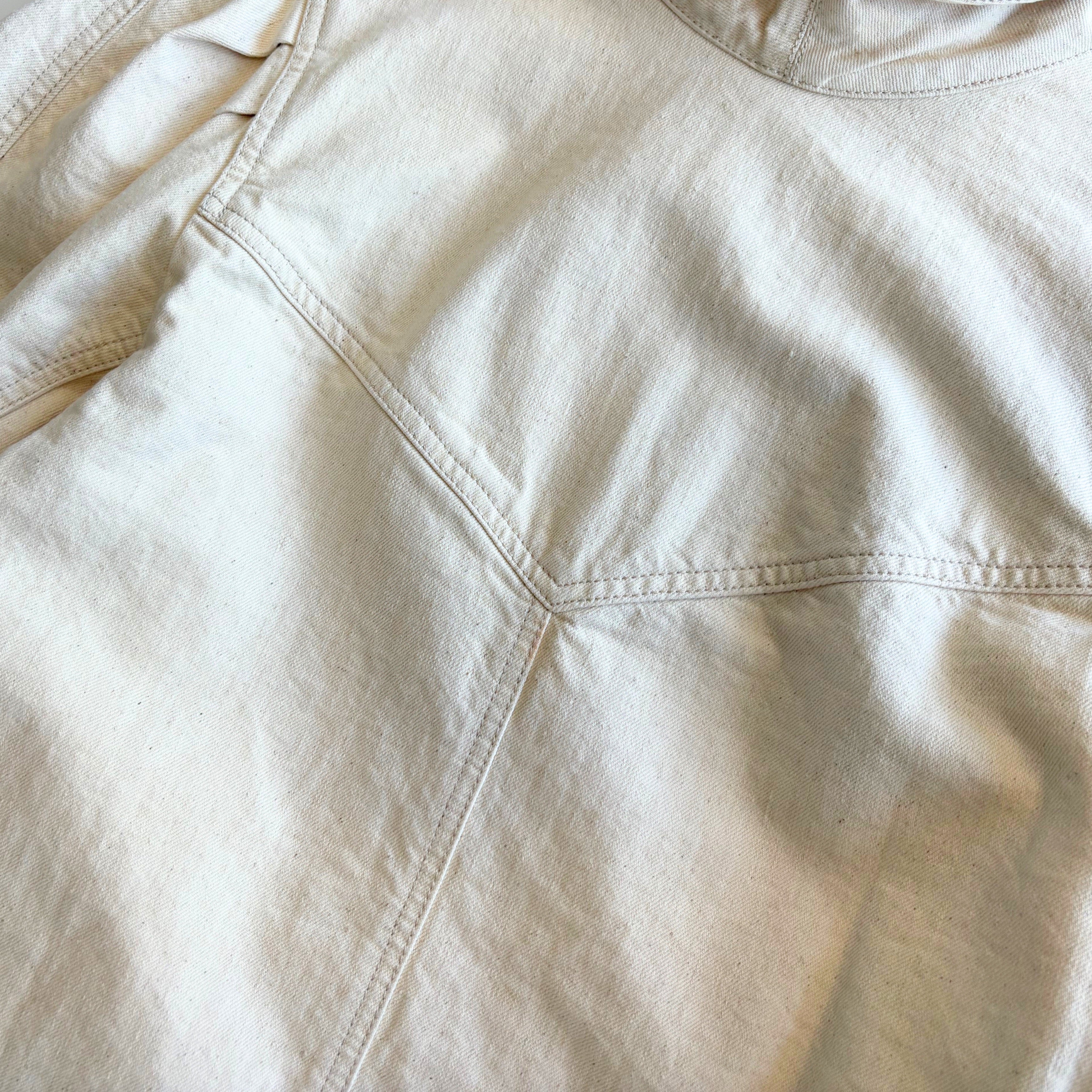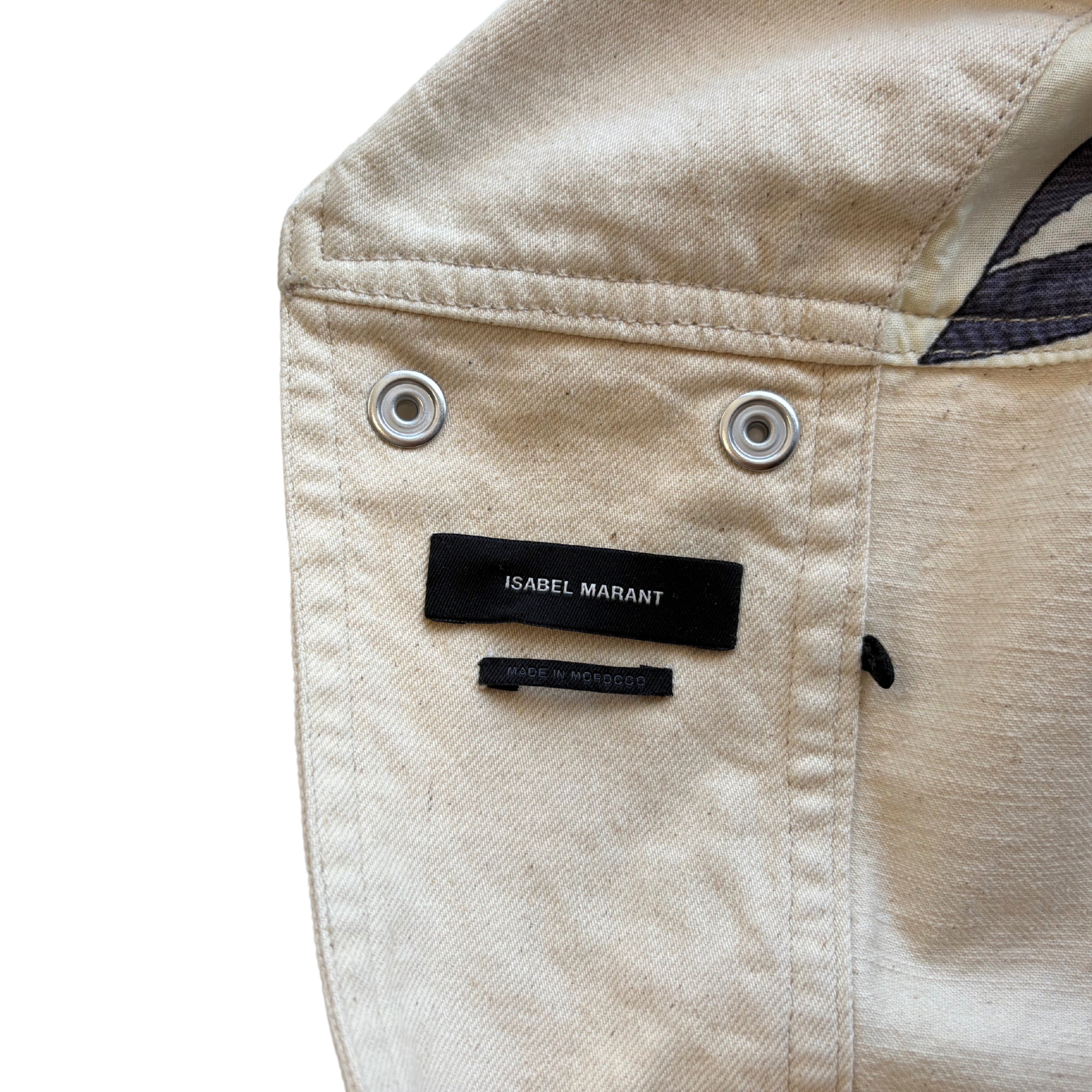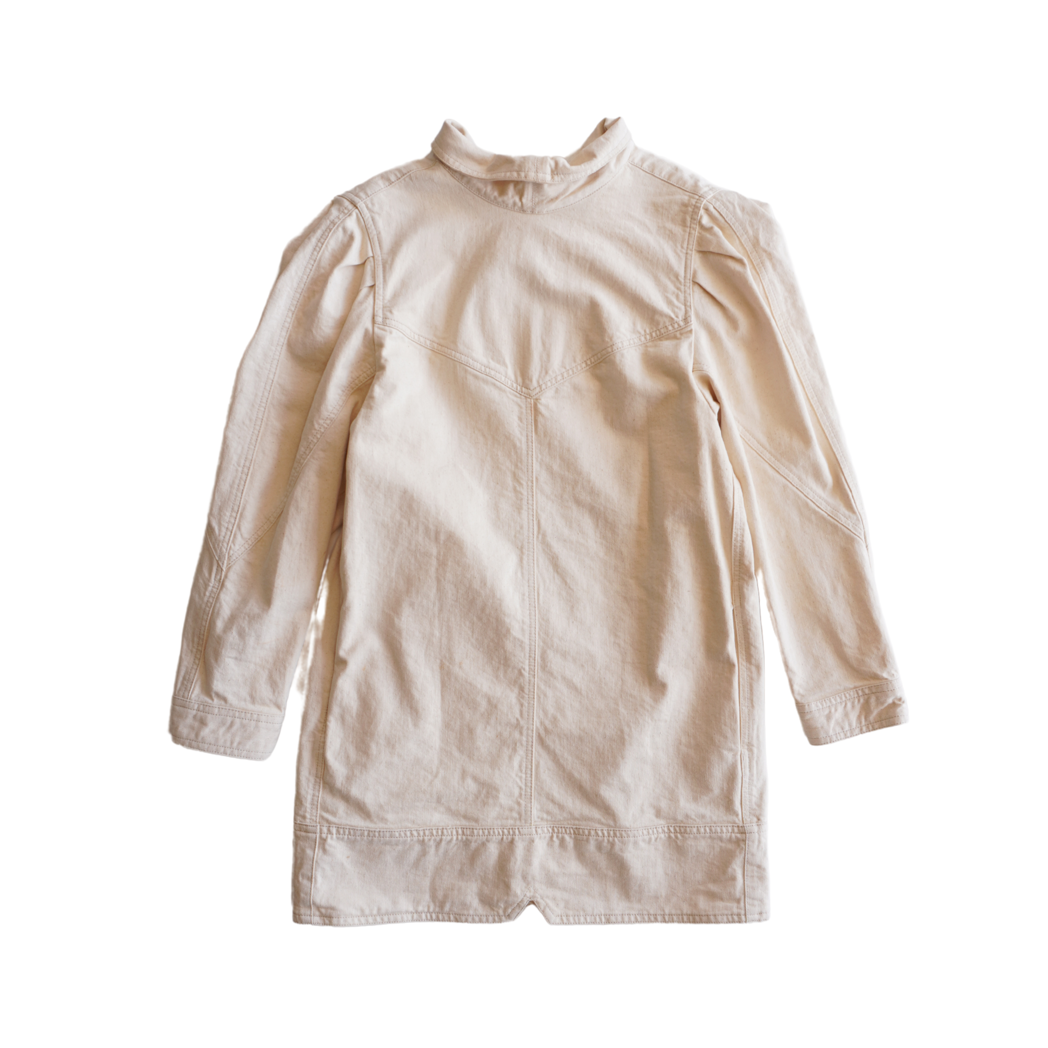 Isabel Marant 'Espera' mini dress in cream denim with rounded panelling, puff sleeves, a rolled collar, and silver snap button closures down the back.