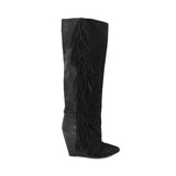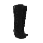 Isabel Marant 'Manly' knee-high boots in black suede and leather with a fringe trim down the sides, a wedge heel, and an almond toe.