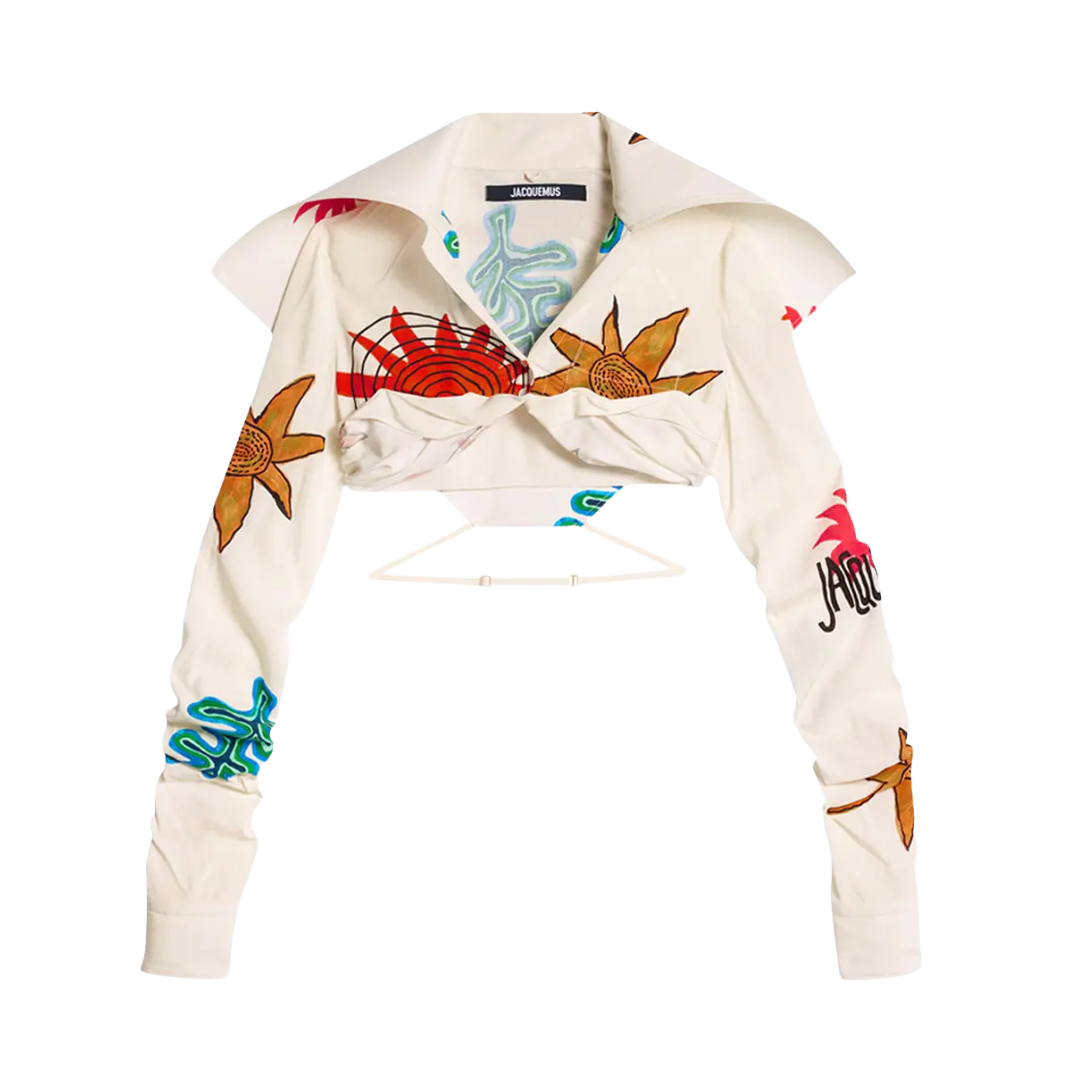 Jacquemus 'La Chemise Meio' cropped shirt in 'Print Beige Arty Sun' print all over. Features extended collar/cape in the back with a strap that goes around the waist at the bottom, two buttons on the front, gathered seams on sleeves, and a pointed collar.