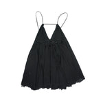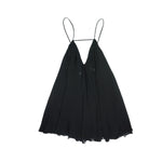 Jacquemus 'La Riveria' pleated mini a-line dress in black with spaghetti straps and v-neckline. Features a strap across the chest, a low back, and a hidden zip closure on the side.