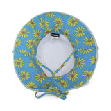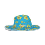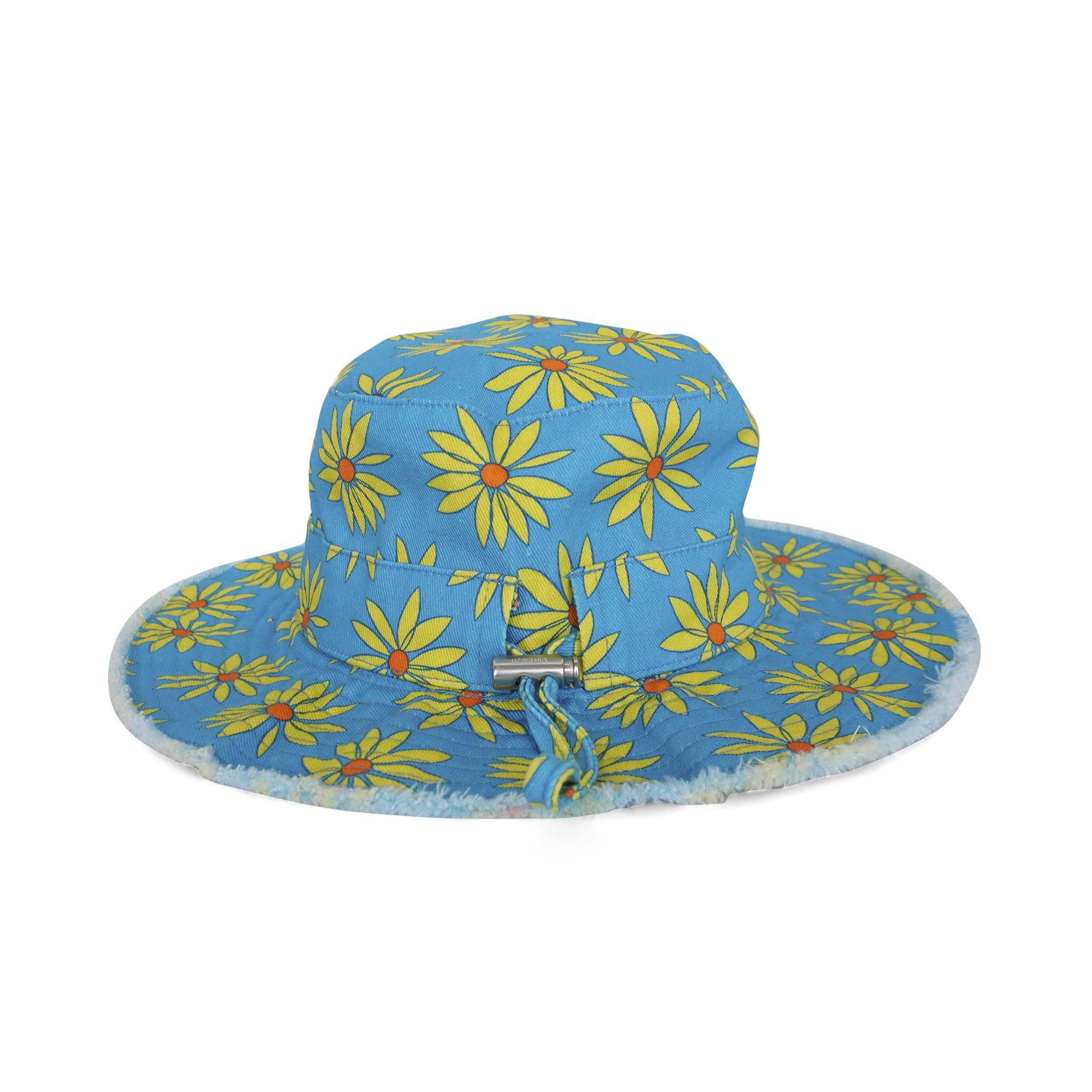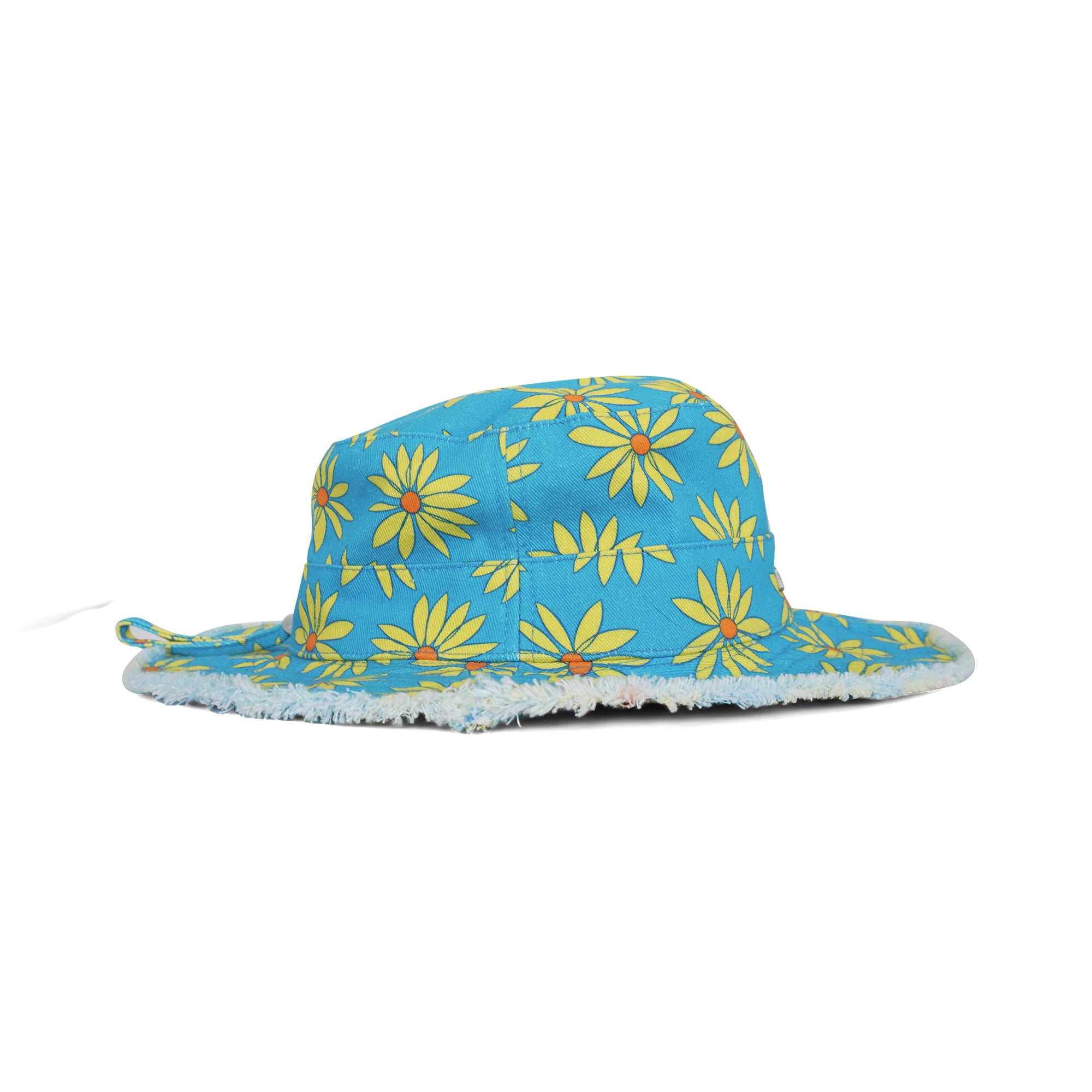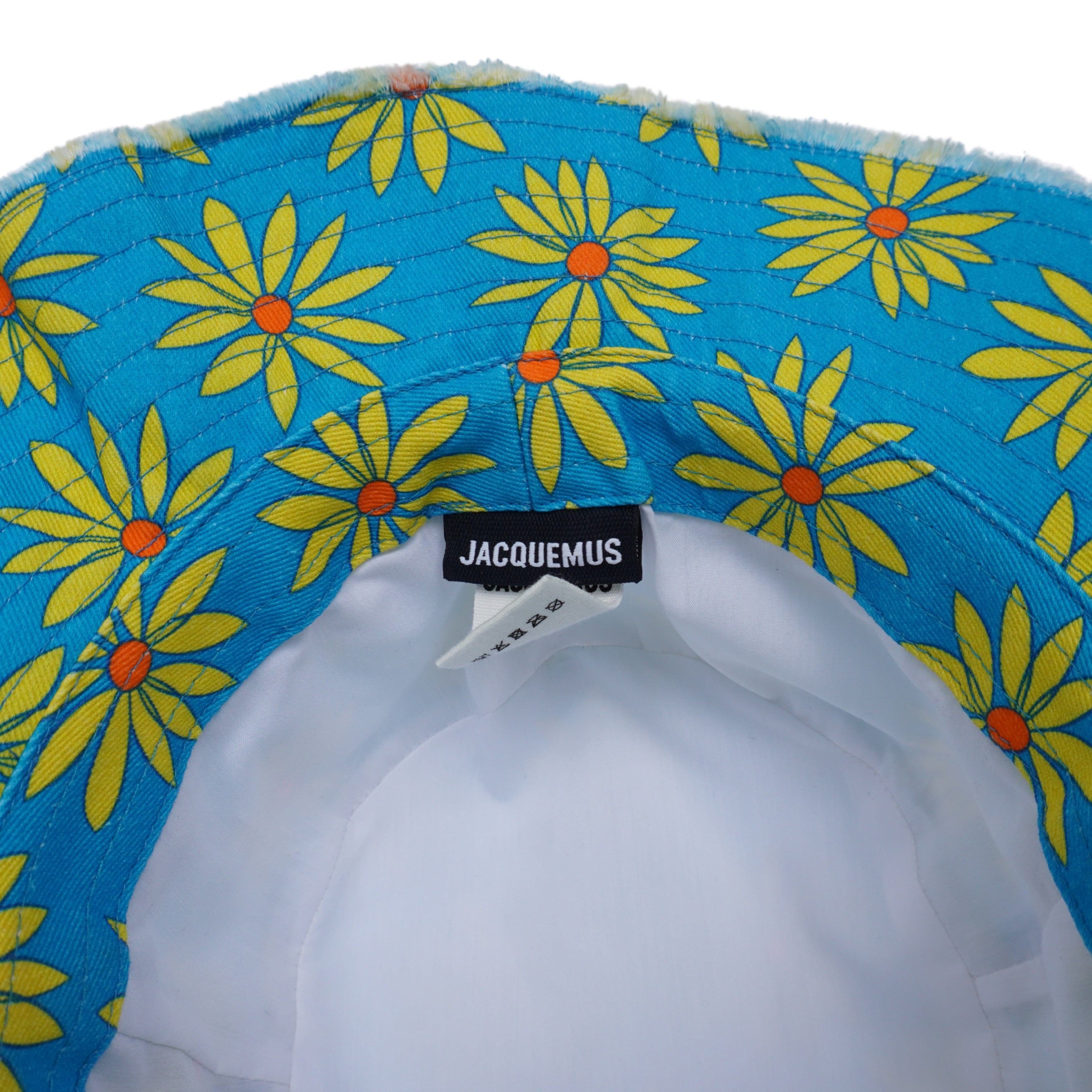 Jacquemus 'Le Bob Aritchaut' bucket hat in bright blue cotton with an all-over yellow and orange floral print, a silver logo plaque on the front, and a frayed trim. The hat has a drawstring tie at the back to adjust the size, and and a drawstring tie around the chin.