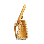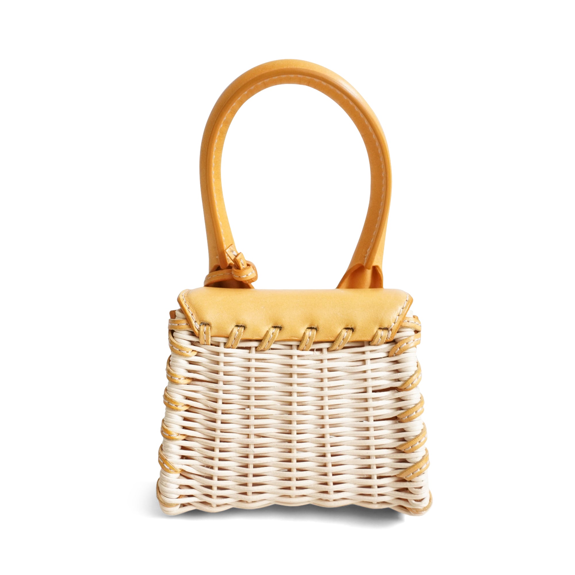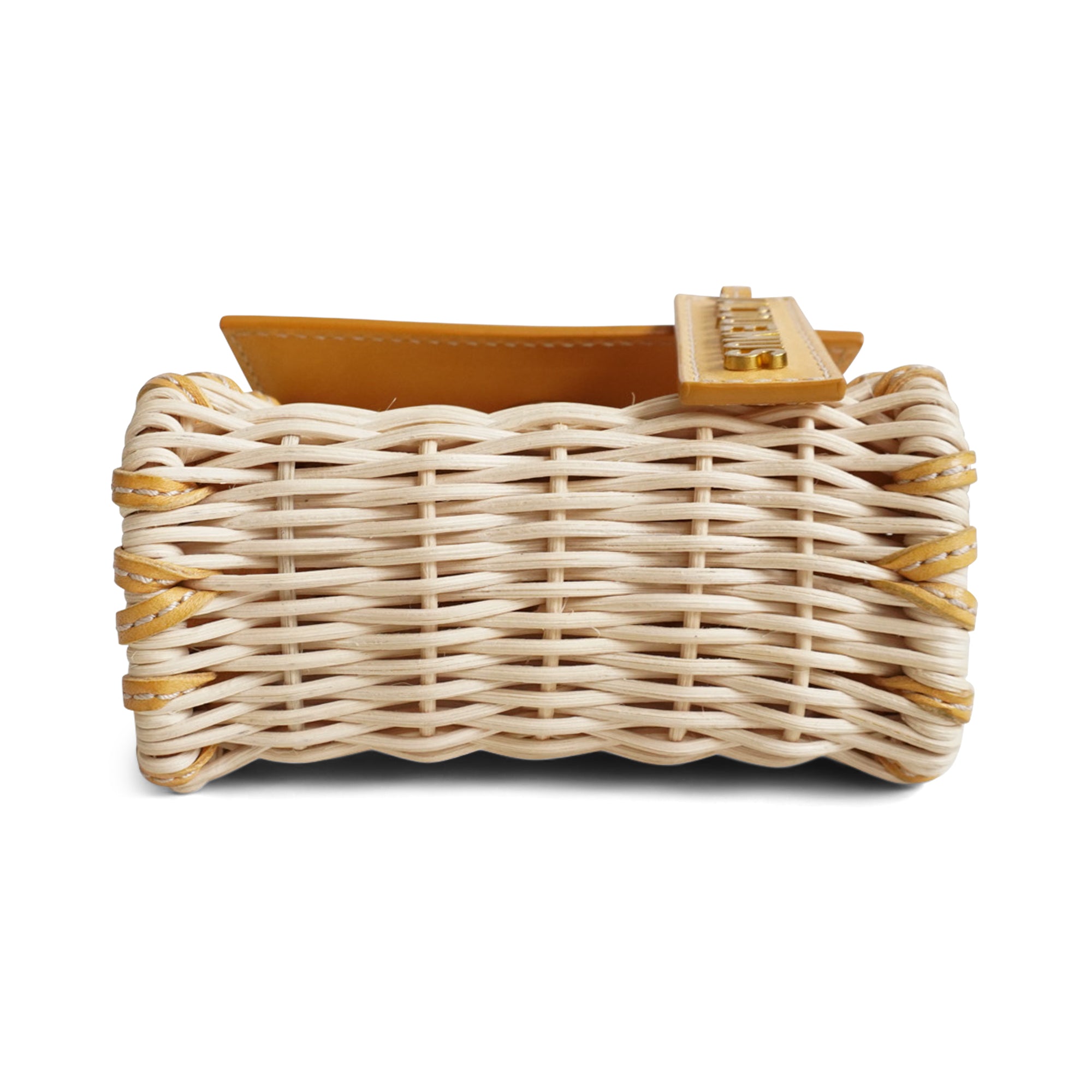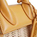Jacquemus 'Le Chiquito' mini handbag in natural wicker with honey beige leather handle and flap. Features a leather logo tag with gold hardware and a removable crossbody strap.