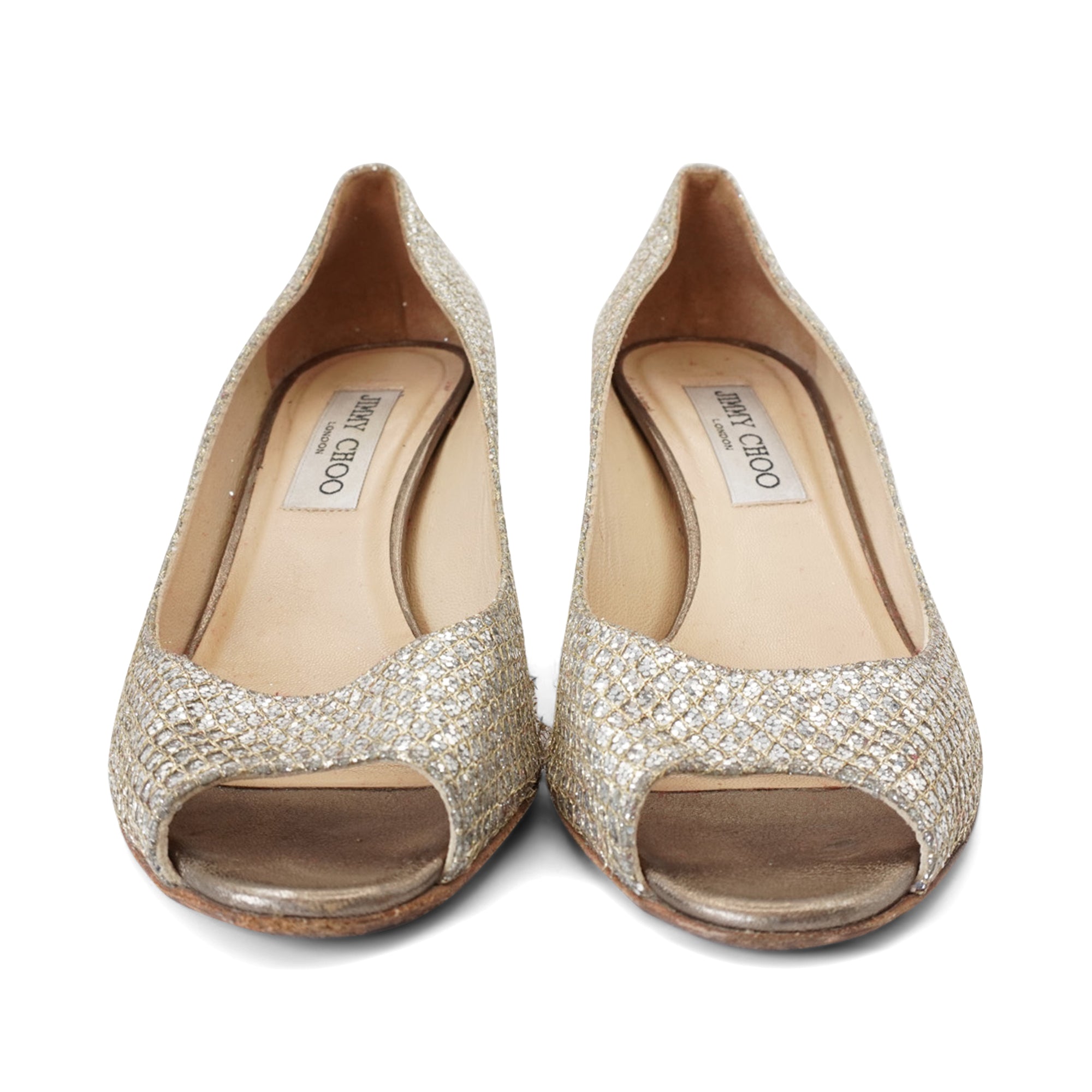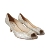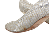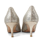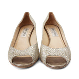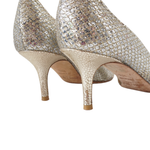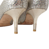 Jimmy Choo 'Isabel' peep toe heels in silver glitter with gold diamond quilt embroidered and metallic silver coated suede heels.