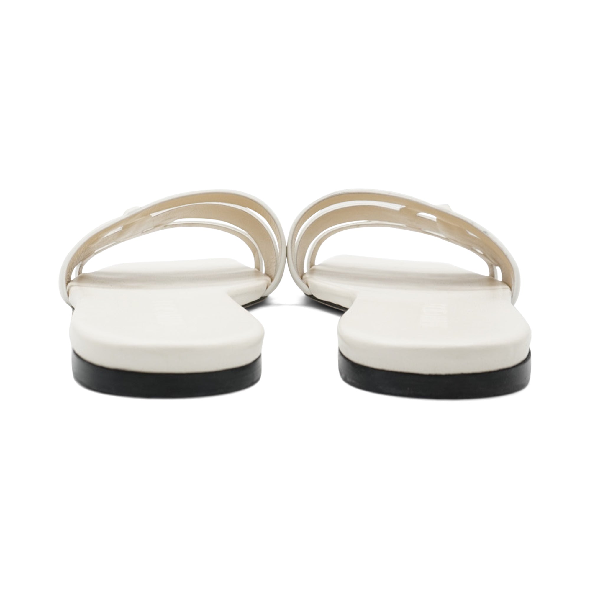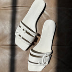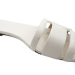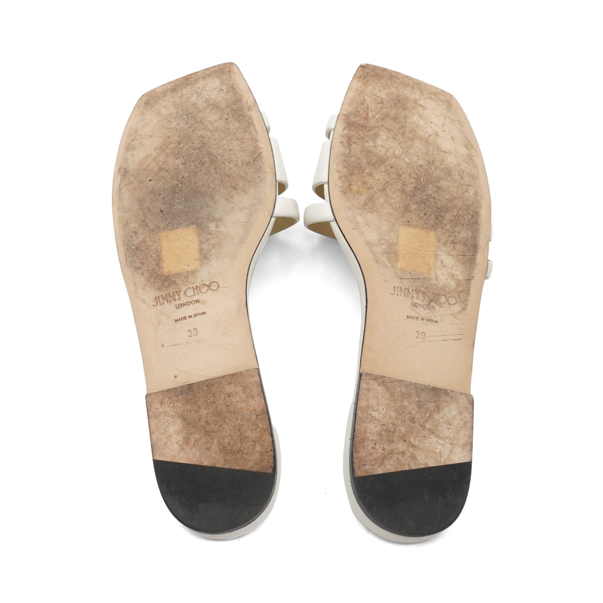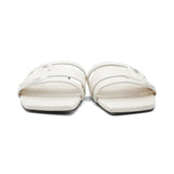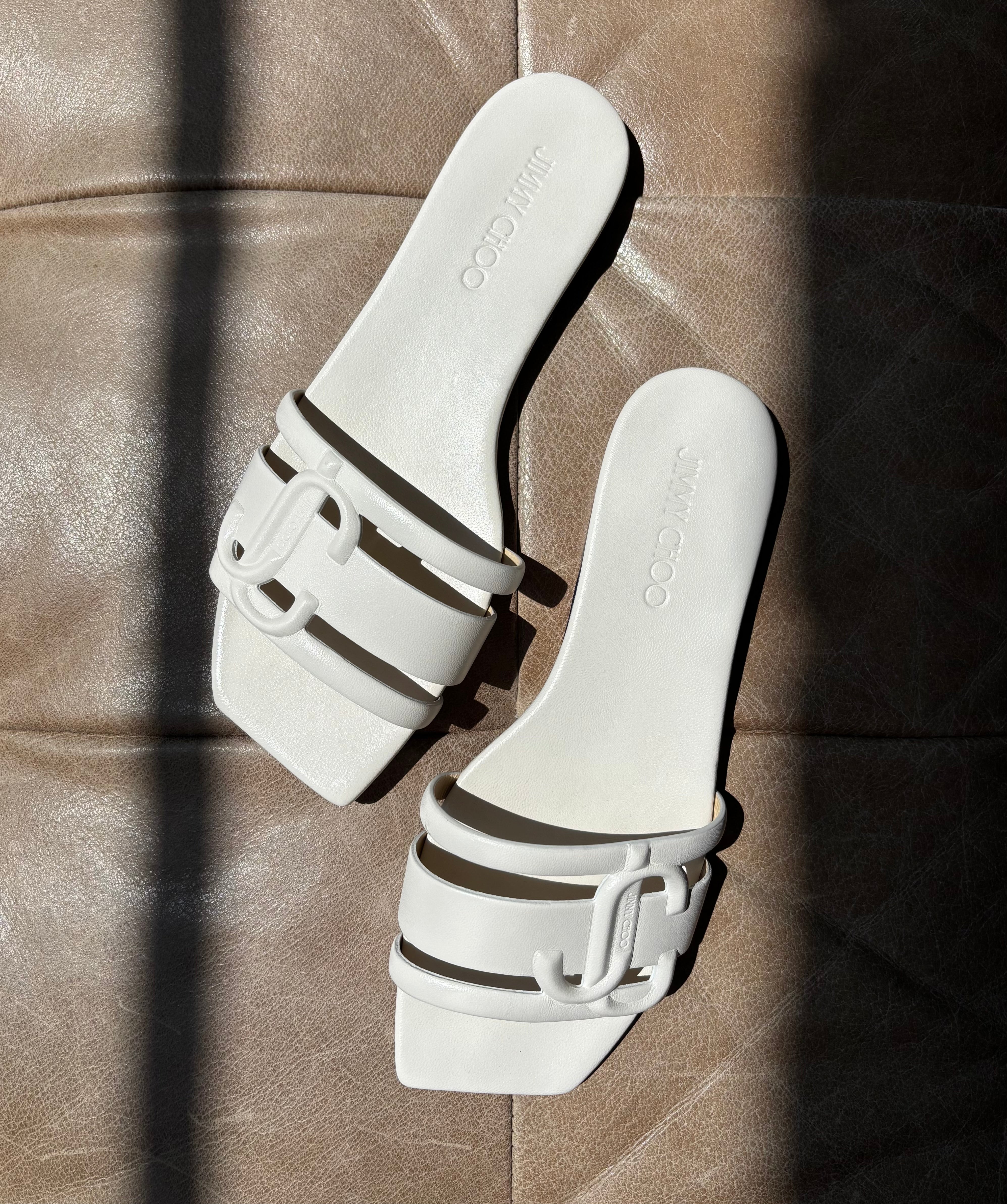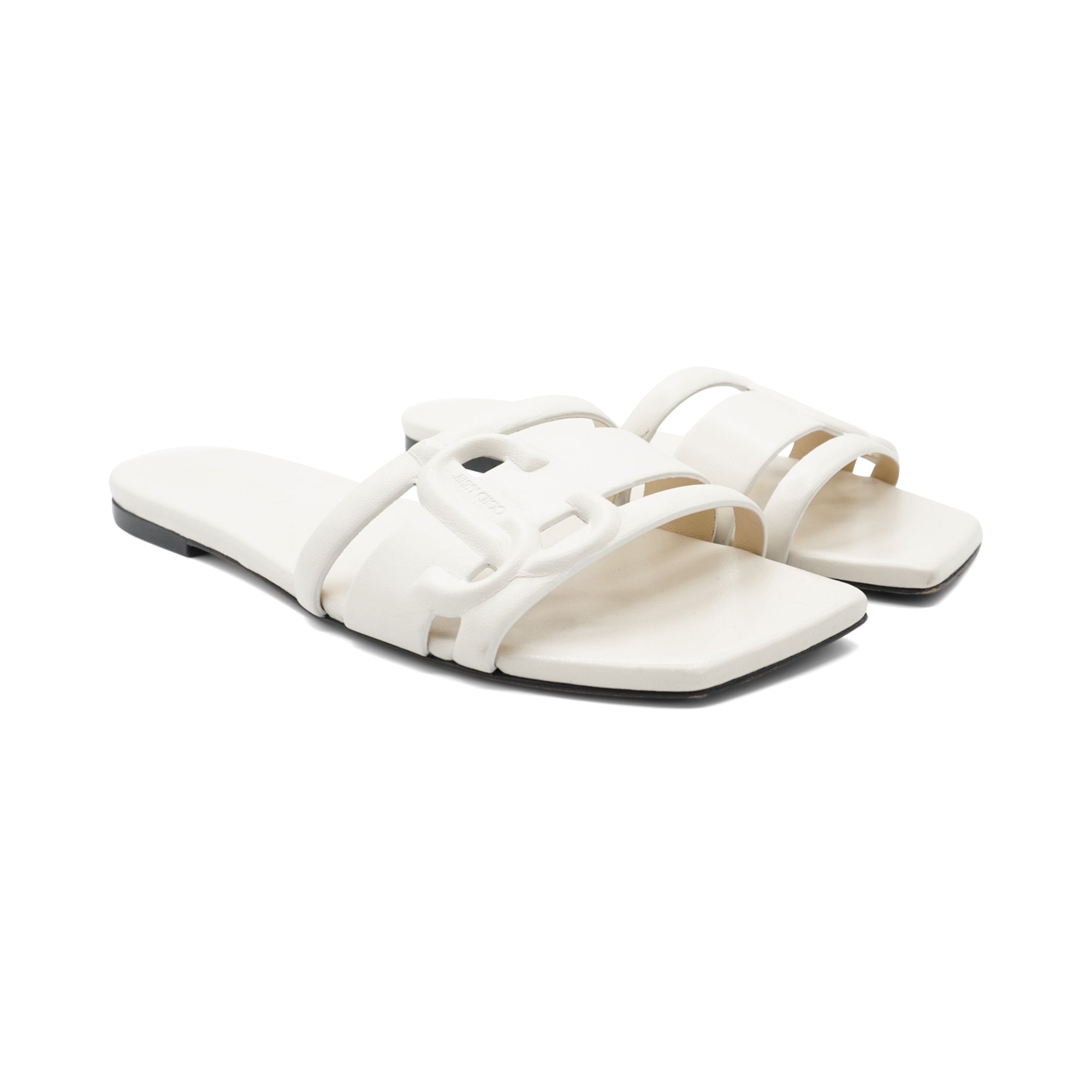 Jimmy Choo 'Laran' slide sandals in white leather with embossed JC logo straps.
