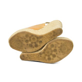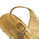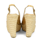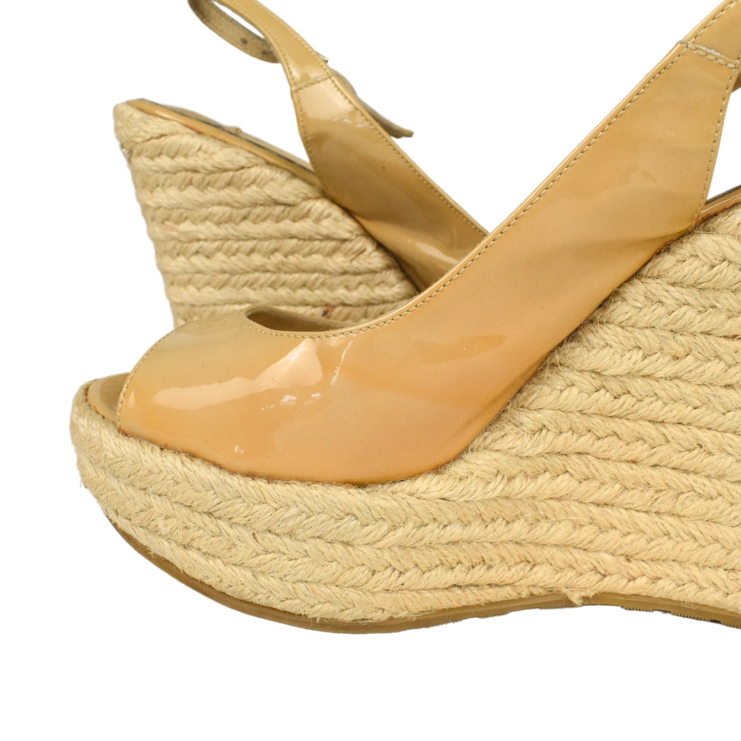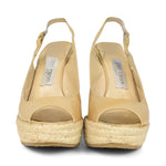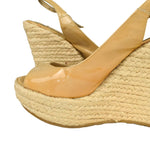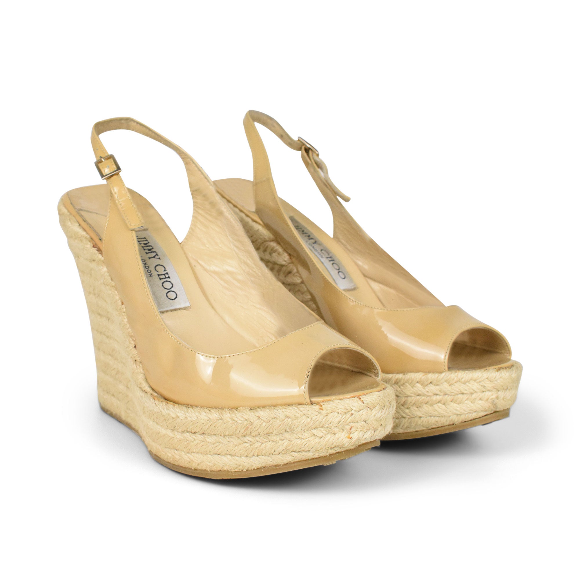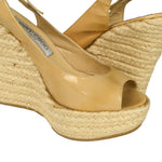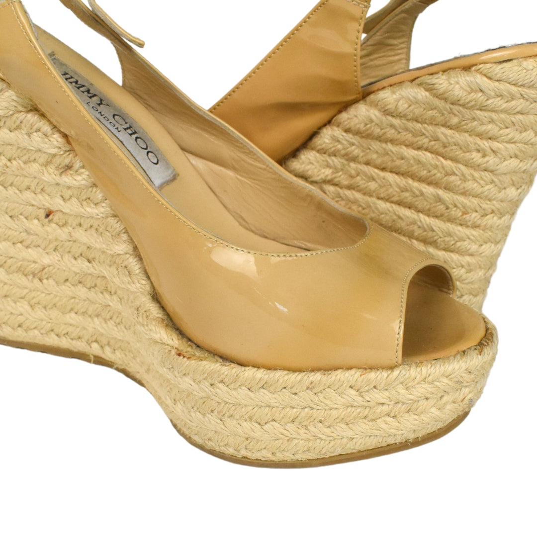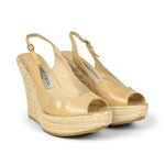 Jimmy Choo slingback heel in beige patent leather with an adjustable buckle strap and a twine wedge heel.