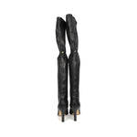 Jimmy Choo over-the-knee heeled boots in black leather with a cinched knee detail. Features almond toes and small gold logo button on the back of the knees.