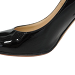 Jimmy Choo almond toe stiletto pumps in black patent leather.
