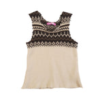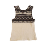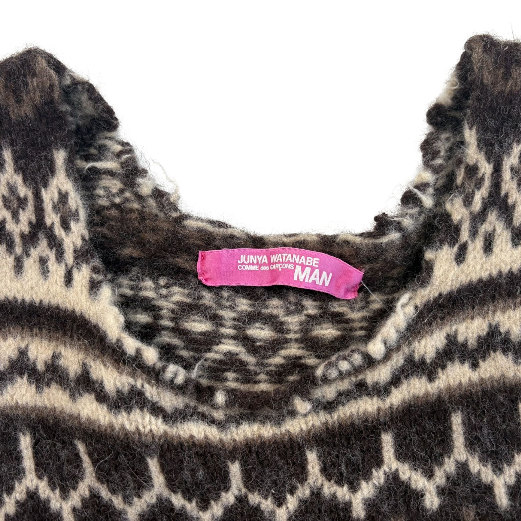 Junya Watanabe Comme Des Garcons MAN 'Reconstructed Knit' tank top in a cream knit wool with a brown and grey nordic print weave around the neckline and a raw hem.